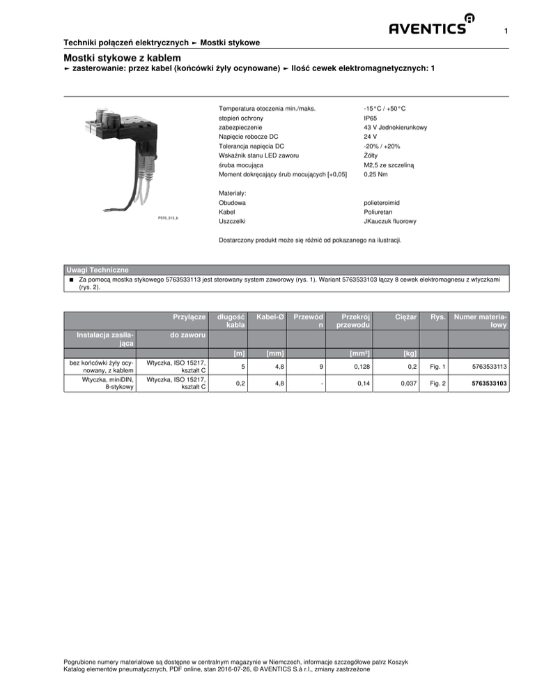 1 Techniki połączeń elektrycznych ► Mostki stykowe Mostki stykowe z kablem ► zasterowanie: przez kabel (końcówki żyły ocynowane) ► Ilość cewek elektromagnetycznych: 1 Temperatura otoczenia min./maks. -15°C / +50°C stopień ochrony IP65 zabezpieczenie 43 V Jednokierunkowy Napięcie robocze DC 24 V Tolerancja napięcia DC -20% / +20% Wskaźnik stanu LED zaworu Żółty śruba mocująca M2,5 ze szczeliną Moment dokręcający śrub mocujących [+0,05] 0,25 Nm Materiały: P576_313_b Obudowa polieteroimid Kabel Poliuretan Uszczelki JKauczuk fluorowy Dostarczony produkt może się różnić od pokazanego na ilustracji. Uwagi Techniczne ■ Za pomocą mostka stykowego 5763533113 jest sterowany system zaworowy (rys. 1). Wariant 5763533103 łączy 8 cewek elektromagnesu z wtyczkami (rys. 2). Przyłącze Instalacja zasilająca do zaworu bez końcówki żyły ocynowany, z kablem Wtyczka, ISO 15217, kształt C Wtyczka, miniDIN, 8-stykowy Wtyczka, ISO 15217, kształt C długość kabla Kabel-Ø [m] [mm] 5 4,8 0,2 4,8 Przewód n Przekrój przewodu Ciężar Rys. Numer materiałowy [mm²] [kg] 9 0,128 0,2 Fig. 1 5763533113 - 0,14 0,037 Fig. 2 5763533103 Pogrubione numery materiałowe są dostępne w centralnym magazynie w Niemczech, informacje szczegółowe patrz Koszyk Katalog elementów pneumatycznych, PDF online, stan 2016-07-26, © AVENTICS S.à r.l., zmiany zastrzeżone 2 Techniki połączeń elektrycznych ► Mostki stykowe Mostki stykowe z kablem ► zasterowanie: przez kabel (końcówki żyły ocynowane) ► Ilość cewek elektromagnetycznych: 1 Fig. 1 8 19,8 4) 8,5 30,2 3a) 18,5 24,4 31,4 3b) 5000 17,9 1 4) 2) 5) 0 2,3 70,1 14 1) 50 Ø4,8 00134924 1) możliwość mocowania tabliczki opisowej 2) dioda zaworu 3a) kołpaka pomocniczego układu uruchamiania ręcznego nie można demontować 3b) kołpaka pomocniczego układu uruchamiania ręcznego, możliwość demontażu 4) uszczelka i śruba zabezpieczone przed zgubieniem 5) Moment dokręcający śrub mocujących: 0,25 Nm + 0,05 Funkcje żył: czarna = elektromagnes 1 brązowa = elektromagnes 2 pomarańczowa = elektromagnes 3 żółta = elektromagnes 4 zielona = elektromagnes 5 fioletowa = elektromagnes 6 biała = elektromagnes 7 różowa = elektromagnes 8 niebieska = masa Pogrubione numery materiałowe są dostępne w centralnym magazynie w Niemczech, informacje szczegółowe patrz Koszyk Katalog elementów pneumatycznych, PDF online, stan 2016-07-26, © AVENTICS S.à r.l., zmiany zastrzeżone 3 Techniki połączeń elektrycznych ► Mostki stykowe Mostki stykowe z kablem ► zasterowanie: przez kabel (końcówki żyły ocynowane) ► Ilość cewek elektromagnetycznych: 1 Fig. 2 00134923 1) możliwość mocowania tabliczki opisowej 2) dioda zaworu 3a) kołpaka pomocniczego układu uruchamiania ręcznego nie można demontować 3b) kołpaka pomocniczego układu uruchamiania ręcznego, możliwość demontażu 4) uszczelka i śruba zabezpieczone przed zgubieniem 5) Moment dokręcający śrub mocujących: 0,25 Nm + 0,05 6) dodatkowa możliwość uziemienia Pogrubione numery materiałowe są dostępne w centralnym magazynie w Niemczech, informacje szczegółowe patrz Koszyk Katalog elementów pneumatycznych, PDF online, stan 2016-07-26, © AVENTICS S.à r.l., zmiany zastrzeżone