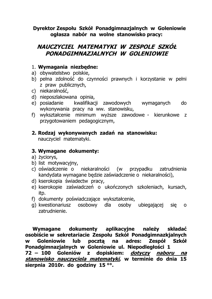 Dyrektor Zespołu Szkół Ponadgimnazjalnych w Goleniowie ogłasza nabór na wolne stanowisko pracy: NAUCZYCIEL MATEMATYKI W ZESPOLE SZKÓŁ PONADGIMNAZJALNYCH W GOLENIOWIE 1. Wymagania niezbędne: a) obywatelstwo polskie, b) pełna zdolność do czynności prawnych i korzystanie w pełni z praw publicznych, c) niekaralność, d) nieposzlakowana opinia, e) posiadanie kwalifikacji zawodowych wymaganych do wykonywania pracy na ww. stanowisku, f) wykształcenie minimum wyższe zawodowe - kierunkowe z przygotowaniem pedagogicznym, 2. Rodzaj wykonywanych zadań na stanowisku: nauczyciel matematyki. 3. a) b) c) d) e) f) g) Wymagane dokumenty: życiorys, list motywacyjny, oświadczenie o niekaralności (w przypadku zatrudnienia kandydata wymagane będzie zaświadczenie o niekaralności), kserokopia świadectw pracy, kserokopie zaświadczeń o ukończonych szkoleniach, kursach, itp. dokumenty poświadczające wykształcenie, kwestionariusz osobowy dla osoby ubiegającej się o zatrudnienie. Wymagane dokumenty aplikacyjne należy składać osobiście w sekretariacie Zespołu Szkół Ponadgimnazkjalnych w Goleniowie lub pocztą na adres: Zespół Szkół Ponadgimnazjalnych w Goleniowie ul. Niepodległości 1 72 – 100 Goleniów z dopiskiem: dotyczy naboru na stanowisko nauczyciela matematyki, w terminie do dnia 15 sierpnia 2010r. do godziny 15 °°.