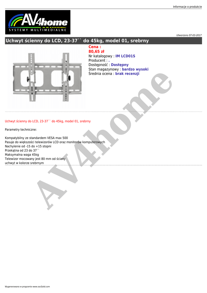 Informacje o produkcie Utworzono 07-03-2017 Uchwyt ścienny do LCD, 23-37`` do 45kg, model 01, srebrny Cena : 80,65 zł om e Nr katalogowy : IM LCD01S Producent : . Dostępność : Dostępny Stan magazynowy : bardzo wysoki Średnia ocena : brak recenzji Uchwyt ścienny do LCD, 23-37`` do 45kg, model 01, srebrny Parametry techniczne: AV 4h Kompatybilny ze standardem VESA max 500 Pasuje do większości telewizorów LCD oraz monitorów komputerowych Nachylenie od -15 do +15 stopni Przekątna od 23 do 37`` Maksymalna waga 45kg Telewizor mocowany jest 80 mm od ściany uchwyt w kolorze srebrnym Wygenerowano w programie www.oscGold.com