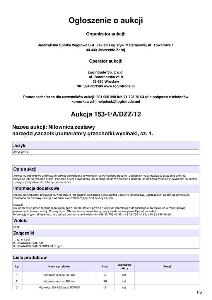Ogłoszenie o aukcji Organizator aukcji: Jastrzębska Spółka Węglowa S.A. Zakład Logistyki Materiałowej ul. Towarowa 1 44-330 Jastrzębie-Zdrój Operator aukcji: Logintrade Sp. z o.o. ul. Braniborska 2/10 53-680 Wrocław NIP:8942953589 www.logintrade.pl Pomoc techniczna dla uczestników aukcji: 801 080 398 lub 71 723 78 04 (dla połączeń z telefonów komórkowych) [email protected] Aukcja 153-1/A/DZZ/12 Nazwa aukcji: Nitownica,zestawy narzędzi,szczotki,numeratory,grzechotki,wycinaki, cz. 1. Języki Język polski Opis aukcji Aukcja multiobiektowa zniżkowa to aukcja prowadzona równolegle na wymienione pozycje. Uczestnicy mają możliwość składania ofert na wszystkie lub na wybraną z nich. Podczas aukcji prowadzony jest ranking na każdy produkt z osobna, co umożliwi wyłonienie zwycięzcy na każdej z pozycji (oczywiście może to być jedna firma). Informacje dodatkowe Aukcja elektroniczna prowadzona w oparciu o "Regulamin udzielania przez Zakład Logistyki Materiałowej Jastrzębskiej Spółki Węglowej S.A. zamówień na dostawy i usługi o wartości nieprzekraczającej 500 tysięcy złotych Uwaga! Na jeden dzień przed terminem aukcji do godz. 13:00 Oferent powinien uzyskać informację o dopuszczeniu do aukcji lub o ewentualnym przesunięciu terminu aukcji. O powyższym Oferenci informowani będą drogą elektroniczną przez Operatora aukcji. Informację w tym zakresie można uzyskać pod numerami telefonów +48 32 756 40 95, +48 32 756 40 62, +48 32 756 40 66. Waluta PLN Załączniki 1. zal nr1.pdf 2. OŚWIADCZENIE.pdf 3. OŚWIADCZENIE O ODPADACH.pdf Lista produktów Lp. Nazwa produktu Ilość Jednostka miary 1. Nitownica ręczna 250mm 5 szt. 2. Nitownica ręczna 280mm 26 szt. 3. Nitownica J60 ASC prod.NOVUS 2 szt. Uwagi 1/6 4. Nitownica MR-33 5 szt. 5. Zestaw narzędzi monterskich 1-791-45-006 KUZNIA 9 komplet 6. Zestaw narzędzi monterskich 1-791-30-004 KUZNIA 9 komplet 7. Zestaw narzędzi SUPERLOCK 50 elem.kat. 9110650 KS TOOLS 2 komplet 8. Zestaw narzędzi kat.979000 KNIPEX 5 komplet 9. Zestaw narzędzi 90-elementow +walizka alum.WILTON POLYMECH kat.999500 8 komplet 10. Torba narzędziowa dla elektryków 12-czesc. Kat.9300-002 WIHA 3 komplet 11. Szczotka ręczna do rdzy 5-rzędowa 6600 szt. 12. Szczotka węglowa GWS11-125-CIE kat. 1.607.014.172 BOSCH 20 szt. 13. Szczotka szlifierki GWS 21-230H BOSCH 5 szt. 14. Szczotka szlifierki GWS 14-125CIE BOSCH 25 szt. 15. Szczotka garnkowa fi 65 kat.2608622061 BOSCH 79 szt. 16. Szczotka tarczowa do szlifierki fi 200 otwór 32 25 szt. 17. Szczotka czołowa Fi-60 M14 30 szt. 18. Szczotka czołowa Fi-80 M14 30 szt. 19. Szczotka garnkowa splatana fi 65 80 szt. 20. Szczotka garnkowa fi 70 kat.1608614020 BOSCH 45 szt. 21. Szczotka garnkowa fi 75 kat.1608622029 BOSCH 90 szt. 22. Szczotka garnkowa fi 100 Kat.1608614011 BOSCH 20 szt. 23. Szczotka garnkowa fi 100 Kat.1608614002 BOSCH 30 szt. 24. Szczotka trzpieniowa garnkowa kat.1609200270 BOSCH 30 szt. 25. Szczotka tarczowa fi 115 Kat.2608622059 BOSCH 24 szt. 26. Szczotka do zwrotnic 190x29x40 3-rzed.do fi-0,5-0,6 WCP 150 40 szt. 27. Szczotka druciana rotacyjna fi 65 5 szt. 28. Szczotka druciana rotacyjna fi 80 5 szt. 29. Szczotka druciana rotacyjna fi 100 35 szt. 30. Szczotka druciana rotacyjna fi 150x20 12 szt. 31. Szczotka druciana rotacyjna fi 200 135 szt. 32. Szczotka druciana rotacyjna fi 250 10 szt. 33. Szczotka rotacyjna doczołowa splatana fi70 z nakrętką M14x2 10 szt. 34. Szczotka rotacyjna tarcz.kątowa splatana fi120 z nakr.M14x2 20 szt. 35. Szczotka rotacyjna tarcz.kątowa splatana fi150 z nakr.M14x2 10 szt. 36. Szczotka druciana doczołowa fi65 z nakrętką M14 80 szt. 37. Szczotka druciana doczołowa fi80 70 szt. 38. Szczotka druciana doczołowa fi100 z nakrętką M14 80 szt. 39. Szczotka stalowa fi 25x100 60 szt. 40. Numerator cyfrowy 0-9 wys.3mm 5 szt. 41. Numerator cyfrowy 0-9 wys.6mm 20 szt. 42. Numerator cyfrowy 0-9 wys.8mm 15 szt. 2/6 43. Numerator cyfrowy 0-9 wys.10mm 15 szt. 44. Numerator cyfrowy 0-9 wys.12mm 9 szt. 45. Numerator literowy A-Z wys. 6mm 10 szt. 46. Numerator literowy A-Z wys. 8mm 12 szt. 47. Numerator literowy A-Z wys. 10mm 10 szt. 48. Komplet wycinaków do skóry 8-30mm 10 komplet 49. Komplet wycinaków do skóry 3-20mm 5 komplet 50. Wycinaki do skóry M4 100 szt. Kryteria oceny Lp. Nazwa kryterium 1. Cena Reguły aukcji Aukcja multiobiektowa. Aukcja otwarta Aukcja zniżkowa Ilość dogrywek: 9999 Czas dogrywki: 5 minut Nitownica ręczna 250mm Minimalna zmiana ceny: 0,14 PLN Nitownica ręczna 280mm Minimalna zmiana ceny: 0,16 PLN Nitownica J60 ASC prod.NOVUS Minimalna zmiana ceny: 0,43 PLN Nitownica MR-33 Minimalna zmiana ceny: 0,29 PLN Zestaw narzędzi monterskich 1-791-45-006 KUZNIA Minimalna zmiana ceny: 2,10 PLN Zestaw narzędzi monterskich 1-791-30-004 KUZNIA Minimalna zmiana ceny: 5,00 PLN Zestaw narzędzi SUPERLOCK 50 elem.kat. 9110650 KS TOOLS Minimalna zmiana ceny: 3,50 PLN Zestaw narzędzi kat.979000 KNIPEX Minimalna zmiana ceny: 3,30 PLN Zestaw narzędzi 90-elementow +walizka alum.WILTON POLYMECH kat.999500 Minimalna zmiana ceny: 3,11 PLN Torba narzędziowa dla elektryków 12-czesc. Kat.9300-002 WIHA Minimalna zmiana ceny: 2,28 PLN Szczotka ręczna do rdzy 5-rzędowa Minimalna zmiana ceny: 0,01 PLN Szczotka węglowa GWS11-125-CIE kat. 1.607.014.172 BOSCH Minimalna zmiana ceny: 0,13 PLN Szczotka szlifierki GWS 21-230H BOSCH Minimalna zmiana ceny: 0,15 PLN Szczotka szlifierki GWS 14-125CIE BOSCH Minimalna zmiana ceny: 0,13 PLN Szczotka garnkowa fi 65 kat.2608622061 BOSCH Minimalna zmiana ceny: 0,19 PLN Szczotka tarczowa do szlifierki fi 200 otwór 32 Minimalna zmiana ceny: 0,19 PLN Szczotka czołowa Fi-60 M14 Minimalna zmiana ceny: 0,07 PLN Szczotka czołowa Fi-80 M14 Minimalna zmiana ceny: 0,10 PLN Szczotka garnkowa splatana fi 65 Minimalna zmiana ceny: 0,15 PLN Szczotka garnkowa fi 70 kat.1608614020 BOSCH Minimalna zmiana ceny: 0,15 PLN Szczotka garnkowa fi 75 kat.1608622029 BOSCH Minimalna zmiana ceny: 0,27 PLN Szczotka garnkowa fi 
