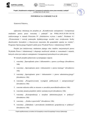 Projekt „Kształtowanie umiejętności i kompetencji studentów prawa przez warsztaty i praktyki” nr POKL.04.01.01-00-116/14 INFORMACJA O REKRUTACJI Szanowni Państwo, ogłaszamy rekrutację do projektu pt. „Kształtowanie umiejętności i kompetencji studentów prawa przez warsztaty i praktyki” (nr POKL.04.01.01.00-116/14) realizowanego w ramach Priorytetu IV „Szkolnictwo wyższe i nauka”, Działanie 4.1 „Wzmocnienie i rozwój potencjału dydaktycznego uczelni oraz zwiększenie liczby absolwentów kierunków o kluczowym znaczeniu dla gospodarki opartej na wiedzy”, Programu Operacyjnego Kapitał Ludzki przez Wydział Prawa i Administracji UKSW. Projekt jest dedykowany studentom piątego roku studiów stacjonarnych prawa Wydziału Prawa i Administracji i obejmuje możliwość udziału w warsztatach i stażach, których celem jest nabycie umiejętności i kompetencji potrzebnych na rynku pracy. W ramach projektu planowane są następujące zajęcia: 1. warsztaty „Sporządzanie pism i dokumentów z prawa cywilnego (dwudniowe 16h) 2. warsztaty: „Sporządzanie pism i dokumentów z prawa karnego” (dwudniowe 16h) 3. warsztaty „Sporządzanie pism i dokumentów z prawa administracyjnego” (dwudniowe 16h) 4. warsztaty „Przygotowywanie wystąpień publicznych i autoprezentacja” (dwudniowe 16h) 5. warsztat radzenia sobie ze stresem w zawodzie prawnika(dwudniowe 16h) 6. warsztaty pisania projektów aktów normatywnych (dwudniowe 16h) 7. warsztaty „Korespondencja z urzędem administracyjnym w praktyce” (dwudniowe 16h) 8. warsztaty – „Sztuka wypowiedzi” (dwudniowe 16h) 9. warsztaty: „Zakładanie i prowadzenie działalności gospodarczej w praktyce” (dwudniowe 16h) Projekt współfinansowany ze środków Unii Europejskiej w ramach Europejskiego Funduszu Społecznego Projekt „Kształtowanie umiejętności i kompetencji studentów prawa przez warsztaty i praktyki” nr POKL.04.01.01-00-116/14 10. warsztaty Legal English (w trybie co tygodniowym od lutego do czerwca łącznie 30h) Ponadto w okresie od czerwca do września zostaną zrealizowane płatne staże w wymiarze 2 miesięcy po 80 h. Za uczestnictwo w co najmniej 4 warsztatach można uzyskać zaliczenie przedmiotu „Warsztaty praktyczne” za 4 pkt ECTS. Uczestnik danego warsztatu/stażu uzyska zaświadczenie o jego odbyciu. Zasady rekrutacji Oferta warsztatów i staży jest skierowana wyłącznie do studentów V roku studiów stacjonarnych prawa WPiA UKSW. Osoby chętne do udziału w warsztatach, stażach proszone są o wysłanie formularza zgłoszeniowego, będącego częścią tego ogłoszenia na adres [email protected] do 8 lutego br. Na podstawie przesłanych zgłoszeń zostanie stworzona lista rankingowa osób zakwalifikowanych na dane warsztaty i staż, oparta o kryterium średniej z 4 lat studiów. O wyniku rekrutacji osoby zakwalifikowane zostaną poinformowane poprzez email. W wypadku braku odpowiedniej liczby kandydatów 10 lutego zostanie ogłoszona rekrutacja uzupełniająca. Wnioski studentów będą przyjmowane do 17 lutego. Kierownik projektu Dr Aleksandra Syryt Projekt współfinansowany ze środków Unii Europejskiej w ramach Europejskiego Funduszu Społecznego Projekt „Kształtowanie umiejętności i kompetencji studentów prawa przez warsztaty i praktyki” nr POKL.04.01.01-00-116/14 FORMULARZ ZGŁOSZENIOWY NA WARSZTATY I STAŻ Imię i nazwisko Nr albumu Średnia z 4 lat studiów Rok studiów Adres email Nr telefonu Lp. 1. 2. 3. 4. 5. 6. 7. 8. 9. 10. 11. Nazwa warsztatu Proszę zaznaczyć warsztaty, w których Państwo chcą uczestniczyć warsztaty „Sporządzanie pism i dokumentów z prawa cywilnego (dwudniowe 16h) warsztaty: „Sporządzanie pism i dokumentów z prawa karnego” (dwudniowe 16h) warsztaty „Sporządzanie pism i dokumentów z prawa administracyjnego” (dwudniowe 16h) warsztaty „Przygotowywanie wystąpień publicznych i autoprezentacja” (dwudniowe 16h) warsztat radzenia sobie ze stresem w zawodzie prawnika(dwudniowe 16h) warsztaty pisania projektów aktów normatywnych (dwudniowe 16h) warsztaty „Korespondencja z urzędem administracyjnym w praktyce” (dwudniowe 16h) warsztaty – „Sztuka wypowiedzi” (dwudniowe 16h) warsztaty: „Zakładanie i prowadzenie działalności gospodarczej w praktyce” (dwudniowe 16h) warsztaty Legal English (w trybie co tygodniowym od lutego do czerwca łącznie 30h) płatny staż w wymiarze 2 miesięcy po 80 h Wyrażam zgodę na przetwarzanie moich danych w związku z realizacją procesu rekrutacyjnego do projektu „Kształtowanie umiejętności i kompetencji studentów prawa przez warsztaty i praktyki” (nr POKL.04.01.01.00-116/14). Projekt współfinansowany ze środków Unii Europejskiej w ramach Europejskiego Funduszu Społecznego