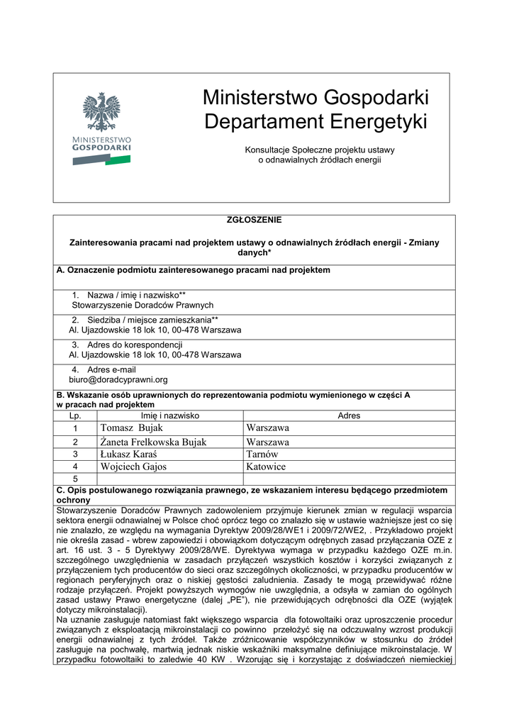 Ministerstwo Gospodarki Departament Energetyki Konsultacje Społeczne projektu ustawy o odnawialnych źródłach energii ZGŁOSZENIE Zainteresowania pracami nad projektem ustawy o odnawialnych źródłach energii - Zmiany danych* A. Oznaczenie podmiotu zainteresowanego pracami nad projektem 1. Nazwa / imię i nazwisko** Stowarzyszenie Doradców Prawnych 2. Siedziba / miejsce zamieszkania** Al. Ujazdowskie 18 lok 10, 00-478 Warszawa 3. Adres do korespondencji Al. Ujazdowskie 18 lok 10, 00-478 Warszawa 4. Adres e-mail [email protected] B. Wskazanie osób uprawnionych do reprezentowania podmiotu wymienionego w części A w pracach nad projektem Lp. 1 Imię i nazwisko Tomasz Bujak Żaneta Frelkowska Bujak Łukasz Karaś Wojciech Gajos Adres Warszawa Warszawa Tarnów Katowice 2 3 4 5 C. Opis postulowanego rozwiązania prawnego, ze wskazaniem interesu będącego przedmiotem ochrony Stowarzyszenie Doradców Prawnych zadowoleniem przyjmuje kierunek zmian w regulacji wsparcia sektora energii odnawialnej w Polsce choć oprócz tego co znalazło się w ustawie ważniejsze jest co się nie znalazło, ze względu na wymagania Dyrektyw 2009/28/WE1 i 2009/72/WE2, . Przykładowo projekt nie określa zasad - wbrew zapowiedzi i obowiązkom dotyczącym odrębnych zasad przyłączania OZE z art. 16 ust. 3 - 5 Dyrektywy 2009/28/WE. Dyrektywa wymaga w przypadku każdego OZE m.in. szczególnego uwzględnienia w zasadach przyłączeń wszystkich kosztów i korzyści związanych z przyłączeniem tych producentów do sieci oraz szczególnych okoliczności, w przypadku producentów w regionach peryferyjnych oraz o niskiej gęstości zaludnienia. Zasady te mogą przewidywać różne rodzaje przyłączeń. Projekt powyższych wymogów nie uwzględnia, a odsyła w zamian do ogólnych zasad ustawy Prawo energetyczne (dalej „PE”), nie przewidujących odrębności dla OZE (wyjątek dotyczy mikroinstalacji). Na uznanie zasługuje natomiast fakt większego wsparcia dla fotowoltaiki oraz uproszczenie procedur związanych z eksploatacją mikroinstalacji co powinno przełożyć się na odczuwalny wzrost produkcji energii odnawialnej z tych źródeł. Także zróżnicowanie współczynników w stosunku do źródeł zasługuje na pochwałę, martwią jednak niskie wskaźniki maksymalne definiujące mikroinstalacje. W przypadku fotowoltaiki to zaledwie 40 KW . Wzorując się i korzystając z doświadczeń niemieckiej ustawy o OZE należy podnieść moc mikroinstalacji do 100 kW, moc 40 kW jest zdecydowanie za mała dla małych przedsiębiorców. Współczynniki to kolejne kluczowe elementy nowej systemu mają być współczynniki korekcyjne dla każdej technologii OZE. Koniecznym jest, aby współczynniki zostały określone bezpośrednio w Ustawie OZE a nie w często zmieniających się rozporządzeniach. Przepis ma duże znaczenie dla wytwórców energii odnawialnej i kredytujących ją banków. Ministerstwo zapewniało iż wysokość przyznanych Przedsiębiorcy na początku inwestycji współczynników nie będzie już dla niego zmieniana, pomimo, że Minister Gospodarki co trzy lata będzie ustanawiał współczynniki na kolejne pięć lat dla nowszych instalacji. Brzmienie przepisów sugeruje jednak, że wytwórca zielonej energii będzie otrzymywał różną liczbę certyfikatów, w zależności od tego, jakie aktualnie obowiązują współczynniki. Wartość współczynnika korekcyjnego zdecyduje więc o tym, czy inwestycja OZE będzie opłacalna (albo bardziej lub mniej opłacalna). W ocenie Stowarzyszenia Doradców Prawnych ustalanie wartości współczynnika rozporządzeniem zgodnie z art. 100 Projektu - a nie ustawą, budzi poważne wątpliwości natury konstytucyjnej. Tego rodzaju rozwiązania – przekładające się na wysokość stawek podatkowych - zostały w przeszłości skutecznie zakwestionowane przez Trybunał Konstytucyjny. W ocenie Stowarzyszenia Doradców Prawnych mikroinstalacje powinny być traktowane jednakowo niezależnie od tego czy produkcja energii w tych mikroinstalacjach trafia do sieci w mniejszym czy w większym stopniu. Takie rozwiązania stosują już inne kraje i warto korzystać z ich doświadczenia. Brak jest uzasadnienia dla traktowania wytwarzania energii w mikroinstalacji jako działalności gospodarczej i zaproponowane w ustawie proporcje wpłyną negatywnie na wdrażanie mikroinstalacji , także z powodu kosztów stałych. Uruchomienie działalności gospodarczej bowiem, wiąże się z koniecznością ponoszenia wysokich kosztów związanych z jej prowadzeniem. Dochody z mikroinstalacji fotowoltaicznych nie pokryją wysokich stałych kosztów, w szczególności uwzględniając konieczność amortyzacji zakupionych instalacji fotowoltaicznych. W związku z tym proponowane przepisy różnicujące status mikroinstalacji na takie, które stanowią działalność gospodarczą (sprzedające powyżej 30% wytwarzanej energii do sieci) i takie które jej nie stanowią (sprzedające poniżej 30% wytwarzanej energii do sieci) nie ma merytorycznego uzasadnienia i może spowodować skutek polegający na ograniczeniu mocy i czasowym wyłączaniu instalacji. W ten sposób energia, która mogłaby trafić do krajowego systemu elektroenergetycznego w ramach zainstalowanej już infrastruktury zostanie utracona. Stowarzyszenie Doradców Prawnych postuluje uproszczenie przepisów dotyczących mikroinstalacji poprzez usunięcie różnicowania statusu produkcji energii z mikroinstalacji w zależności od skali wprowadzania energii z mikroinstalacji do sieci. Wszystkie mikroinstalacje powinny być traktowane jednakowo. Podmiot wytwarzający energię w mikroinstalacji nie powinien być traktowany jak przedsiębiorca, także w rozumieniu ustaw podatkowych. Nie ma potrzeby komplikowania systemu poprzez odrębny, choćby uproszczony, mechanizm przyznawania świadectw pochodzenia podmiotom wytwarzającym energię w mikroinstalacjach, prowadzenia ich rejestru i wprowadzania wymogu jakiegokolwiek raportowani