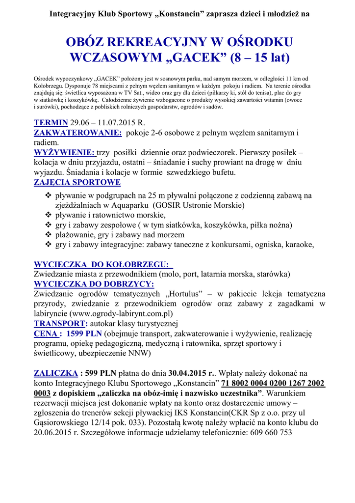 Integracyjny Klub Sportowy „Konstancin” zaprasza dzieci i młodzież na OBÓZ REKREACYJNY W OŚRODKU WCZASOWYM „GACEK” (8 – 15 lat) Ośrodek wypoczynkowy „GACEK” położony jest w sosnowym parku, nad samym morzem, w odległości 11 km od Kołobrzegu. Dysponuje 78 miejscami z pełnym węzłem sanitarnym w każdym pokoju i radiem. Na terenie ośrodka znajdują się: świetlica wyposażona w TV Sat., wideo oraz gry dla dzieci (piłkarzy ki, stół do tenisa), plac do gry w siatkówkę i koszykówkę. Całodzienne żywienie wzbogacone o produkty wysokiej zawartości witamin (owoce i surówki), pochodzące z pobliskich rolniczych gospodarstw, ogrodów i sadów. TERMIN 29.06 – 11.07.2015 R. ZAKWATEROWANIE: pokoje 2-6 osobowe z pełnym węzłem sanitarnym i radiem. WYŻYWIENIE: trzy posiłki dziennie oraz podwieczorek. Pierwszy posiłek – kolacja w dniu przyjazdu, ostatni – śniadanie i suchy prowiant na drogę w dniu wyjazdu. Śniadania i kolacje w formie szwedzkiego bufetu. ZAJĘCIA SPORTOWE pływanie w podgrupach na 25 m pływalni połączone z codzienną zabawą na zjeżdżalniach w Aquaparku (GOSIR Ustronie Morskie) pływanie i ratownictwo morskie, gry i zabawy zespołowe ( w tym siatkówka, koszykówka, piłka nożna) plażowanie, gry i zabawy nad morzem gry i zabawy integracyjne: zabawy taneczne z konkursami, ogniska, karaoke, WYCIECZKA DO KOŁOBRZEGU: Zwiedzanie miasta z przewodnikiem (molo, port, latarnia morska, starówka) WYCIECZKA DO DOBRZYCY: Zwiedzanie ogrodów tematycznych „Hortulus” – w pakiecie lekcja tematyczna przyrody, zwiedzanie z przewodnikiem ogrodów oraz zabawy z zagadkami w labiryncie (www.ogrody-labirynt.com.pl) TRANSPORT: autokar klasy turystycznej CENA : 1599 PLN (obejmuje transport, zakwaterowanie i wyżywienie, realizację programu, opiekę pedagogiczną, medyczną i ratownika, sprzęt sportowy i świetlicowy, ubezpieczenie NNW) ZALICZKA : 599 PLN płatna do dnia 30.04.2015 r.. Wpłaty należy dokonać na konto Integracyjnego Klubu Sportowego „Konstancin” 71 8002 0004 0200 1267 2002 0003 z dopiskiem „zaliczka na obóz-imię i nazwisko uczestnika”. Warunkiem rezerwacji miejsca jest dokonanie wpłaty na konto oraz dostarczenie umowy – zgłoszenia do trenerów sekcji pływackiej IKS Konstancin(CKR Sp z o.o. przy ul Gąsiorowskiego 12/14 pok. 033). Pozostałą kwotę należy wpłacić na konto klubu do 20.06.2015 r. Szczegółowe informacje udzielamy telefonicznie: 609 660 753
