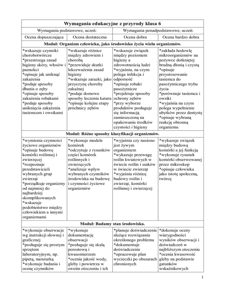 Wymagania edukacyjne z przyrody klasa 6 Wymagania podstawowe, uczeń: Ocena dopuszczająca Ocena dostateczna Wymagania ponadpodstawowe, uczeń: Ocena dobra Ocena bardzo dobra Moduł: Organizm człowieka, jako środowisko życia wielu organizmów. *wskazuje czynniki chorobotwórcze *przestrzega zasad higieny skóry, włosów i paznokci *opisuje jak uniknąć zakażenia *podaje sposoby dbania o zęby *opisuje sposoby zakażenia robakami *podaje sposoby uniknięcia zakażenia tasiemcem i owsikami *wskazuje różnice między zdrowiem i chorobą *przewiduje skutki lekceważenia zasad higieny *wskazuje zarazki, jako przyczynę choroby zakaźnej *podaje domowe sposoby leczenia kataru *opisuje kolejne etapy próchnicy zębów *wskazuje związek między poziomem higieny a zdrowotnością ludzi *wyjaśnia, na czym polega infekcja i odporność *opisuje robaki pasożytnicze *projektuje sposoby ochrony zębów *przy wyborze produktów posługuje się informacją zamieszczoną na opakowaniu środków czystości i higieny *zakłada hodowlę mikroorganizmów na pożywce dotkniętej brudną dłonią i czystą *opisuje przystosowanie tasiemca do pasożytniczego trybu życia *porównuje tasiemca i owsiki *wyjaśnia na czym polega wypełnienie ubytków przez dentystę *opisuje wybraną reakcję obronną organizmu Moduł: Różne sposoby klasyfikacji organizmów. *wymienia czynności życiowe organizmów *opisuje budowę komórki roślinnej i zwierzęcej *rozpoznaje przedstawicieli wybranych grup zwierząt *porządkuje organizmy od najmniej do najbardziej skomplikowanych *wskazuje podobieństwo między człowiekiem a innymi organizmami *wykonuje modele komórek *odczytuje z rysunków części komórek roślinnych i zwierzęcych *analizuje wpływ wybranych czynników środowiska na budowę i czynności życiowe organizmów *wyjaśnia czy nasiono jest żywym organizmem *wykazuje przewagę roślin kwiatowych w świecie roślin i ssaków w świecie zwierząt *wyjaśnia różnicę budowy roślin i zwierząt, komórki roślinnej i zwierzęcej *wykazuje związek między budową komórki a jej funkcją *wykonuje rysunek komórki obserwowanej przez mikroskop *opisuje człowieka jako istotę społeczną, twórcę Moduł: Badamy stan środowiska. *wykonuje obserwacje wg instrukcji słownej i graficznej *posługuje się prostym sprzętem laboratoryjnym, np. pipetą, menzurką *wykonuje badania i ocenę czynników *wykonuje dokumentację obserwacji *posługuje się skalą porostową i kwasomierzem *ocenia jakość wody, gleby i powietrza w swoim otoczeniu i ich *planuje doświadczenie służące rozwiązaniu określonego problemu *dokumentuje doświadczenie *opracowuje plan wycieczki po obszarach chronionych *dokonuje oceny wiarygodności wyników obserwacji i doświadczeń w najbliższym otoczeniu *ocenia kwasowość gleby na podstawie gatunków wskaźnikowych 1 środowiska w otoczeniu szkoły wpływ na zdrowie ludzi *prowadzi monitoring wybranych cech środowiska przyrodniczego *opracowuje folder zachęcający do zwiedzania wybranego terenu chronionego. Moduł: Wybrane krajobrazy Ziemi. *opisuje czynniki rzeźbotwórcze powierzchni Ziemi *podaje przykłady wpływu działalności człowieka na składniki krajobrazu *rozpoznaje typy krajobrazu na rycinie, zdjęciu *odróżnia krajobrazy naturalne od przekształconych *wskazuje na mapie hipsometrycznej kontynenty i oceany *odczytuje wykresy przebiegu temperatury powietrza i sum opadów *posługuje się legendą do odczytania mapy krajobrazowej *podaje przykłady przystosowania organizmów do warunków życia *wykonuje wykres liniowy, diagram słupkowy do wybranych zjawisk geograficznych *opisuje cechy krajobrazu posługując się mapą krajobrazową *odróżnia krajobrazy strefowe i astrefowe *rozpoznaje i umiejscawia rośliny i zwierzęta w krajobrazach *odczytuje formy powierzchni na mapach hipsometrycznych kontynentów i wskazuje zasięgi krajobrazów *wskazuje czynniki wpływające na stan środowiska i życie ludzi *dostrzega czynniki zmieniające krajobrazy Ziemi *prognozuje zmiany w krajobrazie wywołane złą gospodarka człowieka *dokonuje obliczeń amplitudy temperatury powietrza *odnajduje w bibliotece źródła informacji na zadany temat *charakteryzuje cechy krajobrazu *porównuje wielkość powierzchni lądów i oceanów *odczytuje z wykresu długość klimatycznych pór roku *wyjaśnia działanie czynników kształtujących formy powierzchni Ziemi *wyjaśnia zależności pokarmowe w krajobrazach strefowych *interpretuje dane z wykresu lub diagramu *określa prawdopodobne stany pogody w różnych miejscach na Ziemi w tym samym czasie *odczytuje ze schematu zależności pokarmowe w krajobrazach *wykorzystuje inne źródła informacji do poszerzenia informacji na dany temat *opisuje cechy krajobrazu na podstawie mapy hipsometrycznej i krajobrazowej *posługuje się rysunkiem, schematem do wyjaśnienia zjawisk geograficznych Moduł: Bodźce i ich odbieranie. *wskazuje przedmioty i urządzenia, w których wykorzystano zjawisko odbicia światła *opisuje zjawisko załamania światła *wymienia warunki powstawania echa *opisuje drogę fali *podaje w otoczeniu przykłady obicia, rozproszenia i załamania światła *wykazuje na konkretnym przykładzie zjawisko złudzenia optycznego *wykonuje pokaz *wyjaśnia w jakich warunkach zachodzi załamanie światła *opisuje echolokację u zwierząt *posługuje się dźwiękiem i światłem do przekazywania informacji *demonstruje zjawisko odbicia i załamania światła *wymienia cechy obrazu w zwierciadle płaskim *wykazuje doświadczalnie, że wysokość dźwięku 2 dźwiękowej w uchu *wymienia narządy zmysłów różnych wysokości i głośności dźwięków *demonstruje odbicie dźwięku *wyjaśnia na czym polega widzenie i słyszenie i jak chronić te narządy zależy od długości i grubości struny *wykazuje, że mózg jest narządem, który rozpoznaje i interpretuje obrazy i dźwięki Moduł : Od cząsteczki do Uk