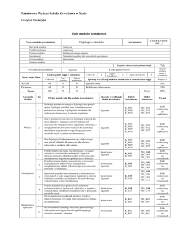 Państwowa WyŜsza Szkoła Zawodowa w Nysie Instytut Dietetyki Opis modułu kształcenia Fizjologia człowieka Nazwa modułu (przedmiotu) Kierunek studiów Profil kształcenia Poziom studiów Specjalność Forma studiów Semestr studiów S-DIET-I-P-DIETFIZC _II Kod podmiotu Dietetyka praktyczny Studia pierwszego stopnia Przedmiot wspólny dla wszystkich specjalności Stacjonarne II Zajęcia z zakresu nauk podstawowych Egzamin Tryb zaliczenia przedmiotu Liczba godzin zajęć w semestrze Formy zajęć i inne Wykład Ćwiczenia Razem: Kategoria efektów Lp . 1. Wiedza 2. 3. 1. 2 Umiejętności 3 4 1. Kompetencje społeczne 2. Liczba punktów ECTS Całkowita 4 Zajęcia kontaktowe Całkowita Pracy studenta Zajęcia kontaktowe 60 30 30 Egzamin ustny 60 30 30 Kolokwium zaliczeniowe. 120 60 60 2 Zajęcia praktyczne 2 Sposoby weryfikacji efektów kształcenia w ramach form zajęć Efekty kształcenia dla modułu (przedmiotu) Definiuje podstawowe pojęcie fizjologii oraz potrafi opisać fizjologię komórki, oraz scharakteryzować podstawowe procesy fizjologiczne niezbędne dla zachowania homeostazy i wzrostu organizmu. Zna w podstawowym zakresie fizjologię waŜnych dla Ŝycia układów i narządów, potrafi objaśnić ich znaczenie dla funkcjonowania organizmu człowieka, z uwzględnieniem procesów waŜnych dla asymilacji składników poŜywienia oraz przebiegu procesów metabolicznych i zachowania homeostazy. Zna fizjologię układu pokarmowego i dokrewnego oraz potrafi objaśnić ich znaczenie dla zdrowia człowieka w aspekcie odŜywiania. Potrafi integrować znane mu informacje i wyciągać wnioski w celu formułowania opinii i logicznie dobierać elementy zdobytej wiedzy teoretycznej aby zinterpretować zagadnienia praktyczne w dietetyce. Potrafi powiązać budowę anatomiczną z procesami fizjologicznymi człowieka ze szczególnym uwzględnieniem układu pokarmowego oraz procesów trawienia i wchłaniania. Opanował pozyskiwanie informacji z piśmiennictwa i baz danych w celu uzupełnienia zagadnień z zakresu fizjologii człowieka, niezbędnych do prawidłowego wykorzystanie wiedzy teoretycznej Potrafi zinterpretować podstawowe parametry wybranych funkcji Ŝyciowych człowieka, w aspekcie wykorzystania składników pokarmowych w procesach metabolicznych. Ma świadomość posiadanych zasobów wiedzy z zakresu fizjologii człowieka oraz konieczności stałego jej uzupełniania Ma świadomość istotnego znaczenia prawidłowego funkcjonowania organizmu dla ogólnie pojętego zdrowia człowieka i choroby. Tak Sposób ustalania oceny z przedmiotu Waga w % 50% 50% Razem 100% Uwagi Sposoby weryfikacji efektu kształcenia Efekty kierunkowe Efekty obszarowe Egzamin K_W01 K_W09 K_W20 M1_W01 M1_W02 M1_W03 Efekt realizowany na wykładach Egzamin K_W01 K_W02 K_W09 K_W20 M1_W01 M1_W02 M1_W03 Efekt realizowany na wykładach Egzamin K_W01 K_W02 K_W09 K_W20 M1_W01 M1_W02 M1_W03 Efekt realizowany na wykładach K_U01 K_U05 M1_U03 M1_U04 M1_U05 K_U04 K_U05 M1_U01 M1_U04 M1_U05 Kolokwium / Egzamin Kolokwium / Egzamin M1_U05 M1_U06 M1_U08 M1_U13 Efekt realizowany na ćwiczeniach Efekt realizowany na ćwiczeniach Efekt realizowany na ćwiczeniach Kolokwium / Egzamin K_U05 K_U18 Kolokwium / Egzamin K_U08 K_U14 M1_U08 M1_U10 Efekt realizowany na ćwiczeniach Kolokwium K_K01 K_K03 M1_K02 M1_K01 Efekt realizowany na ćwiczeniach K_K01 K_K03 M1_K02 M1_K01 Efekt realizowany na ćwiczeniach Kolokwium Prowadzący Forma zajęć Wykład Ćwiczenia Prowadzący zajęcia (tytuł/stopień naukowy, imię i nazwisko) dr n. med. Bogusław Bucki dr n. med. Bogusław Bucki Treści kształcenia Wykład Metody dydaktyczne Wykład interaktywny, prezentacja multimedialna Liczba godzin L.p. 1. 2. 3. 4. 5. 6. 7. 8. 9. 10. 11. 12. 13. 14. 15. 16. 17. 18. 19. Tematyka zajęć Fizjologia człowieka - wprowadzenie 1 Komórka - struktura i czynność 1 Homeostaza - równowaga metaboliczna organizmu 2 Fizjologia układu krąŜenia - cz.I 1 Fizjologia układu krąŜenia - cz.II 1 Krew 2 Fizjologia układu oddechowego 2 Fizjologia układu nerwowego w zarysie 2 Smak i węch. 2 Słuch i wzrok 1 Pobudliwość komórki 1 Mięśnie 2 Fizjologia układu kostno-szkieletowego 1 Fizjologia układu pokarmowego cz.1 2 Fizjologia układu pokarmowego cz.1I 2 Układ wydalniczy 2 Układ wydzielania wewnętrznego 1 Trawienie i wchłanianie cz.I 2 Trawienie i wchłanianie cz. II 2 Razem liczba godzin: Ćwiczenia Metody dydaktyczne 30 Dyskusja problemowa, prezentacja multimedialna, L.p. Tematyka zajęć 1. Definiuje i rozwija oraz potrafi w uporządkowanej formie przedstawić zagadnienia z zakresu fizjologii komórki i homeostazy 2 Definiuje i rozwija oraz potrafi w uporządkowanej formie przedstawić zagadnienia homeostazy i równowagi metabolicznej organizmu człowieka 2 Definiuje i rozwija oraz potrafi w uporządkowanej formie przedstawić zagadnienia obejmujące fizjologię układu krąŜenia i wykazać związki z Ŝywieniem 2 2. 3. Liczba godzin 4. Definiuje i rozwija oraz potrafi w uporządkowanej formie przedstawić zagadnienia obejmujące fizjologię krwi 5. Definiuje i rozwija oraz potrafi w uporządkowanej formie przedstawić zagadnienia obejmujące fizjologię układu oddechowego 1 Definiuje i rozwija oraz potrafi w uporządkowanej formie przedstawić zagadnienia obejmujące fizjologię układu nerwowego i wykazać związek z trawieniem i wchłanianiem 2 Definiuje i rozwija oraz potrafi w uporządkowanej formie przedstawić zagadnienia obejmujące fizjologię zmysłów smaku i węchu w aspekcie Ŝywienia człowieka 2 Definiuje i rozwija oraz potrafi w uporządkowanej formie przedstawić zagadnienia obejmujące fizjologię zmysłu wzroku oraz zmysłu słuchu 2 6. 7. 8. 1 9. 10. 11. 12. 13. 14. 15. Definiuje i rozwija oraz potrafi w uporządkowanej formie przedstawić zagadnienia obejmujące fizjologię pobudliwości komórki 1 Definiuje i rozwija oraz potrafi w uporządkowanej formie przedstawić zagadnienia obejmujące fizjologię komórki mięśnio