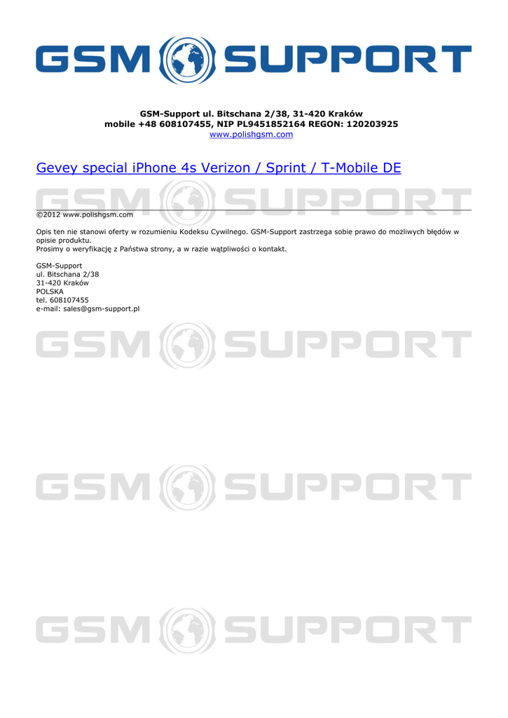 GSM-Support ul. Bitschana 2/38, 31-420 Kraków mobile +48 608107455, NIP PL9451852164 REGON: 120203925 www.polishgsm.com Gevey special iPhone 4s Verizon / Sprint / T-Mobile DE ©2012 www.polishgsm.com Opis ten nie stanowi oferty w rozumieniu Kodeksu Cywilnego. GSM-Support zastrzega sobie prawo do możliwych błędów w opisie produktu. Prosimy o weryfikację z Państwa strony, a w razie wątpliwości o kontakt. GSM-Support ul. Bitschana 2/38 31-420 Kraków POLSKA tel. 608107455 e-mail: [email protected] Powered by TCPDF (www.tcpdf.org)