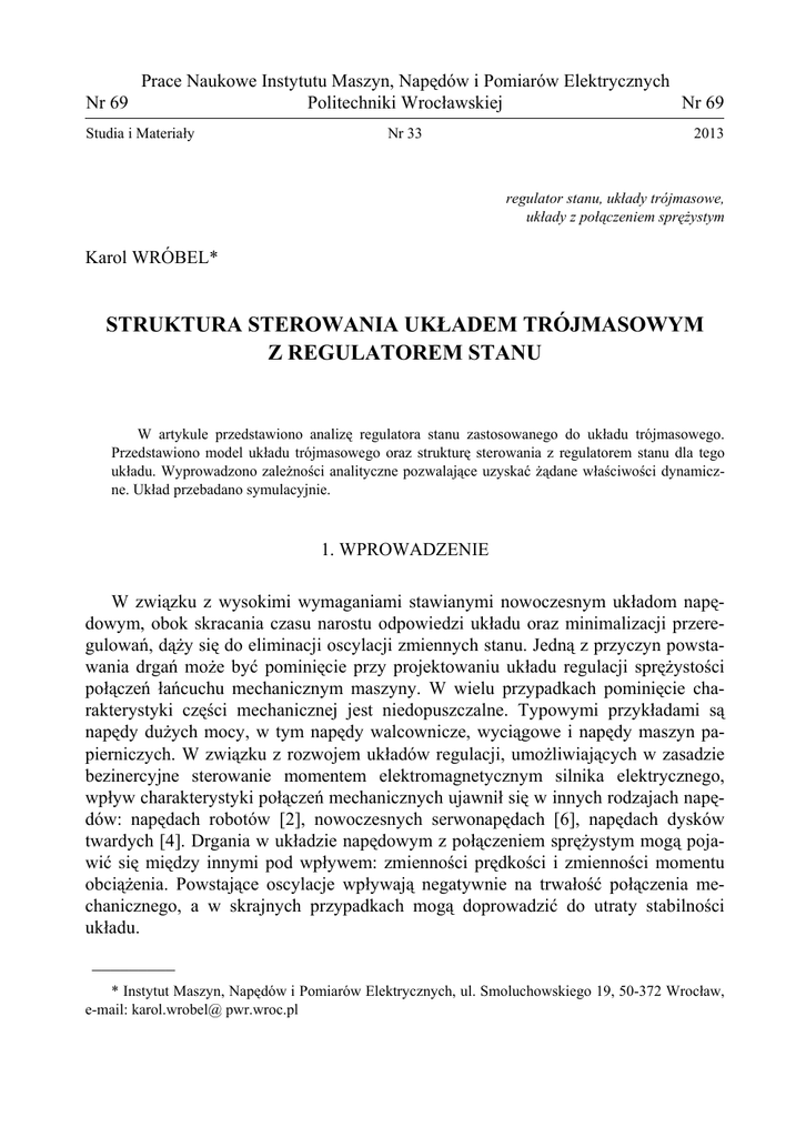 Prace Naukowe Instytutu Maszyn, Napędów i Pomiarów Elektrycznych Nr 69 Politechniki Wrocławskiej Nr 69 Studia i Materiały Nr 33 2013 regulator stanu, układy trójmasowe, układy z połączeniem sprężystym Karol WRÓBEL* STRUKTURA STEROWANIA UKŁADEM TRÓJMASOWYM Z REGULATOREM STANU W artykule przedstawiono analizę regulatora stanu zastosowanego do układu trójmasowego. Przedstawiono model układu trójmasowego oraz strukturę sterowania z regulatorem stanu dla tego układu. Wyprowadzono zależności analityczne pozwalające uzyskać żądane właściwości dynamiczne. Układ przebadano symulacyjnie. 1. WPROWADZENIE W związku z wysokimi wymaganiami stawianymi nowoczesnym układom napędowym, obok skracania czasu narostu odpowiedzi układu oraz minimalizacji przeregulowań, dąży się do eliminacji oscylacji zmiennych stanu. Jedną z przyczyn powstawania drgań może być pominięcie przy projektowaniu układu regulacji sprężystości połączeń łańcuchu mechanicznym maszyny. W wielu przypadkach pominięcie charakterystyki części mechanicznej jest niedopuszczalne. Typowymi przykładami są napędy dużych mocy, w tym napędy walcownicze, wyciągowe i napędy maszyn papierniczych. W związku z rozwojem układów regulacji, umożliwiających w zasadzie bezinercyjne sterowanie momentem elektromagnetycznym silnika elektrycznego, wpływ charakterystyki połączeń mechanicznych ujawnił się w innych rodzajach napędów: napędach robotów [2], nowoczesnych serwonapędach [6], napędach dysków twardych [4]. Drgania w układzie napędowym z połączeniem sprężystym mogą pojawić się między innymi pod wpływem: zmienności prędkości i zmienności momentu obciążenia. Powstające oscylacje wpływają negatywnie na trwałość połączenia mechanicznego, a w skrajnych przypadkach mogą doprowadzić do utraty stabilności układu. _________ * Instytut Maszyn, Napędów i Pomiarów Elektrycznych, ul. Smoluchowskiego 19, 50-372 Wrocław, e-mail: karol.wrobel@ pwr.wroc.pl 368 Uwzględnienie skończonej sztywności połączeń mechanicznych podczas projektowania układu regulacji umożliwia efektywne tłumienie oscylacji. Innym podejściem jest ingerencja w część mechaniczną układu napędowego. Stosuje się rozwiązania konstrukcyjne mające na celu zwiększenie sztywności połączeń lub wzrost tłumienia powstających drgań. Metody te powodują zwiększenie złożoności konstrukcyjnej i wzrost gabarytów układu. Bardziej efektywnym sposobem ograniczania drgań jest zatem zastosowanie odpowiedniej struktury sterowania. W literaturze można znaleźć prace przedstawiające układy sterowania napędów z połączeniem sprężystym wykorzystujące między innymi regulatory PI z dodatkowymi sprzężeniami [8], regulatory rozmyte i neuro-rozmyte [3], a także regulatory predykcyjne [5]. Regulatory PI są dobrze znane w kręgu inżynierów i szeroko stosowane ze względu na łatwość doboru parametrów układu. Metody sztucznej inteligencji, w tym logika rozmyta, są dynamicznie rozwijającą się dziedziną wiedzy, coraz częściej znajdującą zastosowanie w układach sterowania napędów elektrycznych. Regulatory predykcyjne ze względu na dużą złożoność obliczeniową stosowane były początkowo w systemach o małej dynamice, głównie w branży chemicznej i petrochemicznej. W ostatnich latach zauważalnie wzrosło zainteresowanie tą metodą regulacji w obszarze szeroko rozumianej mechatroniki i energoelektroniki [1], [9]. Celem niniejszej pracy jest przedstawienie możliwości zaimplementowania regulatora stanu sterującego prędkością układu trójmasowego. Rozpatrywanie układów dynamicznych w przestrzeni stanu umożliwia umieszczenie wszystkich biegunów układu w żądanych punktach, w stosunkowo prosty sposób. Uzyskuje się dzięki temu zakładany współczynnik tłumienia i pulsację rezonansową układu. Metoda ta wymaga jednak informacji o wszystkich zmiennych stanu [6] które mogą być estymowane za pomocą specjalnego estymatora. 2. MODEL UKŁADU TRÓJMASOWEGO W PRZESTRZENI STANU W przypadku uwzględnienia momentu bezwładności sprzęgła w modelu matematycznym obiektu otrzymuje się o układ trójmasowy, którego schemat ideowy przedstawiono na rysunku 1. Model matematyczny układu opisują równania (1). Rys. 1. Schemat ideowy układu trójmasowego 369 dω1 (t ) = me (t ) − ms12 (t ) dt dω2 (t ) T2 = ms12 (t ) − ms 23 (t ) dt dω (t ) T3 3 = ms 23 (t ) − mL (t ) dt dms12 (t ) T12 = ω1 (t ) − ω2 (t ) dt dms 23 (t ) T23 = ω2 (t ) − ω3 (t ) dt T1 (1) gdzie: ω1, ω2, ω3 – prędkości silnika, przekładni, obciążenia, me – moment elektromagnetyczny silnika, ms12 – moment skrętny wału pomiędzy silnikiem a przekładnią, ms23 – moment skrętny wału pomiędzy przekładnią a obciążeniem, mL – moment obciążenia, T1, T2, T3 – mechaniczne stałe czasowe odpowiednio: silnika, przekładni, obciążenia, T12, T23 – stała czasowa elementu sprężystego (wału) odpowiednio: między silnikiem a przekładnią, między przekładnią a obciążeniem. 3. STRUKTURA STEROWANIA Struktura sterowania układu trójmasowego z regulatorem stanu została zaprezentowana na rysunku 2. W torze głównym znajduje się człon całkujący zapewniający astatyzm pętli regulacji. W pracy przyjęto, że pętla kształtowania momentu elektromagnetycznego jest zoptymalizowana i posiada transmitancję Gm(s) = 1. Rys. 2. Struktura sterowania układu trójmasowego z regulatorem stanu Przy doborze parametrów regulatora stanu wykorzystano metodę rozmieszczenia biegunów równania charakterystycznego. 370 Transmitancja przewodnia prędkości obciążenia układu przedstawionego na rysunku 2 opisana jest następującym wyrażeniem: Gω3 p = KI ω3 = 6 5 4 ω z s a6 + s a5 + s a4 + s 3a3 + s 2 a2 + sa1 + K I (2) gdzie: a6 = T1T12T2T23T3 , a5 = k1T12T2T23T3 , a4 = T1T12T2 + T1T12T3 + T1T23T3 + T2T23T3 + k 2T2T23T3 , a3 = k1T12T2 + k1T12T3 + k1T23T3