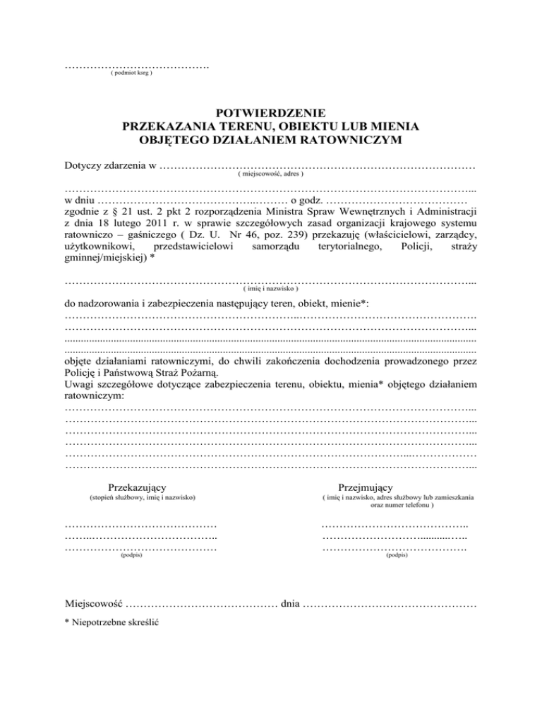 …………………………………. ( podmiot ksrg ) POTWIERDZENIE PRZEKAZANIA TERENU, OBIEKTU LUB MIENIA OBJĘTEGO DZIAŁANIEM RATOWNICZYM Dotyczy zdarzenia w …………………………………………………………………………… ( miejscowość, adres ) …………………………………………………………………………………………………... w dniu ……………………………………..……… o godz. ………………………………… zgodnie z § 21 ust. 2 pkt 2 rozporządzenia Ministra Spraw Wewnętrznych i Administracji z dnia 18 lutego 2011 r. w sprawie szczegółowych zasad organizacji krajowego systemu ratowniczo – gaśniczego ( Dz. U. Nr 46, poz. 239) przekazuję (właścicielowi, zarządcy, użytkownikowi, przedstawicielowi samorządu terytorialnego, Policji, straży gminnej/miejskiej) * …………………………………………………………………………………………………... ( imię i nazwisko ) do nadzorowania i zabezpieczenia następujący teren, obiekt, mienie*: ………………………………………………………..…………………………………………. …………………………………………………………………………………………………... ....................................................................................................................................................... ....................................................................................................................................................... objęte działaniami ratowniczymi, do chwili zakończenia dochodzenia prowadzonego przez Policję i Państwową Straż Pożarną. Uwagi szczegółowe dotyczące zabezpieczenia terenu, obiektu, mienia* objętego działaniem ratowniczym: …………………………………………………………………………………………………... …………………………………………………………………………………………………... …………………………………………………………………………………………………... …………………………………………………………………………………………………... …………………………………………………………………………………...……………… …………………………………………………………………………………………………... Przekazujący (stopień służbowy, imię i nazwisko) …………………………………… ……..…………………………….. …………………………………… (podpis) Przejmujący ( imię i nazwisko, adres służbowy lub zamieszkania oraz numer telefonu ) ………………………………….. ………………………........... ….. …………………………………. (podpis) Miejscowość …………………………………… dnia ………………………………………… * Niepotrzebne skreślić