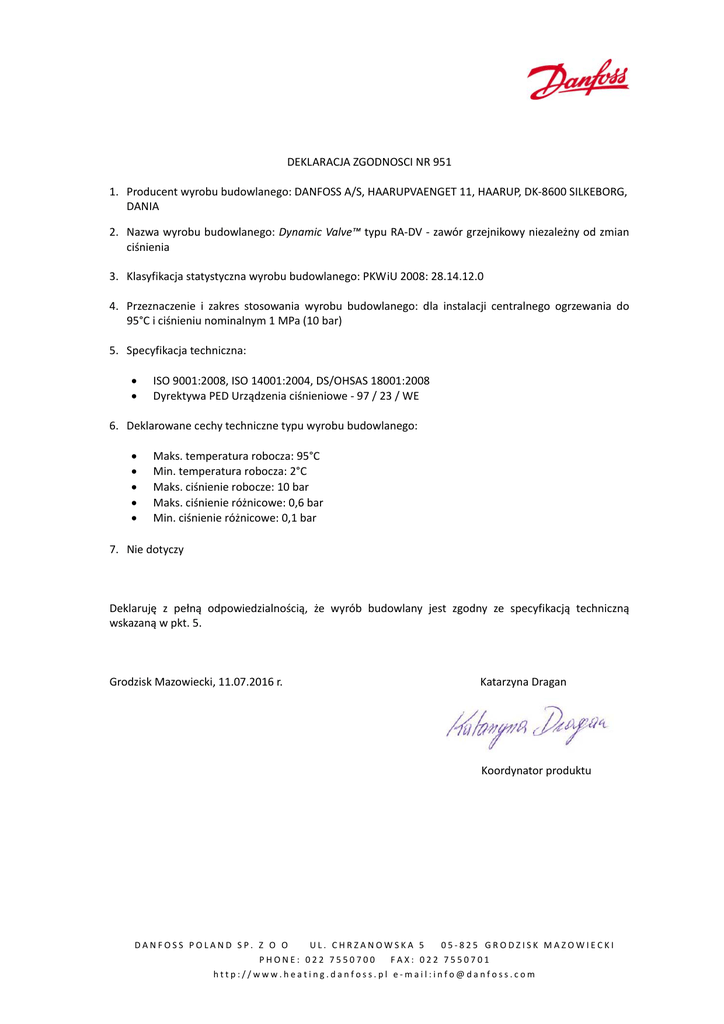 DEKLARACJA ZGODNOSCI NR 951 1. Producent wyrobu budowlanego: DANFOSS A/S, HAARUPVAENGET 11, HAARUP, DK‐8600 SILKEBORG, DANIA 2. Nazwa wyrobu budowlanego: Dynamic Valve™ typu RA‐DV ‐ zawór grzejnikowy niezależny od zmian ciśnienia 3. Klasyfikacja statystyczna wyrobu budowlanego: PKWiU 2008: 28.14.12.0 4. Przeznaczenie i zakres stosowania wyrobu budowlanego: dla instalacji centralnego ogrzewania do 95°C i ciśnieniu nominalnym 1 MPa (10 bar) 5. Specyfikacja techniczna: ISO 9001:2008, ISO 14001:2004, DS/OHSAS 18001:2008 Dyrektywa PED Urządzenia ciśnieniowe ‐ 97 / 23 / WE 6. Deklarowane cechy techniczne typu wyrobu budowlanego: Maks. temperatura robocza: 95°C Min. temperatura robocza: 2°C Maks. ciśnienie robocze: 10 bar Maks. ciśnienie różnicowe: 0,6 bar Min. ciśnienie różnicowe: 0,1 bar 7. Nie dotyczy Deklaruję z pełną odpowiedzialnością, że wyrób budowlany jest zgodny ze specyfikacją techniczną wskazaną w pkt. 5. Grodzisk Mazowiecki, 11.07.2016 r. Katarzyna Dragan Koordynator produktu DANFOSS POLAND SP. Z O O UL. CHRZANOWSKA 5 PHONE: 022 7550700 05‐825 GRODZISK MAZOWIECKI FAX: 022 7550701 http://www.heating.danfoss.pl e‐mail:[email protected]