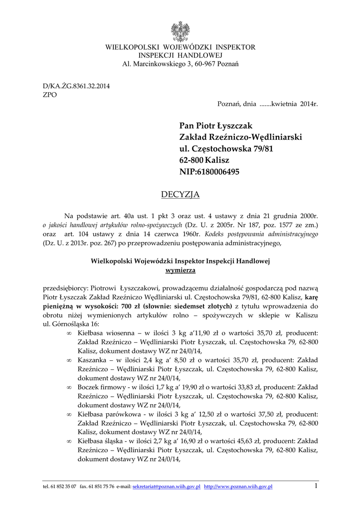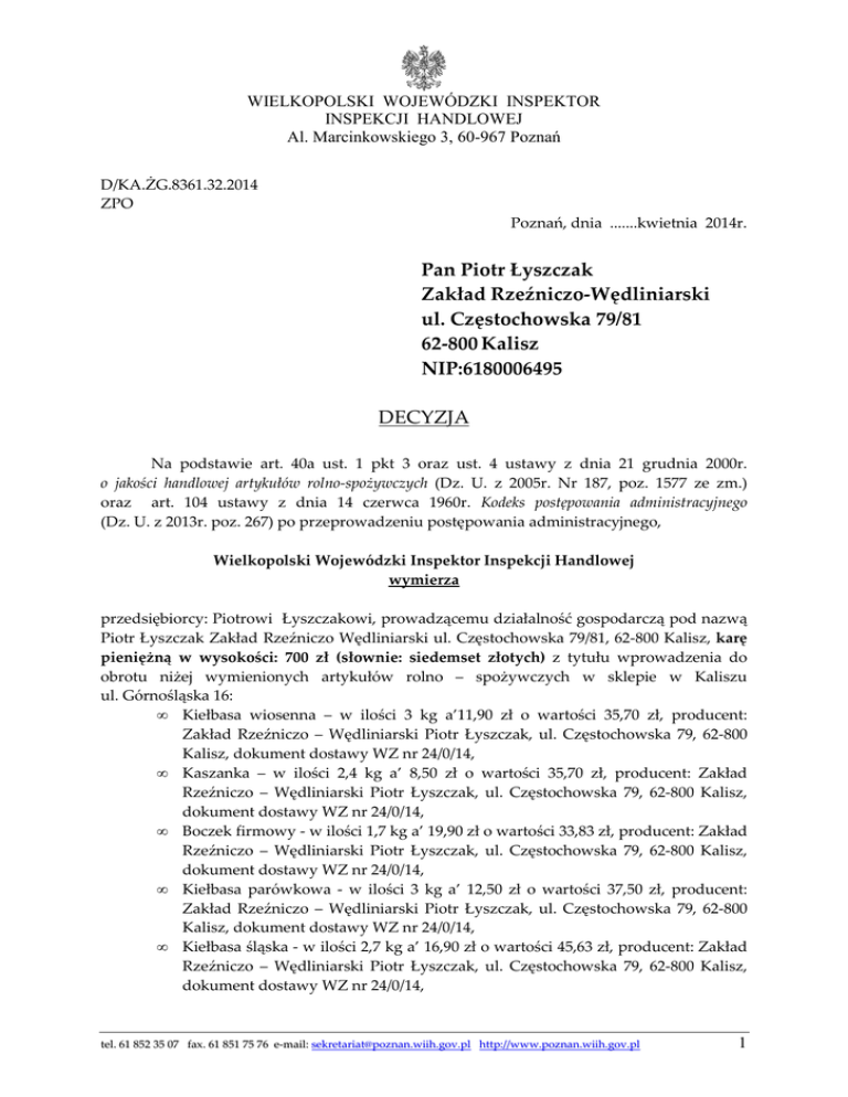 WIELKOPOLSKI WOJEWÓDZKI INSPEKTOR INSPEKCJI HANDLOWEJ Al. Marcinkowskiego 3, 60-967 Poznań D/KA.ŻG.8361.32.2014 ZPO Poznań, dnia .......kwietnia 2014r. Pan Piotr Łyszczak Zakład Rzeźniczo-Wędliniarski ul. Częstochowska 79/81 62-800 Kalisz NIP:6180006495 DECYZJA Na podstawie art. 40a ust. 1 pkt 3 oraz ust. 4 ustawy z dnia 21 grudnia 2000r. o jakości handlowej artykułów rolno-spożywczych (Dz. U. z 2005r. Nr 187, poz. 1577 ze zm.) oraz art. 104 ustawy z dnia 14 czerwca 1960r. Kodeks postępowania administracyjnego (Dz. U. z 2013r. poz. 267) po przeprowadzeniu postępowania administracyjnego, Wielkopolski Wojewódzki Inspektor Inspekcji Handlowej wymierza przedsiębiorcy: Piotrowi Łyszczakowi, prowadzącemu działalność gospodarczą pod nazwą Piotr Łyszczak Zakład Rzeźniczo Wędliniarski ul. Częstochowska 79/81, 62-800 Kalisz, karę pieniężną w wysokości: 700 zł (słownie: siedemset złotych) z tytułu wprowadzenia do obrotu niżej wymienionych artykułów rolno – spożywczych w sklepie w Kaliszu ul. Górnośląska 16: • Kiełbasa wiosenna – w ilości 3 kg a’11,90 zł o wartości 35,70 zł, producent: Zakład Rzeźniczo – Wędliniarski Piotr Łyszczak, ul. Częstochowska 79, 62-800 Kalisz, dokument dostawy WZ nr 24/0/14, • Kaszanka – w ilości 2,4 kg a’ 8,50 zł o wartości 35,70 zł, producent: Zakład Rzeźniczo – Wędliniarski Piotr Łyszczak, ul. Częstochowska 79, 62-800 Kalisz, dokument dostawy WZ nr 24/0/14, • Boczek firmowy - w ilości 1,7 kg a’ 19,90 zł o wartości 33,83 zł, producent: Zakład Rzeźniczo – Wędliniarski Piotr Łyszczak, ul. Częstochowska 79, 62-800 Kalisz, dokument dostawy WZ nr 24/0/14, • Kiełbasa parówkowa - w ilości 3 kg a’ 12,50 zł o wartości 37,50 zł, producent: Zakład Rzeźniczo – Wędliniarski Piotr Łyszczak, ul. Częstochowska 79, 62-800 Kalisz, dokument dostawy WZ nr 24/0/14, • Kiełbasa śląska - w ilości 2,7 kg a’ 16,90 zł o wartości 45,63 zł, producent: Zakład Rzeźniczo – Wędliniarski Piotr Łyszczak, ul. Częstochowska 79, 62-800 Kalisz, dokument dostawy WZ nr 24/0/14, tel. 61 852 35 07 fax. 61 851 75 76 e-mail: [email protected] http://www.poznan.wiih.gov.pl 1 - nieodpowiadających jakości handlowej określonej w § 17 ust. 1 pkt. 2 rozporządzenia Ministra Rolnictwa i Rozwoju Wsi z dnia 10 lipca 2007r. w sprawie znakowania środków spożywczych (Dz. U. Nr 137, poz. 966 ze zm.). Art. 40a ust. 1 pkt 3 w/w ustawy, każdy kto wprowadza do obrotu artykuły rolnospożywcze nieodpowiadające jakości handlowej określonej w przepisach o jakości handlowej lub deklarowanej przez producenta w oznakowaniu tych artykułów, podlega karze pieniężnej w wysokości do pięciokrotnej wartości korzyści majątkowej uzyskanej lub która mogłaby zostać uzyskana przez wprowadzenie tych artykułów rolno-spożywczych do obrotu, nie niższej jednak niż 500 zł. UZASADNIENIE W dniach od 05.02.2014r. do 06.02.2014r. na podstawie upoważnienia Wielkopolskiego Wojewódzkiego Inspektora Inspekcji Handlowej nr D/KA.ŻG.8361.32.2014 z dnia 05 lutego 2014r. inspektorzy Wojewódzkiego Inspektoratu Inspekcji Handlowej w Poznaniu Delegatura w Kaliszu przeprowadzili kontrolę u przedsiębiorcy Piotra Łyszczaka prowadzącego działalność gospodarczą pod nazwą Piotr Łyszczak Zakład Rzeźniczo – Wędliniarski ul. Częstochowska 79/81, 62-800 Kalisz, sklep firmowy w Kaliszu, ul. Górnośląska 16, na podstawie przepisów art. 3 ust. 1-3 rozporządzenia Parlamentu Europejskiego i Rady (WE) Nr 882/2004 z dnia 29 kwietnia 2004r. w sprawie kontroli urzędowych przeprowadzanych w celu sprawdzenia zgodności z prawem paszowym i żywnościowym oraz regułami dotyczącymi zdrowia zwierząt i dobrostanu zwierząt (Dz. Urz. UE L 165 z 30.04.2004r. ze zm.), art. 17 ust. 3 ustawy z dnia 21 grudnia 2000r. o jakości handlowej artykułów rolno-spożywczych (Dz. U. z 2005r. nr 187, poz. 1577, ze zm.) w związku z art. 3 ust. 1 pkt 1, 2 i 6 ustawy z dnia 15 grudnia 2000r. o Inspekcji Handlowej (Dz. U. z 2014 poz. 148). W toku kontroli stwierdzono, że oferowano do sprzedaży wyroby: • Kiełbasa wiosenna – w ilości 3 kg a’11,90 zł o wartości 35,70 zł, producent: Zakład Rzeźniczo – Wędliniarski Piotr Łyszczak, ul. Częstochowska 79, 62-800 Kalisz, dokument dostawy WZ nr 24/0/14, • Kaszanka – w ilości 2,4 kg a’ 8,50 zł o wartości 35,70 zł, producent: Zakład Rzeźniczo – Wędliniarski Piotr Łyszczak, ul. Częstochowska 79, 62-800 Kalisz, dokument dostawy WZ nr 24/0/14, • Boczek firmowy - w ilości 1,7 kg a’ 19,90 zł o wartości 33,83 zł, producent: Zakład Rzeźniczo – Wędliniarski Piotr Łyszczak, ul. Częstochowska 79, 62-800 Kalisz, dokument dostawy WZ nr 24/0/14, • Kiełbasa parówkowa - w ilości 3 kg a’ 12,50 zł o wartości 37,50 zł, producent: Zakład Rzeźniczo – Wędliniarski Piotr Łyszczak, ul. Częstochowska 79, 62-800 Kalisz, dokument dostawy WZ nr 24/0/14, • Kiełbasa śląska - w ilości 2,7 kg a’ 16,90 zł o wartości 45,63 zł, producent: Zakład Rzeźniczo – Wędliniarski Piotr Łyszczak, ul. Częstochowska 79, 62-800 Kalisz, dokument dostawy WZ nr 24/0/14. - nieodpowiadające jakości handlowej z uwagi na to, że w miejscu sprzedaży na wywieszce dotyczącej danego środka spożywczego lub w inny sposób w miejscu dostępnym bezpośrednio dla konsumenta nie podano: wykazu składników wbrew postanowieniom § 17 ust. 1 pkt. 2 rozporządzenia Ministra Rolnictwa i Rozwoju Wsi z dnia 10 lipca 2007r. w sprawie znakowania środków spożywczych (Dz. U. Nr 137, poz. 966 ze zm.). tel. 61 852 35 07 fax. 61 851 75 76 e-mail: [email protected] http://www.poznan.wiih.gov.pl 2 Zgodnie z § 17 ust. 1 rozporządzenia Ministra Rolnictwa i Rozwoju Wsi z dnia 10 lipca 2007r. w sprawie znakowania środków spożywczych (Dz. U. Nr 137, poz. 966, ze zm.) w przypadku środków spożywczych bez opakowań lub pakowanych przy sprzedaży oprócz nazwy środka spoży