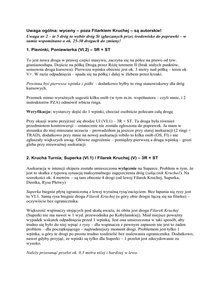 Uwaga ogólna: wyceny – poza Filarkiem Kruchej – są autorskie! Uwaga nr 2 – te 5 dróg to wybór dróg St zgłaszanych przez środowisko do poprawki – w sumie wspominano o ok. 25-30 drogach do zmiany! 1. Pieninki, Poniewierka (VI.2) – 5R + ST To jest nowa droga w prawej części masywu, zaczyna się na półce na prawo od tzw. graniastosłupa. Dojście na półkę Drogą przez Różę terenem II (brak stałych punktów, sensowna droga kursowa). Pierwsza wpinka obecnie jest ok. 3 metry nad półką – teren ok. V+. W razie odpadnięcia – spada się na półkę i dalej w żlebem przez krzaki. Powinna być pierwsza wpinka z półki - dodatkowo byłby to ring stanowiskowy dla dróg kursowych. Przemek mimo wyraźnych sugestii kilku osób (w tym m.in. współautora – czyli mnie, i 2 instruktorów PZA) odmówił wbicia ringa. Weryfikacja: wystarczy dojść do 1 wpinki, chociaż osobiście polecam całą drogę Przy okazji warto przyjrzeć się drodze Ul (VI.1) – 3R + ST. Ta droga była również przedmiotem kontrowersji – ostatecznie nie została zgłoszona do poprawek. Ja mam w stosunku do niej mieszane uczucia – prowadziłem ją jeszcze przy starej asekuracji (2 ringi + TRAD), dodatkowo przy mnie na nowej asekuracji robiło to kilka osób (OS, Fl) i nie zgłaszały większych uwag. Główne zagrożenie – pomiędzy pierwszą a druga wpinką – grozi gleba przy nieuważnej asekuracji. 2. Krucha Turnia; Superka (VI.1) / Filarek Kruchej (V) – 3R + ST Asekuracja w intencji ekipera została umieszczona wyłącznie na Superce. Problem w tym, że jest to skałka z typową sytuacją maksymalnego zagęszczenia dróg (załącznik Krucha1). Na szerokości ok. 4 metrów – są tam obecnie 4 drogi (od lewej Filarek Kruchej, Superka, Diretka, Rysa Płetwy) Superka biegnie płytą ograniczoną z lewej wyraźną rysą/zacięciem. Bez łapania się rysy jest to VI.1. Samą rysa biegnie droga Filarek Kruchej (u góry obie drogie łączą się na filarku) – oczywiście bez ogranicznika. Większość wspinaczy stojących pod skałą uważa, że obita jest droga Filarek Kruchej (Superki nie ma nawet w 1 wyd. przewodnika po Kobylanskiej). Miał miejsce poważny wypadek wskutek odpadnięcia przed 1 wpinką. Jest ona umieszczona w taki sposób, aby trudno się było do niej wpiąć z rysy – dla wspinacza z pewnym zapasem nie jest to żaden problem – dla początkującego – najtrudniejszy moment drogi. Problemem jest tylko 1 wpinka, u góry te drogi po prostu trudno rozdzielić bez malowania ogranicznika. Dodatkowo, nawet gdyby przyjąć, że wpinki są tylko dla Superki – 1 przelot jest zdecydowanie za wysoko. Należy przesunąć przelot ok. 0,5 metra niżej i bardziej w lewo. 3. Wielka Turnia; Smętne Lamenty (VI.2) To nowa droga (lewa z 3 nowych linii za załomem ściany), zaraz obok starej drogi Dawida – Senne Przepowiednie (VI.3+). Obok na prawo jest Mały Filar Wielkiej Turni (nisko pierwsza wpinka, VI.2+). W nowym wydaniu przewodnika po Będkowskiej to są proj. nr 4 i 5. Problem z drogą Smętne Lamenty jest następujący – niestety zepsuję Wam zabawę w stylu OS. Droga startuje mocno z lewej – bardziej w linii wpinek z Sennych Przepowiedni niż w linii wpinki na Smętnych Lamentach. Wpinka dopiero z chwytów na wysokości ringa i potem trawers w prawo. Obecnie nie ma szans, zeby wpiąć się z ziemi (w przeciwieństwie do drogi obok – obie mają bulderowe starty). Odpadnięcie sprzed wpinki – całkiem realne w przypadku nierozczytania sekwencji – kończy się na kamieniach pod ścianą, albo niżej.. Wpinkę należy umieścić tak, aby można było się wpiąć jeszcze przed wejściem w drogę. Weryfikacja: wystarczy dojść do 1 wpinki, reszty drogi osobiście nie polecam (po 3 wpinkach łączy się z sąsiednim Małym Filarem WT – który jest dużo ciekawszy (i dużo trudniejszy). 4. Witkowe Skały; Wewnętrzne Fuj, Ukryte Phie, (VI.1) Droga to projekt nr 3 z przewodnika po Ostańcach (sąsiednie Worki Powietrzne – nr 4, też obite są przez Przemka Rostka – mimo, że na tej drodze wpinka jest również b. wysoko – raczej nie ma możliwości umieszczenia jej niżej – słaba skała) Problemem na drodze Wewnętrzne Fuj.. jest pierwsza wpinka umieszczona wysoko (załacznik Witkowe 1), wpięcie się możliwe jest dopiero po pokonaniu dolnego balda z nogami nad okapikiem (na lewo od linii wpinek, wpinka z wychyleniem w prawo). Możliwe jest sensowne spotowanie – ale sytuacja jest potencjalnie niebezpieczna i nie ma przeszkód, żeby wpinka była zaraz nad krawędzią okapu. Przy okazji – prośba o kontrolę wpinki na drodze Lasagne (nr 15 na tej samej skale). Wspinacze narzekają, że 1 wpinka jest b. trudna i powinna być kawałek niżej. 5. Witkowe Skały; Deptak (VI.1) Nowa droga na skale Wielka Witkowa (projekt nr 2, na lewo od linii sporego obrywu). Wspinacze zgłaszają problem z drugą wpinką (bez wpiętego ekspresa jest bardzo nieprzyjemna), droga ta jest w ogóle dziwnie obita – pierwsza wpinka b. wysoko – a potem dość gęsto. Sugestie – przebicie dwóch pierwszych wpinek po ok. 0,5 metra niżej. Moja uwaga prywatna: akurat co do zmiany obicia na tej drodze mam wątpliwości. Jest po prostu obita niekomfortowo i bez zapasu łatwo spalić z tego powodu OS – ale generalnie niebezpiecznie nie jest.. Tu chodzi o przykład drogi obitej „pod Stefana” (czyli znajomość drogi i wiszące ekspresy) – takich dróg jest wiele niestety.