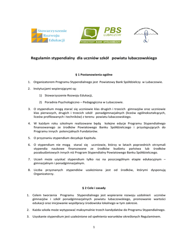 Regulamin stypendialny dla uczniów szkół powiatu lubaczowskiego § 1 Postanowienia ogólne 1. Organizatorem Programu Stypendialnego jest Powiatowy Bank Spółdzielczy w Lubaczowie. 2. Instytucjami wspierającymi są: 1) Stowarzyszenie Rozwoju Edukacji, 2) Poradnia Psychologiczno – Pedagogiczna w Lubaczowie. 3. O stypendium mogą starad się uczniowie klas drugich i trzecich gimnazjów oraz uczniowie klas pierwszych, drugich i trzecich szkół ponadgimnazjalnych (liceów ogólnokształcących, liceów profilowanych i techników) z terenu powiatu lubaczowskiego. 4. W każdym roku szkolnym realizowane będą kolejne edycje Programu Stypendialnego finansowanego ze środków Powiatowego Banku Spółdzielczego i przystępujących do Programu innych potencjalnych Fundatorów. 5. O przyznaniu stypendium decyduje Kapituła. 6. O stypendium nie mogą starad się uczniowie, którzy w latach poprzednich otrzymali stypendia naukowe finansowane ze środków budżetu paostwa lub środków pozabudżetowych innych niż Program Stypendialny Powiatowego Banku Spółdzielczego. 7. Uczeo może uzyskad stypendium tylko raz na poszczególnym etapie edukacyjnym – gimnazjalnym i ponadgimnazjalnym. 8. Liczba przyznanych stypendiów uzależniona jest od środków, którymi dysponują Organizatorzy. § 2 Cele i zasady 1. Celem tworzenia Programu Stypendialnego jest wspieranie rozwoju uzdolnieo uczniów gimnazjów i szkół ponadgimnazjalnych powiatu lubaczowskiego, promowanie wartości edukacji oraz inicjowanie współpracy środowiska lokalnego w tym zakresie. 2. Każda szkoła może wytypowad maksymalnie trzech kandydatów do Programu Stypendialnego. 3. Uzyskanie stypendium jest uzależnione od spełnienia warunków określonych Regulaminem. 1 4. O przyznaniu stypendium zostaną powiadomieni: wnioskodawca oraz dyrektor szkoły do której uczęszcza stypendysta. 5. Wręczenie stypendiów odbędzie się podczas uroczystej Gali. 6. Informacja o Programie Stypendialnym może byd wykorzystywana do działao promocyjnych Powiatowego Banku Spółdzielczego i innych Fundatorów. § 3 Kryteria szczegółowe Programu Stypendialnego 1. Stypendium przyznawane jest na okres 10 miesięcy. 2. Stypendium dla jednego ucznia wynosi 1500,00 złotych wypłacane w dziesięciu miesięcznych ratach po 150 złotych. 3. O przyznaniu stypendium decydowad następujących kryteriów: będzie suma punktów 1) Średnia ocen ze wszystkich przedmiotów osiągnięta poprzedzającego złożenie wniosku: uzyskanych na podstawie na koniec roku szkolnego, a) za średnią powyżej 5.0 uczeo otrzymuje 20 punktów, b) za średnią od 4.75 do 4.99 uczeo otrzymuje 15 punktów, c) za średnią od 4.5 do 4.74 uczeo otrzymuje 10 punktów, d) za średnią od 4.0 do 4.49 uczeo otrzymuje 5 punktów. 2) Oceny uzyskane z następujących przedmiotów na koniec roku szkolnego, poprzedzającego złożenie wniosku: matematyka, informatyka, język angielski: a) za ocenę celującą uczeo otrzymuje 20 punktów, b) za ocenę bardzo dobrą uczeo otrzymuje 15 punktów, c) za ocenę dobrą uczeo otrzymuje 10 punktów. 3) Udział w konkursach i olimpiadach przedmiotowych organizowanych przez Kuratoria Oświaty lub znajdujących się na oficjalnej liście MEN: a) za udział w etapie wojewódzkim (okręgowym), uczeo otrzymuje 10 punktów. b) Finalista olimpiad przedmiotowych na etapie wojewódzkim (okręgowym), otrzymuje 20 punktów. c) Laureat olimpiad przedmiotowych na etapie wojewódzkim (okręgowym), otrzymuje 30 punktów. d) Finalista olimpiad przedmiotowych na etapie centralnym otrzymuje 40 punktów. e) Laureat olimpiad przedmiotowych na etapie centralnym otrzymuje 60 punktów. 4) Udział w konkursach przedmiotowych innych niż określone w podpunkcie 3. 2 a) uczeo uzyskuje od 0 do 20 punktów, b) o przyznaniu punktów decyduje Kapituła. 5) Zaprezentowanie planu rozwoju ucznia. a) uczeo uzyskuje od 0 do 10 punktów, b) o przyznaniu punktów decyduje Kapituła. § 4 Tryb składania wniosków 1. Składanie wniosków o stypendium odbywa się w następującym trybie: 1) Uczniowie ubiegający się o uzyskanie stypendium zobowiązani są do wypełnienia wniosku stypendialnego wraz z załącznikami oraz złożenia go do Organizatora. 2) Do wniosku stypendialnego należy dołączyd poświadczone przez dyrektora szkoły kserokopie dyplomów i zaświadczeo oraz oświadczenie o zgodzie na przetwarzanie danych osobowych. 3) Dokumentacja niekompletna nie będzie rozpatrywana przez Organizatora. § 5 Termin składania wniosków 1. Wypełniony wniosek wraz z załączonymi dokumentami należy złożyd w teczce opisanej w następujący sposób: 1) imię i nazwisko ucznia, 2) adres domowy ucznia, 3) nazwa i adres szkoły. 2. Dokumenty należy złożyd w siedzibie Powiatowego Banku Spółdzielczego w Lubaczowie, przy ulicy Rynek 28, w pokoju numer 4 . 3. Dokumenty należy złożyd w terminie do 23 września bieżącego roku . 4. Wnioski złożone po terminie nie będą rozpatrywane. § 6 Tryb przyznawania stypendium 1. Organizator w celu wyłonienia stypendystów powołuje Kapitułę w składzie: 1) Przedstawiciel Powiatowego Banku Spółdzielczego w Lubaczowie. 3 2) Przedstawiciel Stowarzyszenia Rozwoju Edukacji. 3) Przedstawiciel Poradni Psychologiczno – Pedagogicznej w Lubaczowie, 4) Przedstawiciel Starostwa Powiatowego w Lubaczowie. 2. Z posiedzenia Kapituły zostanie sporządzony protokół. § 7 Postanowienia koocowe 1. Wyniki Programu Stypendialnego zostaną ogłoszone podczas uroczystej Gali. 2. Ze Stypendystami Organizator podpisze umowy. W przypadku ucznia niepełnoletniego w jego imieniu umowę podpisze rodzic lub opiekun prawny. 3. Po okresie korzystania ze stypendium Stypendysta zobowiązany jest do przedstawienia sprawozdania z wykorzystania funduszy w terminie wskazanym w umowie stypendialnej. 4. Nie wywiązanie się z wyżej wymienionego zapisu powoduje utratę możliwości ubiegania się o stypendium w kolejnych edycjach. 4