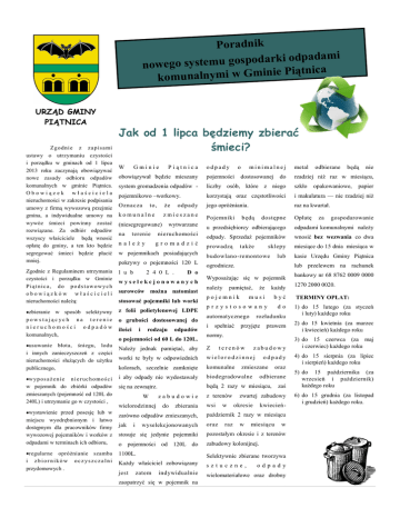 Poradnik padami od i rk a d o sp o g u em st nowego sy ie Piątnica in m G w i m y ln a n u m o k URZĄD GMINY PIĄTNICA Zg od ni e z z a p is a mi ustawy o utrzymaniu czystości i porządku w gminach od 1 lipca 2013 roku zaczynają obowiązywać nowe zasady odbioru odpadów komunalnych w gminie Piątnica. Obowiązek właściciela nieruchomości w zakresie podpisania umowy z firmą wywozową przejmie gmina, a indywidualne umowy na wywóz śmieci powinny zostać rozwiązane. Za odbiór odpadów wszyscy właściciele będą wnosić opłatę do gminy, a ten kto będzie segregować śmieci będzie płacić mniej. Jak od 1 lipca będziemy zbierać śmieci? W Gminie Piątnica nie pojemnikowo –workowy. korzystają oraz częstotliwości i makulatura — nie rzadziej niż Oznacza jego opróżniania. raz na kwartał. komunalne zmieszane (niesegregowane) na terenie należy odpad y wytwarzane nieruchomości gromadzić w pojemnikach posiadających pokrywy o pojemności 120 L z folii polietylenowej LDPE regularne opróżnianie szamba i zbiorników oczyszczalni przydomowych . będą szkło że 2 4 0 L . D o wyselekcjonowanych surowców można natomiast stosować pojemniki lub worki o grubości dostosowanej do ilości i rodzaju odpadów o pojemności od 60 L do 120L. Pojemniki będą dostępne wnosić bez wezwania co dwa miesiące do 15 dnia miesiąca w także sklepy budowlano-remontowe lub ogrodnicze. Wyposażając się w pojemnik należy pamiętać, pojemnik że każdy musi być przystosowany automatycznego i spełniać do rozładunku przyjęte prawem normy. terenów komunalne i aby odpady nie wydostawały biodegradowalne się na zewnątrz. będą 2 razy w miesiącu, z terenów wsi w zabudowy odpady zmieszane oraz odbierane zaś zwartej zabudowy okresie kwiecień- zarówno odpadów zmieszanych, październik 2 razy w miesiącu jak oraz i wyselekcjonowanych raz w miesiącu w stosuje się jedynie pojemniki pozostałym okresie i z terenów o pojemności od 120L do zabudowy kolonijnej. 1100L. Selektywnie zbierane tworzywa Każdy właściciel zobowiązany sztuczne, jest wielomateriałowe oraz drobny zatem indywidualnie zaopatrzyć się w pojemnik na kasie Urzędu Gminy Piątnica lub przelewem na rachunek kolorach, szczelnie zamknięte zbierania gospodarowanie prowadzą wielorodzinnej do za papier odpady. Sprzedaż pojemników worki te były w odpowiednich wielorodzinnej Opłatę opakowaniowe, odpadami komunalnymi należy Z zabudowie rzadziej niż raz w miesiącu, u przedsiębiorcy odbierającego Należy jednak pamiętać, aby W do odbierane liczby osób, które z niego to, dostosowanej metal system gromadzenia odpadów - zbieranie w sposób selektywny powstających na terenie nieruchomości odpadów komunalnych, wystawienie przed posesję lub w miejscu wyodrębnionym i łatwo dostępnym dla pracowników firmy wywozowej pojemników i worków z odpadami w terminach ich odbioru, minimalnej pojemności l u b w yp o s a ż e n i e n i e r u c h o m o ś c i w pojemnik do zbiórki odpadów zmieszanych (pojemność od 120L do 240L) i utrzymanie go w czystości , o obowiązywał będzie mieszany Zgodnie z Regulaminem utrzymania czystości i porządku w Gminie Piątnica, do podstawowych obowiązków właścicieli nieruchomości należą: usuwanie błota, śniegu, lodu i innych zanieczyszczeń z części nieruchomości służących do użytku publicznego, odpady odpady bankowy nr 68 8762 0009 0000 1270 2000 0020. TERMINY OPŁAT: 1) do 15 lutego (za styczeń i luty) każdego roku 2) do 15 kwietnia (za marzec i kwiecień) każdego roku 3) do 15 czerwca (za maj i czerwiec) każdego roku 4) do 15 sierpnia (za lipiec i sierpień) każdego roku 5) do 15 października (za wrzesień i październik) każdego roku 6) do 15 grudnia (za listopad i grudzień) każdego roku. iórki odpadów Zasady selektywnej zb komunalnych Segregacja śmieci to oddzielanie z ogółu wytwarzanych odpadów komunalnych surowców wtórnych, które nadają się do recyklingu. Przez recykling natomiast należy rozumieć taki odzysk, który polega na powtórnym przetwarzaniu substancji lub materiałów zawartych w odpadach. Segregacja odpadów nie jest skomplikowana, dlatego warto przyczynić się do poprawy jakości środowiska, w którym żyjemy. Tylko dobrze posegregowane i czyste odpady mogą być powtórnie przetworzone, stąd ważne jest, co wrzucamy do pojemnika lub worka i w jaki sposób to robimy. WOREK ZIELONY WOREK NIEBIESKI WOREK ŻÓŁTY WRZUCAJ: WRZUCAJ: WRZUCAJ: gazety, zeszyty, czasopisma, butelki po napojach i sokach, butelki po napojach katalogi, ulotki, słoiki po żywności, (np. typu PET) , kosmetykach i środkach papier biurowy, opakowania po kosmetykach. czystości (np. po szamponach), opakowaniowy, opakowania po żywności, pudełka kartonowe, tekturowe, NIE WRZUCAJ: książki w okładkach miękkich. szkła stołowego, kryształowego, jogurtach, śmietanie, opakowania kartonowe po napojach, mleku, NIE WRZUCAJ: zbrojonego, okiennego, nietłukącego, żaroodpornego, okularowego, fajansu, porcelany, ceramiki, żarówek, reflektorów, ekranów, kineskopów, zabrudzonego i tłustego papieru, nakrętki, zakrętki, opakowań z zawartością, torebki, worki, reklamówki, folie, pieluch jednorazowych, podpasek i innych puszki po napojach i konserwach (drobny artykułów higienicznych, kalki, worków po cemencie, tapet, papierów szyb samochodowych, luster. metal). NIE WRZUCAJ: butelek i pojemników z zawartością, ściernych, PAMIĘTAJ: butelek i pojemników po olejach lakierowanych lub foliowanych papierów nie tłucz szkła przed wrzuceniem do pojemnika, z folderów reklamowych. wrzucaj puste opakowania, (spożywczych, silnikowych), opakowań po środkach chwasto PAMIĘTAJ: usuń: spinacze biurowe, zszywki, twarde oddziel nakrętki, i owadobójczych, zabawek, baterii, styropianu, opakowań okładki, folie, aby razem z papierem nie nie musisz zdzierać naklejek (etykiet). trafiały do pojemnika żadne inne po lekach, zanieczyszczenia.