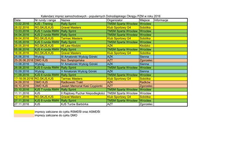 Data 13.02.2016 28.02.2016 13.03.2016 04.04.2016 09.04.2016 15.05.2016 28.05.2016 05.06.2016 18.06.2016 25.06.2016 25-26.06.2016 13.08.2016 28.08.2016 10.09.2016 11.09.2016 17-18.09.2016 24.09.2016 09.10.2016 23.10.2016 11.11.2016 12.11.2016 27.11.2016 27.11.2016 Kalendarz imprez samochodowych - popularnych Dolnośląskiego Okręgu PZM w roku 2016 Nr rundy i ranga Nazwa Organizator Miejsce Informacje KJS - Trening Rally Sprint TMSM Sparta Wrocław Wrocław RO,SKJS,KJS Gravel Masters Klub Sportowy G4 Sobótka KJS 1 runda RMW Rally Sprint TMSM Sparta Wrocław Wrocław KJS 2 runda RMW Rally Sprint TMSM Sparta Wrocław Wrocław RO,SKJS,KJS Tarmac Masters Klub Sportowy G4 Sobótka KJS 3 runda RMW Rally Sprint TMSM Sparta Wrocław Wrocław RO,SKJS,KJS 46 Lew Kłodzki AZK Kłodzko KJS 4 runda RMW Rally Sprint TMSM Sparta Wrocław Wrocław RO,SKJS,KJS Gravel Masters Klub Sportowy G4 Sobótka Wyścig III Amatorski Wyścig Górski AZK Sienna DMO KJS Noc Świętojańska AZT Zgorzelec Wyścig IV Amatorski Wyścig Górski AZK Sienna KJS 5 runda RMW Rally Sprint TMSM Sparta Wrocław Wrocław Wyścig V Amatorski Wyścig Górski AZK Sienna KJS 6 runda RMW Rally Sprint TMSM Sparta Wrocław Wrocław RO,SKJS,KJS Tarmac Masters Klub Sportowy G4 Sobótka DMO KJS Radkowski Trakt AZK Radków DMO KJS Jesień Memoriał Kasi Czypionki AZT Zgorzelec KJS 7 runda RMW Rally Sprint TMSM Sparta Wrocław Wrocław KJS II Rajdowy Puchar Niepodległości TMSM Sparta Wrocław Wrocław RO,SKJS,KJS Gravel Masters Klub Sportowy G4 Sobótka KJS 8 runda RMW Rally Sprint TMSM Sparta Wrocław Wrocław KJS KJS Turów Barbórka AZT Zgorzelec imprezy zaliczane do cyklu RSMDŚl oraz ASMDŚl imprezy zaliczane do cyklu DMO