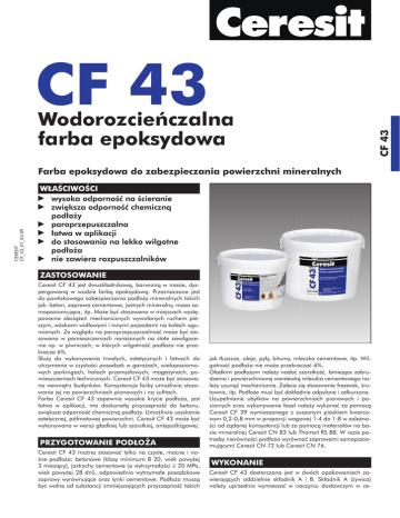 Wodorozcieńczalna farba epoksydowa CERESIT CF_43_KT_03.09 Farba epoksydowa do zabezpieczania powierzchni mineralnych WŁAŚCIWOŚCI wysoka odporność na ścieranie zwiększa odporność chemiczną podłoży paroprzepuszczalna łatwa w aplikacji do stosowania na lekko wilgotne podłoża nie zawiera rozpuszczalników ZASTOSOWANIE Ceresit CF 43 jest dwuskładnikową, barwioną w masie, dyspergowaną w wodzie farbą epoksydową. Przeznaczona jest do powłokowego zabezpieczania podłoży mineralnych takich jak: beton, zaprawa cementowa, jastrych mineralny, masa samopoziomująca, itp. Może być stosowana w miejscach występowania obciążeń mechanicznych wywołanych ruchem pieszym, wózkami widłowymi i innymi pojazdami na kołach ogumionych. Ze względu na paroprzepuszczalność może być stosowana w pomieszczeniach narażonych na stałe zawilgocenie np. w piwnicach, w których wilgotność podłoża nie przekracza 6%. Służy do wykonywania trwałych, estetycznych i łatwych do utrzymania w czystości posadzek w garażach, wielopoziomowych parkingach, halach przemysłowych, magazynach, pomieszczeniach technicznych. Ceresit CF 43 może być stosowana wewnątrz budynków. Konsystencja farby umożliwia stosowanie jej na powierzchniach pionowych i na sufitach. Farba Ceresit CF 43 zapewnia wysokie krycie podłoża, jest łatwa w aplikacji, ma doskonałą przyczepność do betonu, zwiększa odporność chemiczną podłoży. Umożliwia uzyskanie estetycznej, półmatowej powierzchni. Ceresit CF 43 może być wykonywana w wersji gładkiej lub szorstkiej, antypoślizgowej. PRZYGOTOWANIE PODŁOŻA Ceresit CF 43 można stosować tylko na czyste, mocne i nośne podłoża: betonowe (klasy minimum B 20, wiek powyżej 3 miesięcy), jastrychy cementowe (o wytrzymałości ³ 20 MPa, wiek powyżej 28 dni), odpowiednio wytrzymałe posadzkowe zaprawy wyrównujące oraz tynki cementowe. Podłoża muszą być wolne od substancji zmniejszających przyczepność takich jak tłuszcze, oleje, pyły, bitumy, mleczko cementowe, itp. Wilgotność podłoża nie może przekraczać 6%. Gładkim podłożom należy nadać szorstkość. Istniejące zabrudzenia i powierzchniową warstewkę mleczka cementowego należy usunąć mechanicznie. Zaleca się stosowanie frezarek, śrutownic, itp. Podłoże musi być dokładnie odpylone i odkurzone. Uzupełnianie ubytków na powierzchniach pionowych i poziomych oraz wykonywanie faset należy wykonać za pomocą Ceresit CF 39 wymieszanego z suszonym piaskiem kwarcowym 0,2-0,8 mm w proporcji wagowej 1:4 do 1:8 w zależności od żądanej konsystencji lub za pomocą materiałów na bazie mineralnej Ceresit CN 83 lub Thomsit RS 88. W razie potrzeby nierówności podłoża wyrównać zaprawami samopoziomującymi Ceresit CN 72 lub Ceresit CN 76. WYKONANIE Ceresit CF 43 dostarczana jest w dwóch opakowaniach zawierających oddzielnie składnik A i B. Składnik A (żywica) należy uprzednio wymieszać w naczyniu dostawczym w ce- CF 43 CF 43 UWAGA Wejście na rozprowadzoną świeżą farbę ułatwiają specjalne buty na kolcach. Narzędzia i świeże resztki materiału można zmyć ciepłą wodą. Stwardniałą farbę można usunąć tylko mechanicznie. Do wykonywania posypki z piasku 0,2-0,8 mm należy przyjąć około 4 kg piasku na 1m2. Nadmiar piasku, który pozostaje na powierzchni związanej żywicy nadaje się do ponownego użycia. Prace należy wykonywać w temperaturze powietrza od +12°C do +30°C oraz wilgotności względnej poniżej 80%. Wszystkie materiały do wykonywania posadzki powinny być sezonowane co najmniej 24 godziny w pomieszczeniu lub w warunkach w których będzie wykonywana posadzka. Temperatura podłoża nie może być niższa niż 12°C i musi być co najmniej o 3°C wyższa od temperatury punktu rosy. Wszelkie dane dotyczą temperatury +20°C i względnej wilgotności powietrza 60%. W innych warunkach należy uwzględnić szybsze lub wolniejsze twardnienie materiału. Materiał przewozić wyłącznie krytymi środkami transportu. Farba Ceresit CF 43 po utwardzeniu jest fizjologicznie obojętna dla organizmu ludzkiego. Nieutwardzony materiał zawiera substancje szkodliwe dla zdrowia i może powodować odczyny alergiczne. Stosować rękawice, ubranie i okulary ochronne. Pomieszczenia, w których odbywają się prace należy wydzielić i zabezpieczyć przed wstępem osób postronnych oraz zachować strefę ochronną przed użyciem otwartego ognia. W pomieszczeniach zapewnić dobrą wentylację. W przypadku wystąpienia mdłości należy skontaktować się z lekarzem. Skórę zabrudzoną farbą zmyć ciepłą wodą z mydłem i natłuścić kremem. W przypadku kontaktu z oczami płukać je obficie wodą i zasięgnąć porady lekarza. Chronić przed dziećmi. ZALECENIA Niniejsza karta techniczna określa zakres stosowania materiału i sposób prowadzenia robót, ale nie może zastąpić zawodowego przygotowania wykonawcy. Oprócz podanych informacji prace należy wykonywać zgodnie ze sztuką budowlaną i zasadami BHP. Producent gwarantuje jakość wyrobu, natomiast nie ma wpływu na warunki i sposób jego użycia. W przypadku wątpliwości należy wykonać własne próby stosowania. Wraz z ukazaniem się tej karty technicznej tracą ważność karty wcześniejsze. SKŁADOWANIE Do 6 miesięcy od daty produkcji przy składowaniu w suchych, przewiewnych pomieszczeniach, w temperaturze do 25°C oraz w oryginalnych, nieuszkodzonych, szczelnie zamkniętych opakowaniach. Chronić przed mrozem! OPAKOWANIA Pojemniki 15 kg (składnik A+B). Buduj korzystając z profesjonalnych rozwiązań. CERESIT CF_43_KT_03.09 CF 43 lu ujednorodnienia i równomiernego rozprowadzenia wypełniacza mineralnego. Następnie odmierzoną porcję składnika A należy przelać do naczynia roboczego i dodać odpowiednią ilość składnika B (utwardzacz) wg podanej proporcji. Obydwa składniki wymieszać przy użyciu wiertarki z mieszadłem (300-600 obr/min.), aż do uzyskania jednorodnej kolorystycz