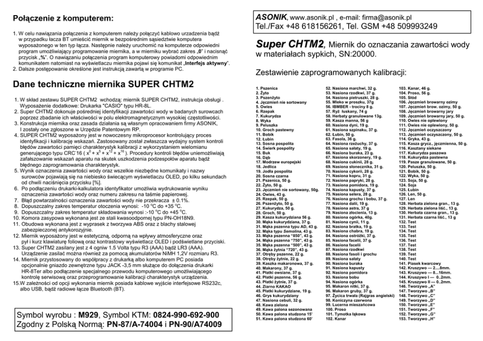 Połączenie z komputerem: 1. W celu nawiązania połączenia z komputerem należy połączyć kablowo urzadzenia bądź w przypadku łacza BT umieścić miernik w bezpośrednim sąsiedztwie komputera wyposażonego w ten typ łącza. Następnie należy uruchomić na komputerze odpowiedni program umożliwiający programowanie miernika, a w mierniku wybrać zakres „0” i nacisnąć przycisk „%”. O nawiązaniu połączenia program komputerowy powiadomi odpowiednim komunikatem natomiast na wyświetlaczu miernika pojawi się komunikat „Interfejs aktywny”. 2. Dalsze postępowanie określone jest instrukcją zawartą w programie PC. Dane techniczne miernika SUPER CHTM2 1. W skład zestawu SUPER CHTM2 wchodzą: miernik SUPER CHTM2, instrukcja obsługi . Wyposażenie dodatkowe: Drukarka "CASIO" typu HR-8L. 2. Super CHTM2 dokonuje pośredniej identyfikacji zawartości wody w badanych surowcach poprzez zbadanie ich właściwości w polu elektromagnetycznym wysokiej częstotliwości. 3. Konstrukcja miernika oraz zasada działania są własnym opracowaniem firmy ASONIK, I zostały one zgłoszone w Urzędzie Patentowym RP. 4. SUPER CHTM2 wyposażony jest w nowoczesny mikroprocesor kontrolujący proces identyfikacji i kalibrację wskazań. Zastosowany został zwłaszcza wydajny system kontroli błędów zawartości pamięci charakterystyk kalibracji z wykorzystaniem wielomianu generującego typu CRC-16 ( x0 + x5 + x12 + x16 ). Procedury kontroli błędów uniemożliwiają zafałszowanie wskazań aparatu na skutek uszkodzenia podzespołów aparatu bądź błędnego zaprogramowania charakterystyk. 5. Wynik oznaczenia zawartości wody oraz wszelkie niezbędne komunikaty i nazwy surowców pojawiają się na niebiesko świecącym wyświetlaczu OLED, po kilku sekundach od chwili naciśnięcia przycisku [%]. 6. Po podłączeniu drukarki-kalkulatora identyfikator umożliwia wydrukowanie wyniku oznaczenia zawartości wody oraz numeru zakresu na taśmie papierowej. 7. Błąd powtarzalności oznaczenia zawartości wody nie przekracza ± 0.1%. 8. Dopuszczalny zakres temperatur otoczenia wynosi: -10 oC do +35 oC. 9. Dopuszczalny zakres temperatur składowania wynosi :-10 oC do +45 oC. 10. Komora zasypowa wykonana jest ze stali kwasoodpornej typu PN-OH18N9. 11. Obudowa wykonana jest z wyprasek z tworzywa ABS oraz z blachy stalowej zabezpieczonej antykorozyjnie. 12. Miernik wyposażony jest w estetyczną, odporną na wpływy atmosferyczne oraz pył i kurz klawiaturę foliową oraz kontrastowy wyświetlacz OLED i podświetlane przyciski. 13. Super CHTM2 zasilany jest z 4 ogniw 1.5 Volta typu R3 (AAA) bądź LR3 (AAA). Urządzenie zasilać można również za pomocą akumulatorów NiMH 1,2V rozmiaru R3. 14. Miernik przystosowany do współpracy z drukarką albo komputerem PC posiada opcjonalnie gniazdo zewnętrzne typu JACK -3,5 mm służące do dołączenia drukarki HR-8Ter albo podłączenie specjalnego przewodu komputerowego umożliwiającego kontrolę serwisową oraz przeprogramowanie kalibracji charakterystyk urządzenia. 15.W zależności od opcji wykonania miernik posiada kablowe wyjście interfejsowe RS232c, albo USB, bądź radiowe łącze Bluetooth (BT). Symbol wyrobu : M929, Symbol KTM: 0824-990-692-900 Zgodny z Polską Normą: PN-87/A-74004 i PN-90/A74009 ASONIK, www.asonik.pl , e-mail: [email protected] Tel./Fax +48 618156261, Tel. GSM +48 509993249 Super CHTM2, Miernik do oznaczania zawartości wody w materiałach sypkich, SN:20000. Zestawienie zaprogramowanych kalibracji: 1. Pszenica 2. Żyto 3. Pszenżyto 4. Jęczmień nie sortowany 5. Owies 6. Rzepak 7. Kukurydza 8. Wyka 9. Peluszka 10. Groch pastewny 11. Bobik 12. Łubin 13. Sosna pospolita 14. Świerk pospolity 15. Buk 16. Dąb 17. Modrzew europejski 18. Jedlica 19. Jodła pospolita 20. Sosna czarna 21. Pszenica, 50 g. 22. Żyto, 50 g. 23. Jęczmień nie sortowany, 50g. 24. Owies, 43 g. 25. Rzepak, 50 g. 26. Pszenżyto, 50 g. 27. Kukurydza, 50 g. 28. Groch, 50 g. 29. Kasza kukurydziana 56 g. 30. Mąka kukurydziana, 37 g. 31. Mąka pszenna typu AD, 43 g. 32. Mąka typu Semolina, 43 g. 33. Mąka pszenna “850”, 43 g. 34. Mąka pszenna “750”, 43 g. 35. Mąka pszenna “500”, 43 g. 36. Mąka żytnia “720”, 43 g. 37. Otręby pszenne, 22 g. 38. Otręby żytnie, 22 g. 39. Kaszka makaronowa, 37 g. 40. Makarony, 37 g. 41. Płatki owsiane, 37 g. 42. Płatki pszenne, 56 g. 43. Płatki żytnie, 37 g. 44. Ziarno KAKAO 45. Płatki kukurydziane, 19 g. 46. Grys kukurydziany 47. Nasiona cebuli, 32 g. 48. Kawa zielona 49. Kawa palona sezonowana 50. Kawa palona studzona 15’ 51. Kawa palona studzona 60’ 52. Nasiona marchwi, 32 g. 53. Nasiona rzodkwi, 37 g. 54. Nasiona pietruszki, 28 g. 55. Mleko w proszku, 37g 56. IBMBER - trociny 8 g. 57. Ryż łuskany, 74 g 58. Herbaty granulowane 13g. 59. Kasza manna, 56 g 60. Nasiona dyni, 19 g. 61. Nasiona szpinaku, 37 g. 62. Łubin, 50 g. 63. Fasola, 36 g. 64. Nasiona rzeżuchy, 37 g. 65. Nasiona sałaty, 19 g. 66. Nasiona buraka, 23 g. 67. Nasiona skorzonery, 19 g. 68. Nasiona cukinii, 28 g. 69. Nasiona słonecznika, 31 g. 70. Nasiona cykorii, 28 g. 71. Nasiona kopru, 31 g. 72. Nasiona papryki, 28 g. 73. Nasiona pomidora, 19 g. 74. Nasiona kapusty, 37 g. 75. Nasiona selera, 28 g. 76. Nasiona grochu i bobu, 37 g. 77. Nasiona dalii, 19 g. 78. Nasiona astra, 37 g 79. Nasiona złocienia, 13 g. 80. Nasiona ogórka, 40g. 81. Nasiona cynii, 11 g. 82. Nasiona bratka, 19 g. 83. Nasiona chabra, 19 g. 84. Nasiona ostróżki, 37 g. 85. Nasiona facelii, 37 g. 86. Nasiona facelii 87. Nasiona rzodkwi 88. Nasiona fasoli i grochu 89. Nasiona sałaty 90. Nasiona buraka 91. Nasiona kapusty 92. Nasiona pomidora 93. Nasiona bobu 94. Nasiona ogórka 95. Makaron nitki, 37 g. 96. Makaron gruby, 37 g. 97. Życica trwała (Rajgras angielski) 98. Koniczyna czerwona 99. Lucerna mieszańcowa 100. Proso 101. Tymotka łąkowa 102. Kanar 103. Kanar, 46 g. 104. Proso, 56 g. 105. Słód 106. Jęczmień browarny ozimy 107. Jęczmień br
