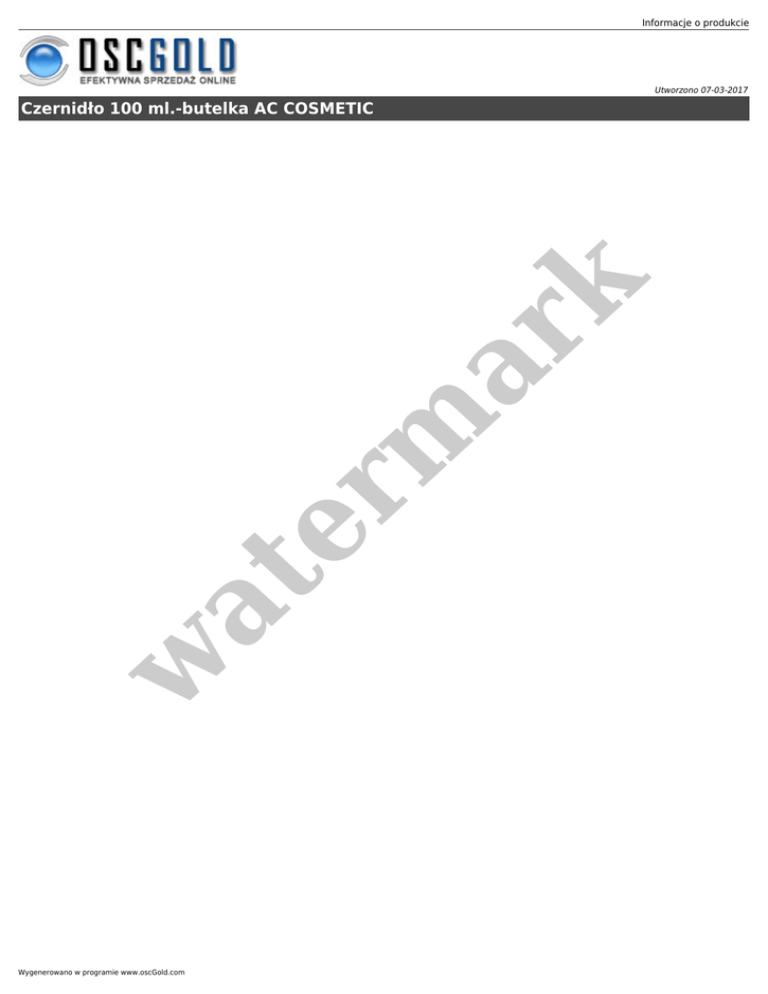 Informacje o produkcie Utworzono 07-03-2017 w at er m ar k Czernidło 100 ml.-butelka AC COSMETIC Wygenerowano w programie www.oscGold.com Cena : 5,41 zł w at er m ar k Nr katalogowy : 5578 Stan magazynowy : brak w magazynie Średnia ocena : brak recenzji Informacje o produkcie w at er m ar k Przywraca naturalny kolor i połysk czarnym, plastikowym elementom nadwozia: zderzakom, bocznym listwom, spojlerom, obudowom lusterek. Chroni przed działaniem czynników atmosferycznych. Wygenerowano w programie www.oscGold.com