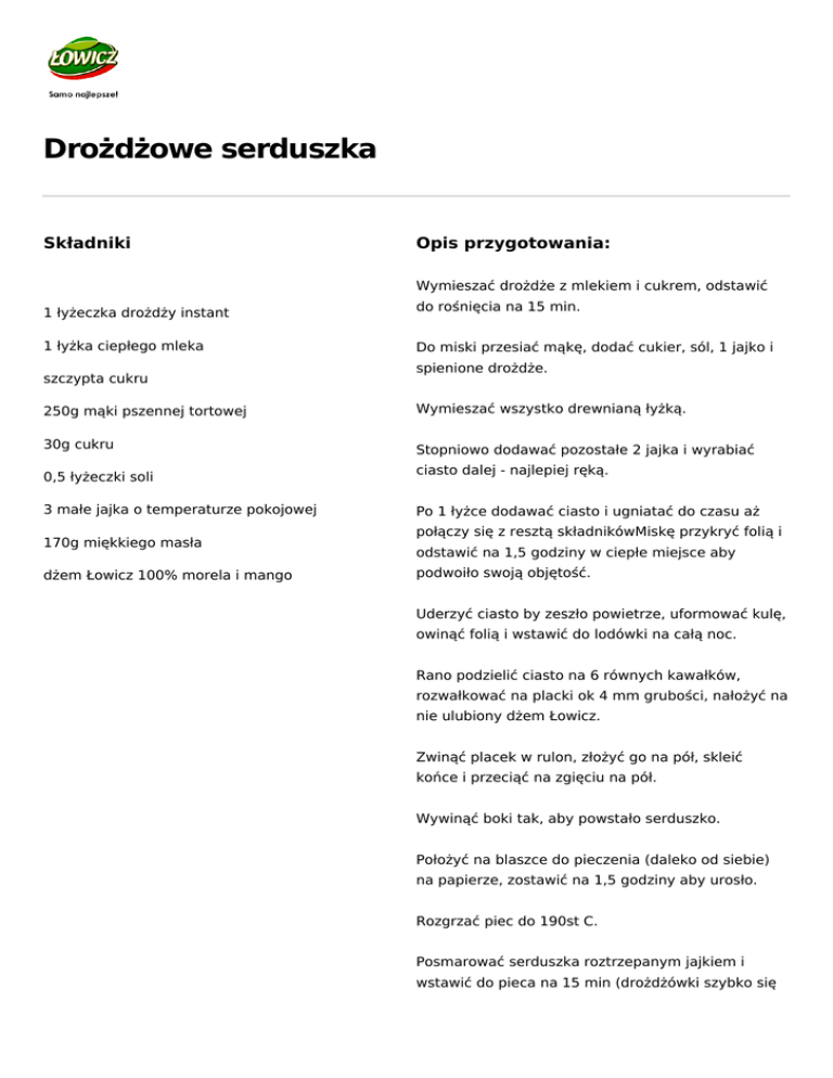 Drożdżowe serduszka Składniki Opis przygotowania: Wymieszać drożdże z mlekiem i cukrem, odstawić 1 łyżeczka drożdży instant 1 łyżka ciepłego mleka szczypta cukru do rośnięcia na 15 min. Do miski przesiać mąkę, dodać cukier, sól, 1 jajko i spienione drożdże. 250g mąki pszennej tortowej Wymieszać wszystko drewnianą łyżką. 30g cukru Stopniowo dodawać pozostałe 2 jajka i wyrabiać 0,5 łyżeczki soli 3 małe jajka o temperaturze pokojowej 170g miękkiego masła dżem Łowicz 100% morela i mango ciasto dalej - najlepiej ręką. Po 1 łyżce dodawać ciasto i ugniatać do czasu aż połączy się z resztą składnikówMiskę przykryć folią i odstawić na 1,5 godziny w ciepłe miejsce aby podwoiło swoją objętość. Uderzyć ciasto by zeszło powietrze, uformować kulę, owinąć folią i wstawić do lodówki na całą noc. Rano podzielić ciasto na 6 równych kawałków, rozwałkować na placki ok 4 mm grubości, nałożyć na nie ulubiony dżem Łowicz. Zwinąć placek w rulon, złożyć go na pół, skleić końce i przeciąć na zgięciu na pół. Wywinąć boki tak, aby powstało serduszko. Położyć na blaszce do pieczenia (daleko od siebie) na papierze, zostawić na 1,5 godziny aby urosło. Rozgrzać piec do 190st C. Posmarować serduszka roztrzepanym jajkiem i wstawić do pieca na 15 min (drożdżówki szybko się zrumienią, wiec wstawiajcie na środek piekarnika!) SMACZNEGO! Podawać jeszcze ciepłe z kawą zbożową i sokiem pomarańczowym! Pyyycha dla całej rodzinki! Powered by TCPDF (www.tcpdf.org)