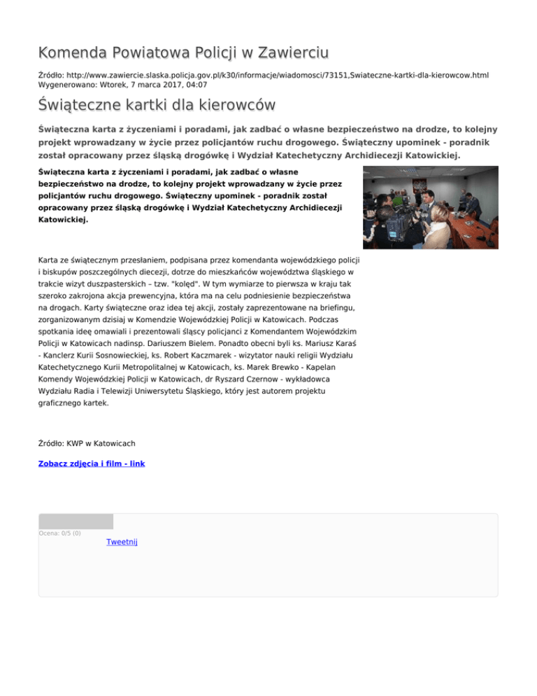 Komenda Powiatowa Policji w Zawierciu Źródło: http://www.zawiercie.slaska.policja.gov.pl/k30/informacje/wiadomosci/73151,Swiateczne-kartki-dla-kierowcow.html Wygenerowano: Wtorek, 7 marca 2017, 04:07 Świąteczne kartki dla kierowców Świąteczna karta z życzeniami i poradami, jak zadbać o własne bezpieczeństwo na drodze, to kolejny projekt wprowadzany w życie przez policjantów ruchu drogowego. Świąteczny upominek - poradnik został opracowany przez śląską drogówkę i Wydział Katechetyczny Archidiecezji Katowickiej. Świąteczna karta z życzeniami i poradami, jak zadbać o własne bezpieczeństwo na drodze, to kolejny projekt wprowadzany w życie przez policjantów ruchu drogowego. Świąteczny upominek - poradnik został opracowany przez śląską drogówkę i Wydział Katechetyczny Archidiecezji Katowickiej. Karta ze świątecznym przesłaniem, podpisana przez komendanta wojewódzkiego policji i biskupów poszczególnych diecezji, dotrze do mieszkańców województwa śląskiego w trakcie wizyt duszpasterskich – tzw. "kolęd". W tym wymiarze to pierwsza w kraju tak szeroko zakrojona akcja prewencyjna, która ma na celu podniesienie bezpieczeństwa na drogach. Karty świąteczne oraz idea tej akcji, zostały zaprezentowane na briefingu, zorganizowanym dzisiaj w Komendzie Wojewódzkiej Policji w Katowicach. Podczas spotkania ideę omawiali i prezentowali śląscy policjanci z Komendantem Wojewódzkim Policji w Katowicach nadinsp. Dariuszem Bielem. Ponadto obecni byli ks. Mariusz Karaś - Kanclerz Kurii Sosnowieckiej, ks. Robert Kaczmarek - wizytator nauki religii Wydziału Katechetycznego Kurii Metropolitalnej w Katowicach, ks. Marek Brewko - Kapelan Komendy Wojewódzkiej Policji w Katowicach, dr Ryszard Czernow - wykładowca Wydziału Radia i Telewizji Uniwersytetu Śląskiego, który jest autorem projektu graficznego kartek. Źródło: KWP w Katowicach Zobacz zdjęcia i film - link Ocena: 0/5 (0) Tweetnij