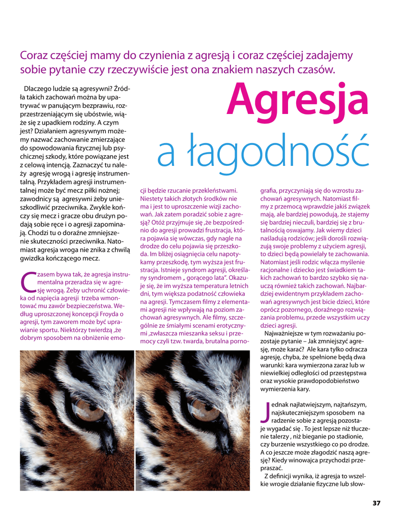 Coraz częściej mamy do czynienia z agresją i coraz częściej zadajemy sobie pytanie czy rzeczywiście jest ona znakiem naszych czasów. Dlaczego ludzie są agresywni? Źródła takich zachowań można by upatrywać w panującym bezprawiu, rozprzestrzeniającym się ubóstwie, wiąże się z upadkiem rodziny. A czym jest? Działaniem agresywnym możemy nazwać zachowanie zmierzające do spowodowania fizycznej lub psychicznej szkody, które powiązane jest z celową intencją. Zaznaczyć tu należy agresję wrogą i agresję instrumentalną. Przykładem agresji instrumentalnej może być mecz piłki nożnej; zawodnicy są agresywni żeby unieszkodliwić przeciwnika. Zwykle kończy się mecz i gracze obu drużyn podają sobie ręce i o agresji zapominają. Chodzi tu o doraźne zmniejszenie skuteczności przeciwnika. Natomiast agresja wroga nie znika z chwilą gwizdka kończącego mecz. C zasem bywa tak, że agresja instrumentalna przeradza się w agresję wrogą. Żeby uchronić człowieka od napięcia agresji trzeba wmontować mu zawór bezpieczeństwa. Według uproszczonej koncepcji Froyda o agresji, tym zaworem może być uprawianie sportu. Niektórzy twierdzą ,że dobrym sposobem na obniżenie emo- Agresja a łagodność cji będzie rzucanie przekleństwami. Niestety takich złotych środków nie ma i jest to uproszczenie wizji zachowań. Jak zatem poradzić sobie z agresją? Otóż przyjmuje się ,że bezpośrednio do agresji prowadzi frustracja, która pojawia się wówczas, gdy nagle na drodze do celu pojawia się przeszkoda. Im bliżej osiągnięcia celu napotykamy przeszkodę, tym wyższa jest frustracja. Istnieje syndrom agresji, określany syndromem „ gorącego lata”. Okazuje się, że im wyższa temperatura letnich dni, tym większa podatność człowieka na agresji. Tymczasem filmy z elementami agresji nie wpływają na poziom zachowań agresywnych. Ale filmy, szczególnie ze śmiałymi scenami erotycznymi ,zwłaszcza mieszanka seksu i przemocy czyli tzw. twarda, brutalna porno- grafia, przyczyniają się do wzrostu zachowań agresywnych. Natomiast filmy z przemocą wprawdzie jakiś związek mają, ale bardziej powodują, że stajemy się bardziej nieczuli, bardziej się z brutalnością oswajamy. Jak wiemy dzieci naśladują rodziców; jeśli dorośli rozwiązują swoje problemy z użyciem agresji, to dzieci będą powielały te zachowania. Natomiast jeśli rodzic włącza myślenie racjonalne i dziecko jest świadkiem takich zachowań to bardzo szybko się nauczą również takich zachowań. Najbardziej ewidentnym przykładem zachowań agresywnych jest bicie dzieci, które oprócz pozornego, doraźnego rozwiązania problemu, przede wszystkim uczy dzieci agresji. Najważniejsze w tym rozważaniu pozostaje pytanie – Jak zmniejszyć agresję, może karać? Ale kara tylko odracza agresję, chyba, że spełnione będą dwa warunki: kara wymierzona zaraz lub w niewielkiej odległości od przestępstwa oraz wysokie prawdopodobieństwo wymierzenia kary. J ednak najłatwiejszym, najtańszym, najskuteczniejszym sposobem na radzenie sobie z agresją pozostaje wygadać się . To jest lepsze niż tłuczenie talerzy , niż bieganie po stadionie, czy burzenie wszystkiego co po drodze. A co jeszcze może złagodzić naszą agresję? Kiedy winowajca przychodzi przepraszać. Z definicji wynika, iż agresja to wszelkie wrogie działanie fizyczne lub słow- 37 ne, zwykle gwałtowne, będące na ogół reakcją na frustrację. Jej celem jest zadanie bólu i cierpienia podmiotowi naszych działań; poprzedzona jest ona zazwyczaj złością i gniewem. Druga definicja opiera się na twierdzeniu, że agresja jest działaniem intencjonalnym, ukierunkowanym na zranienie lub sprawienie bólu, ale jest to niejako efekt uboczny podjętego działania (zgodnie z zasadą cel uświęca środki). Trzeba jednak odróżnić agresję wrogą od instrumentalnej. Tę pierwszą przeważnie poprzedza gniew, a jej celem jest dotkliwe zadanie bólu lub zranienie psychiczne. Efektem agresji instrumentalnej może być również ból i zranienie, ale nie stanowi w tym przypadku celu podjętego działania. K olejnym czynnikiem jest poczucie wywołane spostrzeżeniem, że ktoś posiada mniej czegoś niż zasługuje lub pozwolono mu mniej oczekiwać, lub też posiada mniej niż ludzie do niego podobni. Wystąpienie agresji może być związane z pragnieniem odwetu. Gdy spotykamy się z tego typu zachowaniem wobec naszej osoby, zazwyczaj chcemy zrewanżować się tym samym. Nie zawsze jednak odpowiadamy agresją na agresję. Nie robimy tego, gdy wcześniej wiedzieliśmy, kto i dlaczego mógł się wobec nas tak zachować. Agresja może być także odpowiedzią na psychologiczne zagrożenie obrazu własnej osoby, osobistej godności, czy też obniżenie samooceny. Zachowanie tego typu np. zaatakowanie kogoś, stanowi często sposób na odbudowanie swojej pozycji, albo jest próbą podniesienia szacunku dla samego siebie. Negatywne efekty przynosi zarówno tłumienie uczuć, jak i ich swobodna ekspresja. Istnieją jednak formy wyrażania gniewu, które nie pociągają za sobą agresji. Na przykład powiedzenie o swojej złości łagodzi napięcie i poprawia samopoczucie, przynosi więcej korzyści niż krzyki, przekleństwa, rzucanie przedmiotami lub cierpienie w milczeniu. Najlepiej, gdy bezpośrednio możemy powiedzieć o gniewie tej osobie, która go wywołała. Jeśli z różnych powodów nie jest to możliwe, korzystne 38 jest podzielenie się swymi uczuciami z innymi. Nie odczuwamy agresji, jeśli jesteśmy przekonani, że ten, kto wywołał naszą złość, nie miał takich zamiarów i intencji. Skutecznie przeciwdziałać naszej agresji może też osoba, która się do niej przyczyniła. Wystarczy, że poczuje się odpowiedzialna za swój czyn i obieca poprawę. Jednym ze sposobów zapobiegania agresji jest rozwijanie umiejętności interpersonalnych. Warto, by ludzie od wczesnego dzieciństwa mieli możliwoś