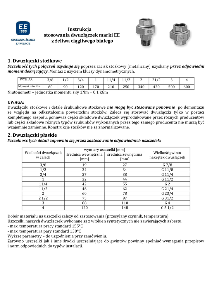 Instrukcja stosowania dwuzłączek marki EE z żeliwa ciągliwego