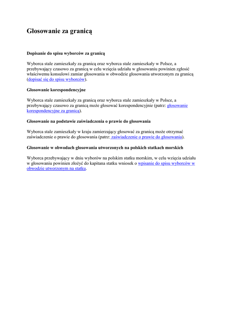 Głosowanie za granicą Dopisanie do spisu wyborców za granicą Wyborca stale zamieszkały za granicą oraz wyborca stale zamieszkały w Polsce, a przebywający czasowo za granicą w celu wzięcia udziału w głosowaniu powinien zgłosić właściwemu konsulowi zamiar głosowania w obwodzie głosowania utworzonym za granicą (dopisać się do spisu wyborców). Głosowanie korespondencyjne Wyborca stale zamieszkały za granicą oraz wyborca stale zamieszkały w Polsce, a przebywający czasowo za granicą może głosować korespondencyjnie (patrz: głosowanie korespondencyjne za granicą). Głosowanie na podstawie zaświadczenia o prawie do głosowania Wyborca stale zamieszkały w kraju zamierzający głosować za granicą może otrzymać zaświadczenie o prawie do głosowania (patrz: zaświadczenie o prawie do głosowania). Głosowanie w obwodach głosowania utworzonych na polskich statkach morskich Wyborca przebywający w dniu wyborów na polskim statku morskim, w celu wzięcia udziału w głosowaniu powinien złożyć do kapitana statku wniosek o wpisanie do spisu wyborców w obwodzie utworzonym na statku.