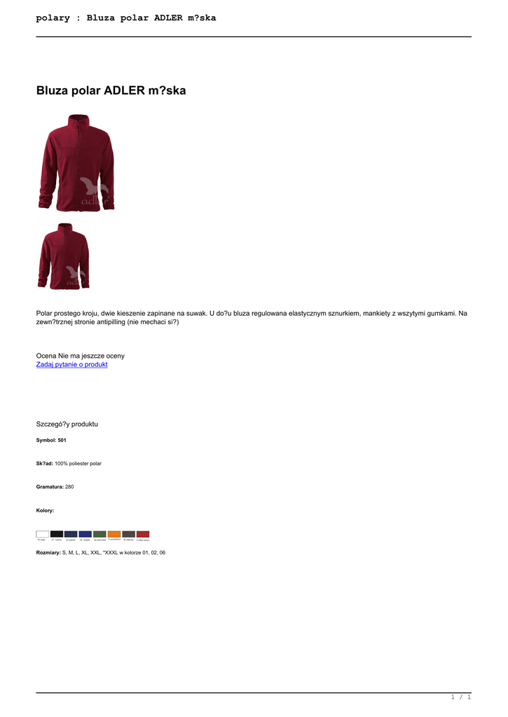 polary : Bluza polar ADLER m?ska Bluza polar ADLER m?ska Polar prostego kroju, dwie kieszenie zapinane na suwak. U do?u bluza regulowana elastycznym sznurkiem, mankiety z wszytymi gumkami. Na zewn?trznej stronie antipilling (nie mechaci si?) Ocena Nie ma jeszcze oceny Zadaj pytanie o produkt Szczegó?y produktu Symbol: 501 Sk?ad: 100% poliester polar Gramatura: 280 Kolory: Rozmiary: S, M, L, XL, XXL, *XXXL w kolorze 01, 02, 06 1 / 1 Powered by TCPDF (www.tcpdf.org)