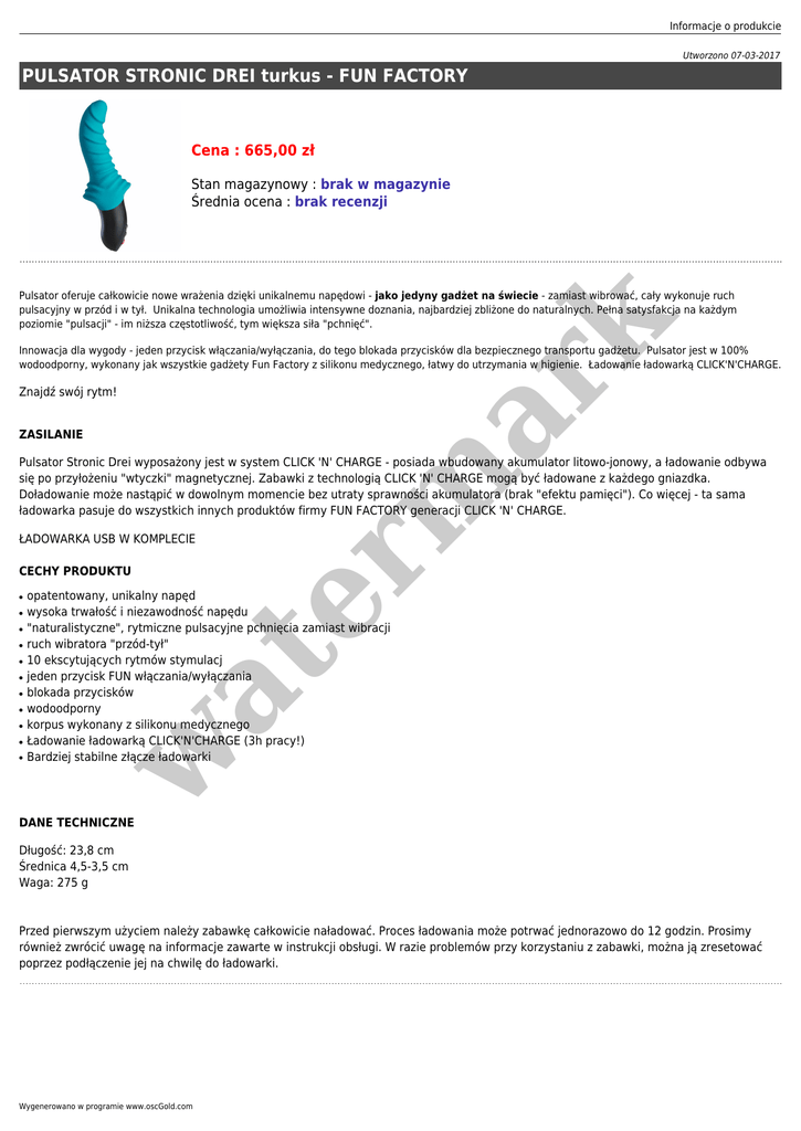 Informacje o produkcie Utworzono 07-03-2017 PULSATOR STRONIC DREI turkus - FUN FACTORY Cena : 665,00 zł Stan magazynowy : brak w magazynie Średnia ocena : brak recenzji er m ar k Pulsator oferuje całkowicie nowe wrażenia dzięki unikalnemu napędowi - jako jedyny gadżet na świecie - zamiast wibrować, cały wykonuje ruch pulsacyjny w przód i w tył. Unikalna technologia umożliwia intensywne doznania, najbardziej zbliżone do naturalnych. Pełna satysfakcja na każdym poziomie "pulsacji" - im niższa częstotliwość, tym większa siła "pchnięć". Innowacja dla wygody - jeden przycisk włączania/wyłączania, do tego blokada przycisków dla bezpiecznego transportu gadżetu. Pulsator jest w 100% wodoodporny, wykonany jak wszystkie gadżety Fun Factory z silikonu medycznego, łatwy do utrzymania w higienie. Ładowanie ładowarką CLICK'N'CHARGE. Znajdź swój rytm! ZASILANIE Pulsator Stronic Drei wyposażony jest w system CLICK 'N' CHARGE - posiada wbudowany akumulator litowo-jonowy, a ładowanie odbywa się po przyłożeniu "wtyczki" magnetycznej. Zabawki z technologią CLICK 'N' CHARGE mogą być ładowane z każdego gniazdka. Doładowanie może nastąpić w dowolnym momencie bez utraty sprawności akumulatora (brak "efektu pamięci"). Co więcej - ta sama ładowarka pasuje do wszystkich innych produktów firmy FUN FACTORY generacji CLICK 'N' CHARGE. ŁADOWARKA USB W KOMPLECIE CECHY PRODUKTU ● ● ● ● ● ● ● ● ● opatentowany, unikalny napęd wysoka trwałość i niezawodność napędu "naturalistyczne", rytmiczne pulsacyjne pchnięcia zamiast wibracji ruch wibratora "przód-tył" 10 ekscytujących rytmów stymulacj jeden przycisk FUN włączania/wyłączania blokada przycisków wodoodporny korpus wykonany z silikonu medycznego Ładowanie ładowarką CLICK'N'CHARGE (3h pracy!) Bardziej stabilne złącze ładowarki at ● w ● DANE TECHNICZNE Długość: 23,8 cm Średnica 4,5-3,5 cm Waga: 275 g Przed pierwszym użyciem należy zabawkę całkowicie naładować. Proces ładowania może potrwać jednorazowo do 12 godzin. Prosimy również zwrócić uwagę na informacje zawarte w instrukcji obsługi. W razie problemów przy korzystaniu z zabawki, można ją zresetować poprzez podłączenie jej na chwilę do ładowarki. Wygenerowano w programie www.oscGold.com