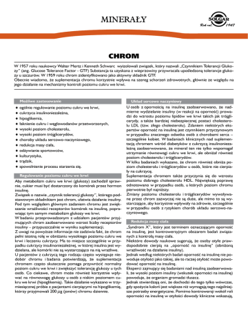 MINERAŁY Chrom W 1957 roku naukowcy Walter Mertz i Kenneth Schwarc wyizolowali związek, który nazwali „Czynnikiem Tolerancji Glukozy” (ang. Glucose Tolerance Factor - GTF) Substancja ta uzyskana z wieprzowiny przywracała upośledzoną tolerancje glukozy u szczurów. W 1959 roku chrom zidentyfikowano jako aktywny składnik GTF. Obecnie wiadomo, że suplementacja chromu korzystnie wpływa na szereg schorzeń zdrowotnych, głównie ze względu na jego działanie na mechanizmy kontroli poziomu cukru we krwi. Możliwe zastosowanie ♦ ogólnie regulowanie poziomu cukru we krwi, ♦ cukrzyca insulinoniezależna, ♦ hipoglikemia, ♦ łaknienie cukru i węglowodanów przetworzonych, ♦ wysoki poziom cholesterolu, ♦ wysoki poziom trójglicerydów, ♦ choroby układu sercowo-naczyniowego, ♦ redukcja masy ciała, ♦ odżywianie sportowców, ♦ kulturystyka, ♦ trądzik, ♦ spowolnienie procesu starzenia się. Regulowanie poziomu cukru we krwi Aby metabolizm cukru we krwi (glukozy) zachodził sprawnie, cukier musi być dostarczony do komórek przez hormon insulinę. Związek o nazwie „czynnik tolerancji glukozy”, którego podstawowym składnikiem jest chrom, ułatwia działanie insuliny. Pod tym względem głównym zadaniem chromu jest zwiększanie wrażliwości receptorów komórek na insulinę, poprawiając tym samym metabolizm glukozy we krwi. W badaniu przeprowadzonym z udziałem pacjentów przyjmujących chrom zaobserwowano wzrost liczby receptorów insuliny – przypuszczalnie w wyniku suplementacji. Z uwagi na powyższe informacje nie zadziwia fakt, że chrom pełni istotną rolę w obniżaniu wysokiego poziomu cukru we krwi i leczeniu cukrzycy. Ma to miejsce szczególnie w przypadku cukrzycy insulinoniezależnej, w której insulina jest wydzielana, ale komórki nie są wystarczająco na nią wrażliwe. U pacjentów z cukrzycą tego rodzaju często występuje niedobór chromu i badania potwierdzają, że suplementacja chromem często skutecznie pomaga przywrócić normalny poziom cukru we krwi i zwiększyć tolerancję glukozy u tych osób. Co ciekawe, chrom może również korzystnie wpływać na równowagę glukozy u osób z niskim poziomem cukru we krwi (hipoglikemią). Takie działanie wykazano w trzymiesięcznej próbie z pacjentami cierpiącymi na hipoglikemię, którzy przyjmowali 200 µg (jonów) chromu dziennie. Układ sercowo naczyniowy U osób z opornością na insulinę zaobserwowano, że nadmierne wydzielanie insuliny (w reakcji na oporność) prowadzi do wzrostu poziomu lipidów we krwi takich jak trójglicerydy, a także bardziej niebezpiecznej postaci cholesterolu LDL (tzw. złego cholesterolu). Zdaniem niektórych ekspertów oporność na insulinę jest czynnikiem przyczynowym w przypadku znacznego odsetka osób z chorobami serca – szczególnie kobiet. W badaniach klinicznych nad suplementacją chromem wśród diabetyków z cukrzycą insulinoniezależną zaobserwowano, że minerał ten nie tylko wspomagał utrzymanie równowagi cukru we krwi, ale obniżał również poziom cholesterolu i trójglicerydów. W kilku badaniach wykazano, że chrom również obniża poziom cholesterolu i trójglicerydów u osób, które nie cierpiały na cukrzycę. Suplementacja chromem także przyczynia się do wzrostu poziomu dobrego cholesterolu HDL. Największą poprawę odnotowano w przypadku osób, u których poziom chromu pierwotnie był najniższy. Zmiany poziomu cholesterolu i trójglicerydów wywoływane przez chrom zazwyczaj nie są duże, ale mimo to są wystarczające, aby korzystnie wpływały na zdrowie, szczególnie w przypadku osób z ryzykiem chorób układu sercowo-naczyniowego. Redukcja masy ciała „Syndrom X”, który jest terminem oznaczającym oporność na insulinę, jest kontrowersyjnym obszarem badań związanych z kontrolą masy ciała. Niektóre dowody naukowe sugerują, że osoby otyłe prawdopodobnie cierpią na „oporność na insulinę” (obniżoną wrażliwość na działanie insuliny). Jednak według niektórych badań oporność na insulinę nie powoduje otyłości jako takiej, ale to raczej otyłość może powodować oporność na insulinę. Eksperci zajmujący się badaniami nad insuliną zaobserwowali, że wysoki poziom insuliny (wskutek oporności na insulinę) powoduje, że organizm gromadzi tłuszcz. Jednak stwierdzają oni, że dochodzi do tego tylko wówczas, gdy spożycie kalorii jest większe niż wymagają tego najpilniejsze potrzeby energetyczne. Pomimo kontrowersji wokół roli oporności na insulinę w otyłości dowody kliniczne wskazują, MINERAŁY że suplementacja chromem może przyśpieszyć tempo utraty tkanki tłuszczowej. Na przykład w jednej z prób klinicznych stwierdzono, że suplementacja chromem w ilości 200 µg lub 400 µg przez 2,5 miesiąca prowadzi do utraty odpowiednio ok. 1,5 kg i nieco ponad 2 kg. Mężczyźni odnosili największe korzyści i tracili ok. siedmiokrotnie więcej masy ciała niż osoby przyjmujące placebo. Ponadto wzrastała masa mięśni. Niewątpliwie korzyści wynikające z suplementacji chromem dla redukcji masy ciała wynikają głównie z połączenia niższego poziomu insuliny, mniejszej oporności na insulinę i większych możliwości spalania tłuszczów dzięki przyrostowi masy mięśniowej i lepszej kontroli apetytu. Odżywianie sportowców Oprócz wpływania na transport cukru do komórek insulina również ułatwia docieranie aminokwasów do komórek mięśniowych. Może to – co najmniej częściowo – tłumaczyć wpływ chromu na masę mięśniową.Badania wskazujące na możliwość zwiększania tempa przyrostu masy mięśniowej i utraty tkanki tłuszczowej dzięki suplementacji chromem wzbudziły duże zainteresowanie w zakresie odżywania osób uprawiających sport. W jednej z prób klinicznych przyrost masy mięśniowej u uczestników przyjmujących 200 µg chromu codziennie przez 2,5 miesiąca wyniósł ok. 0,7 kg. Wyniki te w połączeniu ze znaczną utratą 
