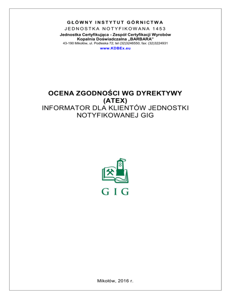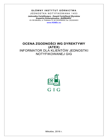 GŁÓWNY INSTYTUT GÓRNICTWA JEDNOSTKA NOTYFIKOWANA 1453 Jednostka Certyfikująca - Zespół Certyfikacji Wyrobów Kopalnia Doświadczalna „BARBARA” 43-190 Mikołów, ul. Podleska 72; tel (32)3246550; fax: (32)3224931 www.KDBEx.eu OCENA ZGODNOŚCI WG DYREKTYWY (ATEX) INFORMATOR DLA KLIENTÓW JEDNOSTKI NOTYFIKOWANEJ GIG Mikołów, 2016 r. Szanowni klienci Zespołu Certyfikacji Wyrobów Kopalni Doświadczalnej „BARBARA” Głównego Instytutu Górnictwa Mamy przyjemność przedstawić Państwu informator zawierający podstawowe informacje odnośnie zasad przeprowadzania oceny zgodności wg dyrektywy ATEX w Głównym Instytucie Górnictwa (Jednostka Notyfikowana nr 1453). W ramach struktury Jednostki Notyfikowanej GIG, oceny te przeprowadzane są przez pracowników Zespołu Certyfikacji Wyrobów Kopalni Doświadczalnej „BARBARA”. strona 2 z 16 SPIS TREŚCI 1 Wstęp ............................................................................................................................... 4 2 Informacje ogólne – wybór procedury oceny zgodności .................................................... 4 3 Terminy i definicje ............................................................................................................ 4 4 Poufność .......................................................................................................................... 5 5 Wniosek i realizacja .......................................................................................................... 5 Moduł badanie typu UE (moduł B) ........................................................................... 9 Moduł: zgodność z typem w oparciu o weryfikację produktu (moduł F) ................... 10 Moduł: zgodność z typem w oparciu o wewnętrzną kontrolę produkcji oraz badanie produktów pod nadzorem (moduł C1) ....................................................... 10 5.4 Moduł: zgodność w oparciu o weryfikację jednostkową (mod uł G) ......................... 11 5.5 Przechowywanie dokumentacji .............................................................................. 11 Badania laboratoryjne ..................................................................................................... 12 5.1 5.2 5.3 6 7 Zasady wykorzystywania wyników badań wykonanych przed złożeniem wniosku ................................................................................................................. 12 6.2 Badania wykonywane w innych laboratoriach ........................................................ 12 Nadzór nad certyfikatem ................................................................................................. 12 8 7.1 Moduł B - Certyfikat badania typu UE .................................................................... 13 7.2 Moduł C1 - Certyfikat zgodności ............................................................................ 13 7.3 Moduł F - Certyfikat zgodności .............................................................................. 13 7.4 Moduł G - Certyfikat zgodności .............................................................................. 13 Zmiana treści i zakresu certyfikatu.................................................................................. 13 9 Ograniczenie, zawieszenie lub cofnięcie certyfikatu ........................................................ 13 6.1 9.1 Ograniczanie certyfikatu ........................................................................................ 14 9.2 Zawieszenie certyfikatu ......................................................................................... 14 9.3 Cofnięcie certyfikatu .............................................................................................. 14 10 Skargi i odwołania .......................................................................................................... 14 11 Struktura dokumentacji oceny ......................................................................................... 15 12 Dane adresowe i kontakt ................................................................................................ 16 13 Wsparcie merytoryczne .................................................................................................. 16 strona 3 z 16 OCENA ZGODNOŚCI WG DYREKTYWY (ATEX) INFORMATOR DLA KLIENTÓW JEDNOSTKI NOTYFIKOWANEJ GIG 1 Wstęp Niniejszy informator został opracowany w celu przekazania podstawowych informacji odnośnie zasad przeprowadzania oceny zgodności wg dyrektywy ATEX w Głównym Instytucie Górnictwa (Jednostka Notyfikowana nr 1453). 2 Informacje ogólne – wybór procedury oceny zgodności Proces oceny zgodności można podzielić na dwa podstawowe etapy: oceny zgodności ko nstrukcji reprezentatywnego egzemplarza oraz oceny procesu produkcji. Ocena konstrukcji pozwala stwierdzić czy koncepcja, projekt i konstrukcja wyrobu są zgodne z ESHR (wymagania dyrektywy). Przeprowadzenie pełnej oceny wszystkich egzemplarzy wyrobu byłoby ni epraktyczne i pociągałoby za sobą ogromne koszty. Zatem przeprowadza się jedynie ocenę reprezentatywnej próbki tzw. typu, którą może być pojedynczy egzemplarz wyrobu, określona grupa wyrobów lub poszczególne części składowe wyrobu. Obowiązki producenta dotyczące oceny zgodności urządzeń, oznakowania CE, deklaracji zgodności, przechowywania deklaracji zgodności wraz z dokumentacją techniczną zostały sformułowane w artykułach 8 i 10 dyrektywy (ATEX). Dobór odpowiedniej procedury oceny zgodności leży w obowiązkach producenta. Wybór właściwej procedury oceny zgodności w yrobu jest uzależniony od rodzaju wyrobu tzn. grupy wybuchowości oraz kategorii wyrobu wg dyrektywy (ATEX). Szczegółowe informacje nt. wyboru procedury oceny zgodności zostały zamieszczone w Poradniku "ATEX - Wytyczne wdrażania" dostępnym pod adresem www.kdbex.eu. 3 Terminy i definicje W dalszej części niniejszego dokumentu stosuje się nastę
