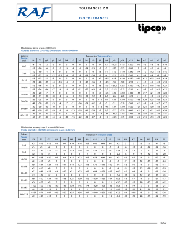 RAF TOLER ANC JE ISO ISO TOLER ANCES INC. Dla średnic zewn. w um= 0,001 mm Outside diameters (SHAFTS): Dimensions in um=0,001mm Zakres Range mm 0≥3 3≥6 6≥10 10≥18 18≥30 30≥50 50≥80 80≥125 Tolerancje / Tolerance Class f6 f7 g5 g6 h3 h4 h5 h6 h8 h9 j6 js6 js9 js14 js15 k6 m5 m6 n5 n6 -6 -6 -2 -2 0 0 0 0 0 0 +4 +3 +125 +125 +200 +6 +6 +8 +8 +10 -12 -16 -6 -8 -2 -3 -4 -6 -14 -25 -2 -3 -125 -125 -200 0 +2 +2 +4 +4 -10 -10 -4 -4 0 0 0 0 0 0 +6 +4 +15 +150 +240 +9 +9 +12 +13 +16 -18 -22 -9 -12 -2,5 -4 -5 -8 -18 -30 -2 -4 -15 -150 -240 +1 +4 +4 +8 +8 -13 -13 -5 -5 0 0 0 0 0 0 +7 +4,5 +18 +180 +290 +10 +12 +15 +16 +19 -22 -28 -11 -14 -2,5 -4 -6 -9 -22 -36 -2 +4,5 -18 -180 -290 +1 +6 +6 +10 +10 -16 -16 -6 -6 0 0 0 0 0 0 +8 +5,5 +21,5 +215 +350 +12 +15 +18 +20 +23 -27 -34 -14 -17 -3 -5 -8 -11 -27 -43 -3 -5,5 -21,5 -215 -350 +1 +7 +7 +12 +12 -20 -20 -7 -7 0 0 0 0 0 0 +9 +6,5 +26 +260 +420 +15 +17 +21 +24 +28 -33 -41 -16 -20 -4 -6 -9 -13 -33 -52 -4 -6,5 -26 -260 -420 +1 +8 +8 +15 +15 -25 -25 -9 -9 0 0 0 0 0 0 +11 +8 +31 +310 +500 +18 +20 +25 +28 +33 -41 -50 -20 -25 -4 -7 -11 -16 -39 -62 -8 -5 -31 -310 -500 +2 +9 +9 +17 +17 -30 -30 -10 -10 0 0 0 0 0 0 +12 +9,5 +37 +370 +600 +21 +24 +30 +33 +39 -49 -60 -23 -29 -5 -8 -13 -19 -46 -74 -7 -9,5 -37 -370 -600 +2 +11 +11 +20 +20 -36 -36 -12 -12 0 0 0 0 0 0 +13 +11 +43,5 +435 +700 +25 +28 +35 +38 +45 -58 -71 -27 -34 -6 -10 -15 -22 -54 -87 -9 -11 -43,5 -435 -700 +3 +13 +13 +23 +23 Dla średnic wewnętrznych w um=0,001 mm Inside diameters (BORES): dimensions in um=0,001mm Zakres Range mm 0≥3 3≥6 6≥10 10≥18 18≥30 30≥50 50≥80 80≥125 Tolerancje / Tolerance Class E8 F7 G7 H5 H6 H7 H8 H9 H10 H11 J7 JS5 K6 K7 M6 M7 P9 P7 +28 +16 +12 +4 +6 +10 +14 +25 +40 +60 +4 +2 0 0 -2 -2 -6 -6 -16 +14 +5 +2 0 0 0 0 0 0 0 -5 -2 -6 -10 -8 -12 -12 +38 +22 +16 +5 +8 +12 +18 +30 +48 +75 +6 +2,5 +2 +3 -1 0 -9 -8 +20 +10 +4 0 0 0 0 0 0 0 -6 -2,5 -6 -9 -9 -12 -17 -20 +47 +28 +20 +6 +9 +15 +22 +35 +58 +90 +8 +3 +2 +5 -3 0 -12 -9 +25 +13 +5 0 0 0 0 0 0 0 -7 -3 -7 -10 -12 -15 -21 -24 +59 +34 +24 +8 +11 +18 +27 +43 +70 +110 +10 +4 +2 +6 -4 0 -15 -11 +32 +16 +8 0 0 0 0 0 0 0 -8 -4 -9 -12 -15 -18 -26 -29 +73 +41 +28 +9 +13 +21 +33 +52 +84 +130 +12 +4,5 +2 +6 -4 0 -18 -14 +40 +20 +7 0 0 0 0 0 0 0 -9 -4,5 -11 -15 -17 -21 -31 -35 +89 +50 +34 +11 +16 +25 +39 +62 +100 +160 +14 +5,5 +3 +7 -4 0 -21 -17 +50 +25 +9 0 0 0 0 0 0 0 -11 +5,5 -13 -18 -20 -25 -37 -42 +106 +50 +40 +13 +19 +30 +46 +74 +120 +190 +18 +6,5 +4 +9 -5 0 -26 -21 +60 +30 +10 0 0 0 0 0 0 0 -12 +6,5 -15 -21 -24 -30 -45 -51 +125 +71 +47 +15 +22 +35 +54 +87 +140 +220 +22 +7,5 +4 +10 -6 0 -30 -24 +72 +36 +12 0 0 0 0 0 0 0 -13 -7,5 -18 -25 -28 -35 -52 -59 B/57