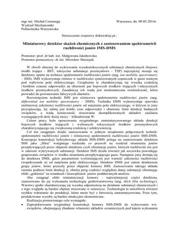 mgr inż. Michał Ceremuga Wydział Mechatroniki Politechnika Warszawska Warszawa, dn. 09.05.2014r. Streszczenie rozprawy doktorskiej pt.: Miniaturowy detektor skażeń chemicznych z zastosowaniem spektrometrii ruchliwości jonów IMS-DMS Promotor: prof. dr hab. inż. Małgorzata Jakubowska Promotor pomocniczy: dr inż. Mirosław Maziejuk W chwili obecnej do wykrywania wysokotoksycznych substancji chemicznych (bojowe środki trujące - BST, toksyczne substancje przemysłowe - TSP) najczęściej stosuje się detektory oparte na technice spektrometrii ruchliwości jonów (ang. ion mobility spectrometry – IMS). IMS wykorzystuje różnice w ruchliwości zjonizowanych cząsteczek w gazie nośnym pod wpływem pola elektrycznego. Urządzenia te charakteryzują się wysoką czułością i krótkim czasem odpowiedzi na obecność par bojowych środków trujących i toksycznych środków przemysłowych. Zasadniczą ich wadą jest niedostateczna rozdzielczość, która prowadzi do powstawania fałszywych alarmów. Rozwinięciem techniki IMS jest różnicowa spektrometria ruchliwości jonów (ang. differential ion mobility spectrometry – DMS). Technika DMS wykorzystuje zjawisko nieliniowej zależności ruchliwości jonów od natężenia pola elektrycznego, w którym te jony przyspieszają. Jej zaletą jest krótki czas odpowiedzi i obniżony limit detekcji badanych związków, a wadą konieczność stosowania skomplikowanych układów zasilania wymagających dość dużej mocy – kilkadziesiąt W. Celem pracy było opracowanie oryginalnego zminiaturyzowanego układu detekcji bojowych środków trujących i wybranych toksycznych środków przemysłowych charakteryzującego się zwiększoną czułością i selektywnością. Cel ten osiągnięto dzięki zastosowaniu w jednym urządzeniu połączonych technik: spektrometrii ruchliwości jonów i różnicowej spektrometrii ruchliwości jonów IMS-DMS. Koncepcja konstrukcji hybrydowego układu IMS-DMS polega na zastosowaniu detektora IMS jako „filtru” wstępnego rozdziału co pozwoli na rozdział strumienia jonów przepływających przez objętość detektora czyli eliminacje jonów, których ruchliwość nie jest w zakresie wykrywanych substancji. Detektor IMS działa również jak soczewka powodując grupowanie związków w środku strumienia przepływającego gazu. Następnie jony dostają się do detektora DMS, gdzie parametrem wyróżniającym jest wartość zależności ruchliwości (współczynnik α) od natężenia pola elektrycznego. Detektor DMS jest zatem detektorem grupy jonów, które przeszły przez objętość komory IMS. Zastosowanie takiego układu istotnie podnosi limit detekcji tj. obniża próg czułości względem danej substancji eliminując efekt „gubienia” na ściankach i krawędziach jonów poddawanych analizie. Aby osiągnąć efekt miniaturyzacji komory - najważniejszej części detektora, zastosowano do jej wykonania technologię grubowarstwową (ang. thick film technology). Warstwy grube charakteryzują się wysoką odpornością na działanie substancji chemicznych i z tego względu są bardzo chętnie stosowane w sensoryce. Technologia ta umożliwia również szybkie wdrażanie do produkcji, która może być z łatwością zautomatyzowana. Poza tym, produkowane wyroby są bardzo atrakcyjne ekonomiczne. Realizacja postawionego celu wymagała: Zaprojektowania oryginalnej konstrukcji komory IMS-DMS do wykrywania ww. związków, obejmującej zbadanie własności układów ceramicznych pod kątem wykonania detektora IMS-DMS, zaprojektowanie odpowiedniego układu grzewczego, który umożliwi stabilizację temperatury analizowanego gazu, przeprowadzenia badań symulacyjnych opisujących proces przepływu jonów przez spektrometr IMS-DMS stanowiących narzędzie pomocnicze do projektowania komory, określenia wpływu konstrukcji układów generatora wysokiego napięcia na budowę i funkcjonowanie komory, weryfikacji konstrukcji i określenia parametrów układu IMS-DMS. Wykonania oprogramowania symulującego działanie komory w środowisku MATLAB, Opracowania technologii jej wytwarzania opierając się na technologii grubowarstwowej, Dokonania wyboru materiałów do wytworzenia komory na podstawie przeprowadzonych badań, Wykonania demonstratora komory IMS-DMS i zbadania jego własności detekcyjnych wobec BST i TSP, Opracowania i wykonania generatora wysokiego napięcia HSV o parametrach umożliwiających wytworzenie pola elektrycznego w objętości czynnej detektora DMS o wartości do 48 kV/cm (tj. którego napięcie szczytowe dochodziłoby do wartości 1200V). W ww. warunkach obserwuje się silną zależność ruchliwości jonów BST od natężenia pola elektrycznego, co pozwala na dokonywanie identyfikacji ww. związków. Opracowana konstrukcja generatora umożliwia redukcję zapotrzebowania na moc w odniesieniu do komercyjnie dostępnych detektorów DMS, Przebadania układu IMS-DMS na różne narażenia mechaniczno-środowiskowe ( min. udary, wibracje, narażenia temperaturowe i szoki termiczne, zmiany ciśnień, narażenia na deszcz, zapylenie i zabłocenie). W celu osiągnięcia stabilnych termicznie warunków pracy i uzyskania wysokiej czułości detektora oraz obniżenia ilości fałszywych alarmów zostało stworzone stanowisko do badania temperatury komory IMS-DMS. Stabilność termiczna niezbędna jest do poprawnej identyfikacji położenia pików, a tym samym identyfikacji badanej substancji. Stanowisko składało się z: kamery rejestrującej promieniowanie podczerwone, programu do wizualizacji i archiwizacji danych i obrazów, komputera do sterowania oprogramowaniem oraz zasilacza i elementów mocujących mierzone podzespoły. Przeprowadzono badania właściwości wytworzonego układu IMS-DMS. Wykonano pomiary symulantów bojowych środków trujących na przykładzie salicylanu metylu (MS), a następnie na wybranych bojowych środkach trujących i toksycznych środkach przemysłowych. Zdolności detekcy