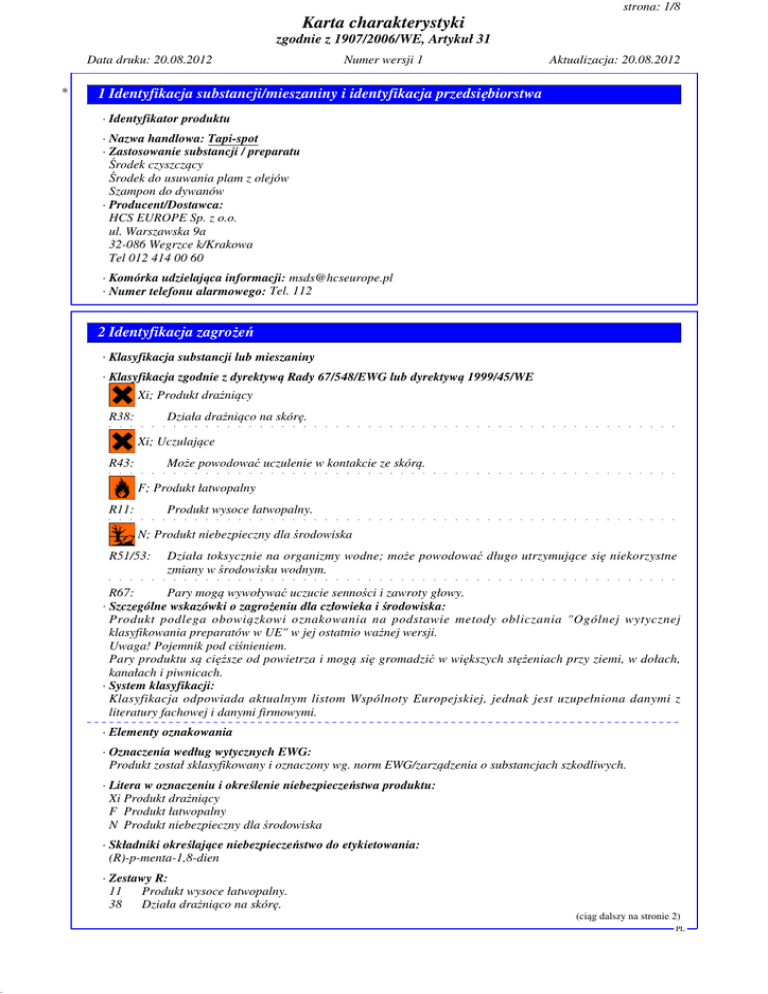 35.0.2 strona: 1/8 Karta charakterystyki zgodnie z 1907/2006/WE, Artykuł 31 Data druku: 20.08.2012 * Numer wersji 1 Aktualizacja: 20.08.2012 1 Identyfikacja substancji/mieszaniny i identyfikacja przedsiębiorstwa · Identyfikator produktu · Nazwa handlowa: Tapi-spot · Zastosowanie substancji / preparatu Środek czyszczący Środek do usuwania plam z olejów Szampon do dywanów · Producent/Dostawca: HCS EUROPE Sp. z o.o. ul. Warszawska 9a 32-086 Wegrzce k/Krakowa Tel 012 414 00 60 · Komórka udzielająca informacji: [email protected] · Numer telefonu alarmowego: Tel. 112 2 Identyfikacja zagrożeń · Klasyfikacja substancji lub mieszaniny · Klasyfikacja zgodnie z dyrektywą Rady 67/548/EWG lub dyrektywą 1999/45/WE Xi; Produkt drażniący R38: Działa drażniąco na skórę. Xi; Uczulające R43: Może powodować uczulenie w kontakcie ze skórą. F; Produkt łatwopalny R11: Produkt wysoce łatwopalny. N; Produkt niebezpieczny dla środowiska R51/53: Działa toksycznie na organizmy wodne; może powodować długo utrzymujące się niekorzystne zmiany w środowisku wodnym. R67: Pary mogą wywoływać uczucie senności i zawroty głowy. · Szczególne wskazówki o zagrożeniu dla człowieka i środowiska: Produkt podlega obowiązkowi oznakowania na podstawie metody obliczania "Ogólnej wytycznej klasyfikowania preparatów w UE" w jej ostatnio ważnej wersji. Uwaga! Pojemnik pod ciśnieniem. Pary produktu są cięższe od powietrza i mogą się gromadzić w większych stężeniach przy ziemi, w dołach, kanałach i piwnicach. · System klasyfikacji: Klasyfikacja odpowiada aktualnym listom Wspólnoty Europejskiej, jednak jest uzupełniona danymi z literatury fachowej i danymi firmowymi. · Elementy oznakowania · Oznaczenia według wytycznych EWG: Produkt został sklasyfikowany i oznaczony wg. norm EWG/zarządzenia o substancjach szkodliwych. · Litera w oznaczeniu i określenie niebezpieczeństwa produktu: Xi Produkt drażniący F Produkt łatwopalny N Produkt niebezpieczny dla środowiska · Składniki określające niebezpieczeństwo do etykietowania: (R)-p-menta-1,8-dien · Zestawy R: 11 Produkt wysoce łatwopalny. 38 Działa drażniąco na skórę. (ciąg dalszy na stronie 2) PL 35.0.2 strona: 2/8 Karta charakterystyki zgodnie z 1907/2006/WE, Artykuł 31 Data druku: 20.08.2012 Numer wersji 1 Aktualizacja: 20.08.2012 Nazwa handlowa: Tapi-spot (ciąg dalszy od strony 1) 43 Może powodować uczulenie w kontakcie ze skórą. 51/53 Działa toksycznie na organizmy wodne; może powodować długo utrzymujące się niekorzystne zmiany w środowisku wodnym. 67 Pary mogą wywoływać uczucie senności i zawroty głowy. · Zestawy S: 37 Nosić odpowiednie rękawice ochronne. 45 W przypadku awarii lub jeżeli źle się poczujesz, niezwłocznie zasięgnij porady lekarza - jeżeli to możliwe, pokaż etykietę. 51 Stosować wyłącznie w dobrze wentylowanych pomieszczeniach. 57 Używać odpowiednich pojemników zapobiegających skażeniu ś rodowiska. 59 Przestrzegać wskazówek producenta lub dostawcy dotyczących odzysku lub wtórnego wykorzystania. · Szczególne oznaczenia określonych preparatów: Pojemnik pod ciśnieniem. Chronić przed słońcem i temperaturą powyżej 50 °C. Nie przekłuwać i nie palić nawet po zużyciu. 69,9 % masy składników jest łatwopalne. Trzymać w miejscu niedostępnym dla dzieci. · Klasyfikacja zgodnie z dyrektywą 75/324/EWG: Produkt skrajnie łatwopalny * 3 Skład/informacja o składnikach · Charakterystyka chemiczna: Mieszaniny · Opis: Mieszanka z niżej wymienionych składników z bezpiecznymi domieszkami. · Składniki niebezpieczne: CAS: 64742-49-0 Benzyna lekka obrabiana wodorem (ropa naftowa) EINECS: 265-151-9 Xn R65 Xi R38 F R11 N R51/53 R67 Flam. Liq. 2, H225; Muta. 1B, H340; Carc. 1B, H350; Asp. Tox. 1, H304 CAS: 74-98-6 propan EINECS: 200-827-9 F+ R12 Flam. Gas 1, H220; Press. Gas, H280 CAS: 106-97-8 butan EINECS: 203-448-7 F+ R12 Flam. Gas 1, H220; Press. Gas, H280 CAS: 5989-27-5 (R)-p-menta-1,8-dien EINECS: 227-813-5 Xi R38 Xi R43 N R50/53 R10 Flam. Liq. 3, H226; Aquatic Acute 1, H400; Aquatic Chronic 1, H410; Skin Irrit. 2, H315; Skin Sens. 1, H317 · Wskazówki dodatkowe: Pełna treść przytoczonych wskazówek dotyczących zagrożeń znajduje się w rozdziale 16. 50-100% 10 < 20% 10 < 20% 2,5 < 5% 4 Środki pierwszej pomocy · Opis środków pierwszej pomocy · Po wdychaniu: Dostarczyć obficie świeże powietrze i dla bezpieczeństwa wezwać lekarza. W przypadku utraty przytomności ułożenie i transport w stabilnej pozycji bocznej. · Po styczności ze skórą: Natychmiast zmyć wodą i mydłem i dobrze spłukać. (ciąg dalszy na stronie 3) PL 35.0.2 strona: 3/8 Karta charakterystyki zgodnie z 1907/2006/WE, Artykuł 31 Data druku: 20.08.2012 Numer wersji 1 Aktualizacja: 20.08.2012 Nazwa handlowa: Tapi-spot (ciąg dalszy od strony 2) · Po styczności z okiem: Płukać oczy z otwartą powieką przez kilka minut pod bieżącą wodą. · Po przełknięciu: Nie powodować wymiotów i sprowadzić lekarza. Przy trwałych dolegliwościach porozumieć się z lekarzem. · Wskazówki dla lekarza: · Najważniejsze ostre i opóźnione objawy oraz skutki narażenia Brak dostępnych dalszych istotnych danych · Wskazania dotyczące wszelkiej natychmiastowej pomocy lekarskiej i szczególnego postępowania z poszkodowanym Brak dostępnych dalszych istotnych danych 5 Postępowanie w przypadku pożaru · Środki gaśnicze · Przydatne środki gaśnicze: CO2, proszek gaśniczy lub strumień wody. Większy pożar zwalczać strumieniem wody lub pianą odporną na działanie alkoholu. · Środki gaśnicze nieprzydatne ze względów bezpieczeństwa: Woda pełnym strumieniem · Szczególne zagrożenia związane z substancją lub mieszaniną Brak dostępnych dalszych istotnych danych · Informacje dla straży pożarnej · Specjalne wyposażenie ochronne: Środki specjalne nie są konieczne. 6 Postępowanie w przypadku niezamierzonego uwolnienia do środowiska 