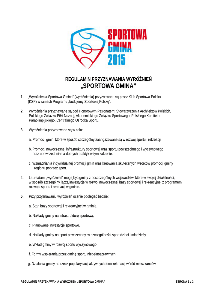 REGULAMIN PRZYZNAWANIA WYRÓŻNIEŃ „SPORTOWA GMINA” 1. „Wyróżnienia Sportowa Gmina” (wyróżnienia) przyznawane są przez Klub Sportowa Polska (KSP) w ramach Programu „budujemy Sportową Polskę”. 2. Wyróżnienia przyznawane są pod Honorowym Patronatem: Stowarzyszenia Architektów Polskich, Polskiego Związku Piłki Nożnej, Akademickiego Związku Sportowego, Polskiego Komitetu Paraolimpijskiego, Centralnego Ośrodka Sportu. 3. Wyróżnienia przyznawane są w celu: a. Promocji gmin, które w sposób szczególny zaangażowane są w rozwój sportu i rekreacji. b. Promocji nowoczesnej infrastruktury sportowej oraz sportu powszechnego i wyczynowego oraz upowszechniania dobrych praktyk w tym zakresie. c. Wzmacniania indywidualnej promocji gmin oraz kreowania skutecznych wzorców promocji gminy i regionu poprzez sport. 4. Laureatami „wyróżnień” mogą być gminy z poszczególnych województw, które w swojej działalności, w sposób szczególny łączą inwestycje w rozwój nowoczesnej bazy sportowej i rekreacyjnej z programem rozwoju sportu i rekreacji w gminie. 5. Przy przyznawaniu wyróżnień ocenie podlegać będzie: a. Stan bazy sportowej i rekreacyjnej w gminie. b. Nakłady gminy na infrastrukturę sportową. c. Planowane inwestycje sportowe. d. Nakłady gminy na sport powszechny, w szczególności sport dzieci i młodzieży. e. Wkład gminy w rozwój sportu wyczynowego. f. Formy wspierania przez gminę sportu niepełnosprawnych. g. Działania gminy na rzecz popularyzacji aktywnych form rekreacji wśród mieszkańców. REGULAMIN PRZYZNAWANIA WYRÓŻNIEŃ „SPORTOWA GMINA” STRONA 1 z 3 d. Rodzaj imprez sportowych i rekreacyjnych organizowanych w gminie oraz zaangażowanie gminy w ich organizację oraz promocję. e. Pomoc gminy w działalności organizacji, stowarzyszeń i klubów sportowych. 6. Proces wyłaniania laureatów jest dwuetapowy. 7. Etap pierwszy. a. Każda gmina, niezależnie od wielkości i ilości mieszkańców może ubiegać się o wyróżnienie. b. Warunkiem przystąpienia do pierwszego etapu jest przesłanie przez gminę wypełnionej i podpisanej przez osobę upoważnioną ankiety weryfikacyjnej. c. Ankieta weryfikacyjna musi być przesłana drogą elektroniczną na adres [email protected] lub pocztą na adres Biura KSP (04-832 Warszawa, ul. Patriotów 174) w wyznaczonym przez organizatora terminie. d. Udział w pierwszym etapie nie podlega opłacie weryfikacyjnej. e. W pierwszym etapie Zarząd KSP dokonuje wstępnej oceny na podstawie ankiet weryfikacyjnych przesłanych przez gminy ubiegające się o wyróżnienie oraz na podstawie informacji zebranych z ogólnie dostępnych źródeł. W oparciu o wstępną ocenę przyznawane są nominacje. f. Wynik oceny w pierwszym etapie ma charakter wewnętrzny i nie jest podawany do publicznej wiadomości. 8. Etap drugi. a) W drugim etapie biorą udział gminy, które otrzymały nominację Zarządu KSP oraz wniosły opłatę weryfikacyjną w wysokości: - 2.150 zł netto – gminy, które posiadają Pakiet Optimum 2015 - 2 850 zł netto – gminy, które są uczestnikami Programu „Budujemy Sportową Polskę” - 3.500 zł netto – opłata podstawowa b) Wyróżnienie „Sportowa Gmina” zostanie przyznane nominowanym gminom przez Kapitułę Wyróżnienia Sportowa Gmina, po przeprowadzeniu szczegółowej analizy zebranych materiałów. c) W trakcie szczegółowej analizy gmina może być poproszona przez Kapitułę o przedstawienie dodatkowych informacji. 9. Zarząd KSP na każdym etapie weryfikacji i oceny może poprosić gminę o przekazanie dodatkowych informacji potwierdzających stopień zaangażowania gminy w rozwój infrastruktury sportowej i rekreacyjnej oraz rozwój sportu powszechnego i wyczynowego w gminie. 10. Wyróżnienia „Sportowa Gmina” wręczane są laureatom podczas uroczystej gali organizowanej w Polskim Komitecie Olimpijskim w Warszawie (ul. Wybrzeże Gdyńskie 4). REGULAMIN PRZYZNAWANIA WYRÓŻNIEŃ „SPORTOWA GMINA” STRONA 2 z 3 11. Po upływie roku laureaci wyróżnienia mogą ubiegać się o tytuł „Sportowa Gmina” na kolejny rok, w uproszczonej procedurze, która obejmuje: a. Wypełnienie oświadczenia potwierdzającego aktywność gminy w obszarze będącym przedmiotem weryfikacji i kontynuacji działań wskazanych w ankiecie składanej w poprzednim procesie przyznania wyróżnienia „Sportowa Gmina”. b. Wniesienia opłaty weryfikacyjnej w wysokości 50% podstawowej opłaty weryfikacyjnej, o której mowa w punkcie 8. niniejszego regulaminu. 12. KSP dla wzmocnienia społecznego przekazu i promocji wyróżnień Sportowa Gmina może pozyskiwać do współpracy patronów, instytucje publiczne, organizacje społeczne, podmioty gospodarcze, media. 13. Lista laureatów wyróżnień kolejnych edycji oraz lista gmin posiadających tytuł „Sportowa Gmina” będzie zamieszczona na stałe w serwisie internetowym www.sportowapolska.eu po zakończeniu każdej edycji wraz z relacją z Gali „Sportowa Gmina”. 14. Laureaci „wyróżnień” mają prawo do posługiwania się tytułem, logo oraz certyfikatem „Sportowa Gmina” we wszystkich prowadzonych przez gminę działaniach statutowych, promocyjnych i reklamowych oraz w kontaktach z instytucjami i podmiotami gospodarczymi w okresie 12 miesięcy od daty otrzymania wyróżnienia. 15. Tytuł, logo oraz certyfikat „Sportowa Gmina” może być używany w oficjalnych materiałach gminy, w materiałach promocyjnych np. folderach, katalogach, kalendarzach, na papierach urzędowych, kopertach wizytówkach, na bilbordach, banerach reklamowych, tablicach drogowych, masztach reklamowych oraz w dowolnej formie podczas imprez organizowanych w gminie, a także w internecie, w reklamach prasowych, radiowych i telewizyjnych. 16. Obsługę merytoryczną procesu wyłaniania i przyznawania wyróżnień zapewnia Biuro KSP, obsługę organizacyjną, finansową oraz promocję projektu „Sportowa Gmina” prowadzi ACRUX Sp. z o.o. - firma