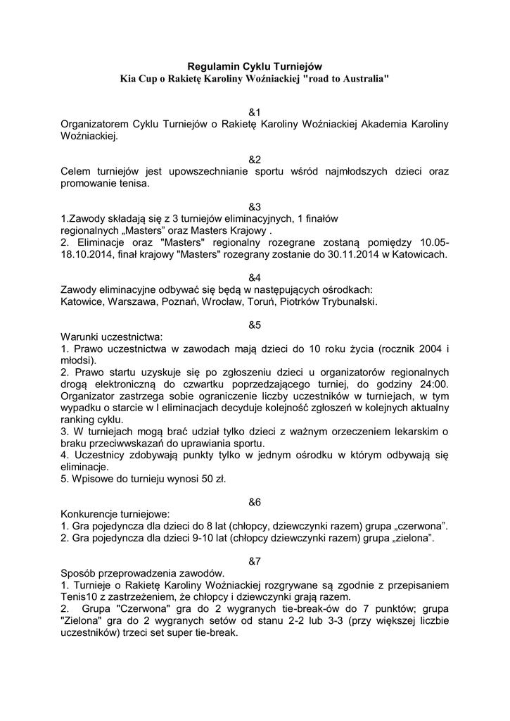 Regulamin Cyklu Turniejów Kia Cup o Rakietę Karoliny Woźniackiej "road to Australia" &1 Organizatorem Cyklu Turniejów o Rakietę Karoliny Woźniackiej Akademia Karoliny Woźniackiej. &2 Celem turniejów jest upowszechnianie sportu wśród najmłodszych dzieci oraz promowanie tenisa. &3 1.Zawody składają się z 3 turniejów eliminacyjnych, 1 finałów regionalnych „Masters” oraz Masters Krajowy . 2. Eliminacje oraz "Masters" regionalny rozegrane zostaną pomiędzy 10.0518.10.2014, finał krajowy "Masters" rozegrany zostanie do 30.11.2014 w Katowicach. &4 Zawody eliminacyjne odbywać się będą w następujących ośrodkach: Katowice, Warszawa, Poznań, Wrocław, Toruń, Piotrków Trybunalski. &5 Warunki uczestnictwa: 1. Prawo uczestnictwa w zawodach mają dzieci do 10 roku życia (rocznik 2004 i młodsi). 2. Prawo startu uzyskuje się po zgłoszeniu dzieci u organizatorów regionalnych drogą elektroniczną do czwartku poprzedzającego turniej, do godziny 24:00. Organizator zastrzega sobie ograniczenie liczby uczestników w turniejach, w tym wypadku o starcie w I eliminacjach decyduje kolejność zgłoszeń w kolejnych aktualny ranking cyklu. 3. W turniejach mogą brać udział tylko dzieci z ważnym orzeczeniem lekarskim o braku przeciwwskazań do uprawiania sportu. 4. Uczestnicy zdobywają punkty tylko w jednym ośrodku w którym odbywają się eliminacje. 5. Wpisowe do turnieju wynosi 50 zł. &6 Konkurencje turniejowe: 1. Gra pojedyncza dla dzieci do 8 lat (chłopcy, dziewczynki razem) grupa „czerwona”. 2. Gra pojedyncza dla dzieci 9-10 lat (chłopcy dziewczynki razem) grupa „zielona”. &7 Sposób przeprowadzenia zawodów. 1. Turnieje o Rakietę Karoliny Woźniackiej rozgrywane są zgodnie z przepisaniem Tenis10 z zastrzeżeniem, że chłopcy i dziewczynki grają razem. 2. Grupa "Czerwona" gra do 2 wygranych tie-break-ów do 7 punktów; grupa "Zielona" gra do 2 wygranych setów od stanu 2-2 lub 3-3 (przy większej liczbie uczestników) trzeci set super tie-break. 3. Dzieci w poszczególnych turniejach zdobywają punkty wg załącznika. Do punktacji końcowej liczą się 2 rozegrane turnieje. 4. W finałach regionalnych „Masters” w grupie "Czerwonej" startuje 16 najwyżej notowanych w rankingu regionalnym zawodników, w grupie "Zielonej" 8 najwyżej notowanych w rankingu regionalnym zawodników. 5. W finale krajowym „Masters” zawodnicy, którzy zdobyli 1-2 miejsca finałach regionalnych. &8 Ogłoszenie wyników. 1. Wyniki będą ogłaszane bezpośrednio po zawodach oraz na stronie www.akademiakarolinywozniackiej.pl . 2. Lista dzieci, która zakwalifikuje się do finałów „Masters” zostanie także ogłoszona na stronie w/w stronie. &9 Nagrody. 1. Każdy uczestnik otrzyma pamiątkowy dyplom. 2. Zawodnicy zajmujący 1-4 miejsca w zawodach eliminacyjnych puchary/medale, dyplomy, upominki. 3. Zawodnicy zajmujący 1-4 miejsca w finałach regionalnych puchary/medale, dyplomy, nagrody. 4. Zwycięscy finału ogólnopolskiego Puchar oraz rakietę Karoliny Woźniackiej z autografem, roczny kontrakt sprzętowy z "Babolatem" oraz nagrodę specjalną wyjazd wraz z rodzicem na Turniej Australia Open 2015. &10 Szczegółowe terminy zostaną ogłoszone w materiałach promocyjnych oraz na stronie: www.akademiakarolinywozniackiej.pl &11 Wszelkie protesty w formie pisemnej można składać do organizatora bezpośrednio po zawodach. Organizator zastrzega sobie prawo interpretacji niniejszego regulaminu. Punktacja Turnieju Kia Cup o Rakietę Karoliny Woźniackiej "road to Australia" 1. "Drabinka" Miejsce 1 2 3 4 5-8 9-16 17-32 Punkty 64 48 36 30 24 14 4 Turniej pocieszenia gramy tylko I rundę za wygrany mecz 6 punktów. W przypadku dwóch 3 miejsc po 33. 2. Rozgrywki grupowe Miejsce 1 2 3 4 5 6 7 8 9 10 11 12 13 14 15 16 17 18 19 20 21 22 23 24 25-100 Punkty 64 48 36 30 24 22 20 18 17 16 15 14 13 12 11 10 9 8 7 6 5 4 3 2 1