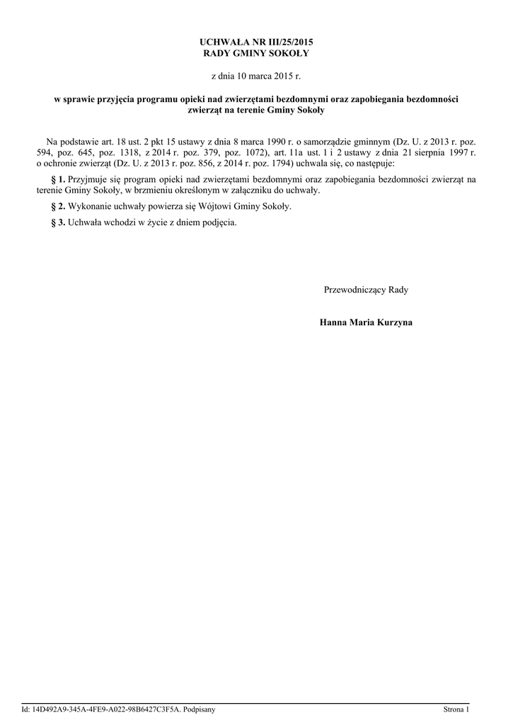 UCHWAŁA NR III/25/2015 RADY GMINY SOKOŁY z dnia 10 marca 2015 r. w sprawie przyjęcia programu opieki nad zwierzętami bezdomnymi oraz zapobiegania bezdomności zwierząt na terenie Gminy Sokoły Na podstawie art. 18 ust. 2 pkt 15 ustawy z dnia 8 marca 1990 r. o samorządzie gminnym (Dz. U. z 2013 r. poz. 594, poz. 645, poz. 1318, z 2014 r. poz. 379, poz. 1072), art. 11a ust. 1 i 2 ustawy z dnia 21 sierpnia 1997 r. o ochronie zwierząt (Dz. U. z 2013 r. poz. 856, z 2014 r. poz. 1794) uchwala się, co następuje: § 1. Przyjmuje się program opieki nad zwierzętami bezdomnymi oraz zapobiegania bezdomności zwierząt na terenie Gminy Sokoły, w brzmieniu określonym w załączniku do uchwały. § 2. Wykonanie uchwały powierza się Wójtowi Gminy Sokoły. § 3. Uchwała wchodzi w życie z dniem podjęcia. Przewodniczący Rady Hanna Maria Kurzyna Id: 14D492A9-345A-4FE9-A022-98B6427C3F5A. Podpisany Strona 1 Załącznik do Uchwały Nr III/25/2015 Rady Gminy Sokoły z dnia 10 marca 2015 r. § 1. Celem Programu jest: 1) zapewnienie opieki nad zwierzętami bezdomnymi w rozumieniu art. 4 pkt 17 ustawy o ochronie zwierząt; 2) zapobieganie bezdomności zwierząt. § 2. 1. Wykonawcami Programu są: 1) Wójt Gminy Sokoły za pośrednictwem Urzędu Gminy w Sokołach; 2) schronisko dla zwierząt w Kolnie, ul. Wesoła 12, 18-500 Kolno, woj. podlaskie; 3) organizacje społeczne, stowarzyszenia, fundacje, których statutowym celem działania jest przeciwdziałanie bezdomności zwierząt we współpracy z organami gminy; 2. Koordynatorem Programu jest Wójt Gminy Sokoły za pośrednictwem Urzędu Gminy w Sokołach. § 3. 1. Zapewnienie opieki bezdomnym zwierzętom realizują: 1) schroniska dla zwierząt na podstawie umowy podpisanej przez Gminę Sokoły z jednostką je prowadzącą; 2) Urząd Gminy w Sokołach poprzez wskazanie gospodarstwa rolnego, zapewniającego miejsca dla zwierząt gospodarskich; 3) organizacje pozarządowe poprzez realizację zadań publicznych, obejmujących opiekę nad zwierzętami bezdomnymi. 2. W przypadku braku miejsc w schronisku dla zwierząt, zwierzęta bezdomne, o których mowa w ust. 1 powinny być umieszczone w innych schroniskach na podstawie umowy gminy z jednostkami je prowadzącymi. § 4. Sprawowanie opieki nad kotami wolno żyjącymi realizowane będzie poprzez: 1) ustalenie miejsc (w tym obiektów budowlanych) w których przebywają koty wolnożyjące; 2) zapewnienie dokarmiania oraz zapewnienie im wody pitnej w miejscach ich przebywania; 3) w miarę możliwości zapewnienie miejsca schronienia, w szczególności na okres zimowy; 4) powierzenie realizacji w/w zadań jednostkom pomocniczym gminy oraz współdziałanie z organizacjami społecznymi. § 5. Poszukiwanie nowych właścicieli dla bezdomnych zwierząt realizowane jest poprzez: 1) informowanie o możliwości adopcji zwierząt bezdomnych w sposób zwyczajowo przyjęty na terenie Gminy Sokoły, w tym na stronach internetowych; 2) współpracę z mieszkańcami oraz organizacjami społecznymi. § 6. 1. Na terenie Gminy Sokoły wprowadza się odławianie bezdomnych zwierząt: 1) stałe na interwencje; 2) okresowe po wcześniejszym ogłoszeniu. 2. Odławianiem bezdomnych zwierząt z terenu Gminy Sokoły objęte będą zwierzęta pozostawione bez opieki, w stosunku do których nie istnieje możliwość ustalenia ich właściciela lub innej osoby, pod której opieką dotychczas pozostawały, a w szczególności chore lub zagrażające życiu, zdrowiu i bezpieczeństwu. 3. Odławianie bezdomnych zwierząt będzie prowadzone wyłącznie przy użyciu specjalistycznego sprzętu przeznaczonego do wyłapywania zwierząt, który nie stwarza zagrożenia dla życia i zdrowia zwierząt, a także nie będzie zadawał im cierpienia. Id: 14D492A9-345A-4FE9-A022-98B6427C3F5A. Podpisany Strona 1 4. Transport zwierząt bezdomnych będzie odbywał się środkiem transportu przystosowanym do bezpiecznego i humanitarnego przewozu zwierząt. 5. Informacje o akcji odławiania bezdomnych zwierząt podawane są do publicznej wiadomości poprzez ogłoszenia na tablicy ogłoszeń Urzędu Gminy Sokoły, na stronie biuletynu informacji publicznej Urzędu Gminy Sokoły oraz za pośrednictwem sołtysów. 6. Celem zapewnienia dalszej opieki nad bezdomnymi zwierzętami Wójt Gminy Sokoły podpisuje umowę z podmiotem prowadzącym działalność w tym zakresie, którego adres podaje na tablicy ogłoszeń Urzędu Gminy Sokoły oraz na stronie biuletynu informacji publicznej Urzędu Gminy. § 7. 1. Ograniczenie populacji bezdomnych zwierząt realizowane będzie poprzez sterylizację albo kastrację zwierząt w schronisku na zasadach ustalonych z jednostką prowadzącą schronisko. 2. Zabiegi sterylizacji i kastracji mogą być przeprowadzane wyłącznie przez lekarza weterynarii. 3. Zabiegom, o których mowa w ust. 1, nie podlegają zwierzęta w okresie 14 dni od umieszczenia w schronisku, z uwagi na możliwość zgłoszenia się właściciela lub opiekuna, oraz przeznaczone do adopcji w terminie określonym w ogłoszeniu o poszukiwaniu nowych właścicieli. § 8. 1. Usypianie ślepych miotów zwierząt może nastąpić wyłącznie przez lekarza weterynarii w schronisku dla zwierząt bezdomnych oraz w lecznicy dla zwierząt. 2. Fakt i przyczynę uśpienia ślepych miotów odnotowuje się w ewidencji prowadzonej przez Urząd Gminy w Sokołach. 3. Zwierzę usypiane musi być do ostatniej chwili życia traktowane łagodnie i przyjaźnie. Należy zaoszczędzić mu trwogi i dodatkowych udręczeń. Sam zabieg uśpienia powinien być wykonany przez lekarza weterynarii w sposób humanitarny. 4. Zwłoki uśpionych zwierząt muszą być odpowiednio zabezpieczone do czasu zabrania ich przez odpowiednie służby do tego przeznaczone. § 9. Do zapewnienia całodobowej opieki weterynaryjnej dla zwierząt wolnożyjących i bezdomnych poszkodowanych w skutek zdarzeń drogowych, wyznacza się firmę Kompleksowe Usługi Weterynaryjne Wojciech Pilawski, ul. Brańska