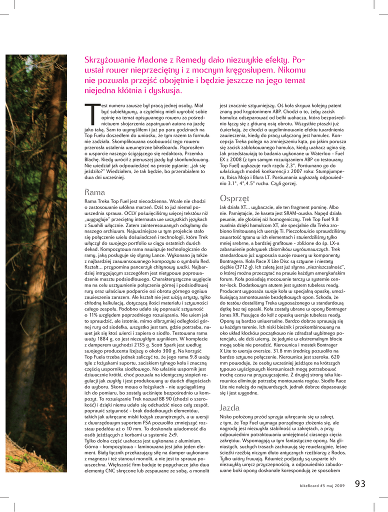 Skrzyżowanie Madone z Remedy dało niezwykłe efekty. Powstał rower nieprzeciętny i z mocnym kręgosłupem. Nikomu nie pozwala przejść obojętnie i będzie jeszcze na jego temat niejedna kłótnia i dyskusja. T est numeru zawsze był pracą jednej osoby. Miał być subiektywny, a czytelnicy mieli wyrobić sobie opinię na temat opisywanego roweru za pośrednictwem skojarzenia zapatrywań autora na jazdę jako taką. Sam to wymyśliłem i już po paru godzinach na Top Fuelu doszedłem do wniosku, że tym razem ta formuła nie zadziała. Skomplikowana osobowość tego roweru przerosła ustalenia wewnętrzne bikeBoardu. Poprosiłem o wsparcie naszego ścigającego się redaktora, Przemka Blachę. Kiedy wrócił z pierwszej jazdy był skonfundowany. Nie wiedział jak odpowiedzieć na proste pytanie: „jak się jeździło?” Wiedziałem, że tak będzie, bo przerabiałem to dwa dni wcześniej. Rama Rama Treka Top Fuel jest niecodzienna. Wcale nie chodzi o zastosowanie włókna marzeń. Dziś to już niemal powszednia sprawa. OCLV poświęciliśmy więcej tekstów niż „wygugluje” przeciętny internauta we wszystkich językach z Swahili włącznie. Zatem zainteresowanych odsyłamy do naszego archiwum. Najważniejsze w tym projekcie stało się połączenie wielu doświadczeń i technologii, które Trek włączył do swojego portfolio w ciągu ostatnich dwóch dekad. Kompozytowa rama nawiązuje technologicznie do ramy, jaką posługuje się słynny Lance. Wykonano ją także z najbardziej zaawansowanego kompozytu o symbolu Red. Kształt... przypomina pancerzyk chitynowy ważki. Najbardziej intrygującym szczegółem jest nietypowe poprowadzenie masztu podsiodłowego. Charakterystyczne wygięcie ma na celu usztywnienie połączenia górnej i podsiodłowej rury oraz właściwe podparcie osi obrotu górnego ogniwa zawieszenia zarazem. Ale kształt nie jest wizją artysty, tylko chłodną kalkulacją, dotyczącą ilości materiału i sztywności całego zespołu. Podobno udało się poprawić sztywność o 11% względem poprzedniego rozwiązania. Nie wiem jak to sprawdzić, ale istotnie, mimo olbrzymiej odległości górnej rury od siodełka, wszystko jest tam, gdzie potrzeba, nawet jak się ktoś wierci i zapiera o siodło. Testowana rama waży 1884 g, co jest niezwykłym wynikiem. W komplecie z damperem wychodzi 2135 g. Scott Spark jest według swojego producenta lżejszy o około 300 g. Na korzyść Top Fuela trzeba jednak zaliczyć to, że jego rama 9.8 waży tyle z łożyskami suportu, zaciskiem tylnego koła i znaczną częścią wspornika siodłowego. No właśnie wspornik jest dziwacznie krótki, choć pozwala na identyczny stopień regulacji jak zwykły i jest produkowany w dwóch długościach do wyboru. Skoro mowa o łożyskach - nie wyciągaliśmy ich do pomiaru, bo zostały wciśnięte bezpośrednio w kompozyt. To rozwiązanie Trek nazwał BB 90 (chodzi o szerokość) i dzięki niemu udało się odchudzić nieco cały zespół, poprawić sztywność - brak dodatkowych elementów, takich jak wkręcane miski łożysk zewnętrznych, a w wersji z dwurzędowym suportem FSA pozwoliło zmniejszyć rozstaw pedałów aż o 10 mm. To doskonała wiadomość dla osób jeżdżących z korbami w systemie 2x9. Tylko dolna część wahacza jest wykonana z aluminium. Górna - kompozytowa - laminowana jest jako jeden element. Biały łącznik przekazujący siłę na damper wykonano z magnezu i też stanowi monolit, a nie jest to sprawa powszechna. Większość firm buduje te popychacze jako dwa elementy CNC skręcone lub zespawane ze sobą, a monolit jest znacznie sztywniejszy. Oś koła skrywa kolejny patent znany pod kryptonimem ABP. Chodzi o to, żeby zacisk hamulca odseparować od belki wahacza, która bezpośrednio łączy się z główną osią obrotu. Wszystkie ptaszki już ćwierkają, że chodzi o wyeliminowanie efektu twardnienia zawieszenia, kiedy do pracy włączony jest hamulec. Koncepcja Treka polega na zmniejszeniu kąta, po jakim porusza się zacisk zablokowanego hamulca, kiedy wahacz ugina się. Jak przedstawiają to badania wykonane w Waterloo - Fuel EX z 2008 (z tym samym rozwiązaniem ABP co testowany Top Fuel) wykazuje ruch rzędu 2,3°. Porównano go do właściwych modeli konkurencji z 2007 roku: Stumpjumpera, Ibisa Mojo i Blura LT. Porównania wykazały odpowiednio 3.1°, 4°,4.5° ruchu. Czyli gorzej. Osprzęt Jak działa XT... wybaczcie, ale ten fragment pominę. Albo nie. Pamiętajcie, że kaseta jest SRAM-owska. Napęd działa pewnie, ale głośniej niż homogeniczny. Trek Top Fuel 9.8 zwalnia dzięki hamulcom XT, ale specjalnie dla Treka zrobiono limitowaną ich wersję Ti. Pieczołowicie sprawdziliśmy zawartość tytanu w ich elementach i stwierdziliśmy tylko mniej srebrne, a bardziej grafitowe - zbliżone do śp. LX-a zabarwienie pokrywek zbiorników wyrównawczych. Trek standardowo już wyposaża swoje rowery w komponenty Bontragera. Koła Race X Lite Disc są sztywne i niestety ciężkie (3712 g). Ich zaletą jest już słynna „niezniszczalność”, o której można przeczytać na prawie każdym amerykańskim forum. Koła posiadają mocowanie tarczy w systemie center-lock. Dodatkowym atutem jest system tubeless ready. Producent wyposaża swoje koła w specjalną opaskę, umożliwiającą zamontowanie bezdętkowych opon. Szkoda, że do testów dostaliśmy Treka wyposażonego w standardową dętkę bez tej opaski. Koła zostały ubrane w opony Bontrager Jones XR. Pasujące do kół z opaską wersje tubeless ready. Opony są bardzo uniwersalne. Bardzo dobrze sprawują się w każdym terenie. Ich niski bieżnik i przekombinowany na oko układ klocków początkowo nie zdradzał wybitnego potencjału, ale dziś wiemy, że jedynie w ekstremalnym błocie mogą sobie nie poradzić. Kierownica i mostek Bontrager X Lite to wersja oversize. 31.8 mm średnicy pozwoliło na bardzo sztywne połączenie. Kierownica jest szeroka. 620 mm powoduje, że osoby wcześniej jeż
