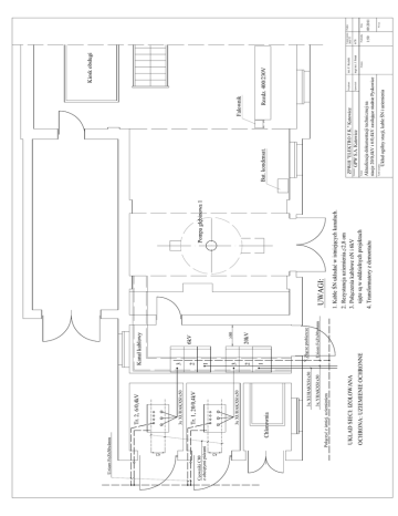 3x YHAKXS1x50 3x XUHAKXS1x50 3x XUHAKXS1x50 20kV >80 6kV Uziom FeZn30x4mm Złącze probiercze OCHRONA: UZIEMIENIE OCHRONNE UKŁAD SIECI: IZOLOWANA 1 2 3 1 2 Tr. 1, 20/0,4kV Połączyć z istniej. uziemieniem Ceowniki C80 z obciętymi piórami 3 Kanał kablowy 3x XUHAKXS1x50 Tr. 2, 6/0,4kV Chlorownia Uziom FeZn30x4mm 52 52 4. Transformatory z demontażu 2. Rezystancja uziemienia <2,8 om 3. Połączenia kablowe nN i 6kV ujęte są w oddzielnych projektach 1. Kable ŚN układać w istniejących kanałach. UWAGI: Pompa głębinowa 1 Sprawdził Projektant Układ ogólny stacji, kable ŚN i uziemienia Tytuł rysunku: Zmiany mgr inż. J. Smaś inż. F. Kuźnik Rozdz. 400/230V Aktualizacja dokumentacji technicznej na stacje 20/0,4kV i 6/0,4kV zasilające studnie Pyskowice Temat: ZPWiH "ELEKTRO F.K." Katowice GPW S.A. Katowice Inwestor: Bat. kondensat. Falownik Kiosk obsługi Uprawnienia 1:50 Podziałka 6/78 345/77 Nr rys. 09.2011 Data Podpis