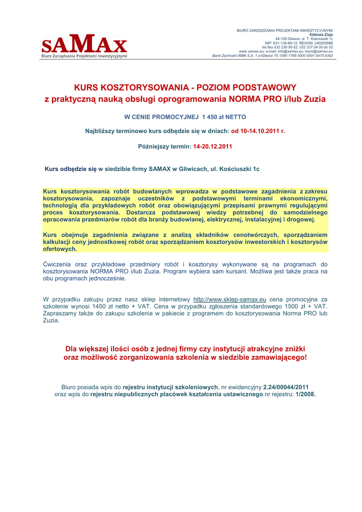 BIURO ZARZĄDZANIA PROJEKTAMI INWESTYCYJNYMI Elżbieta Ziaja 44-100 Gliwice, ul. T. Kościuszki 1c NIP: 631-136-68-12; REGON: 240250998 tel./fax 032 230 95 62, 032 337 04 00 do 02 www.samax.eu; e-mail: [email protected]; [email protected] Bank Zachodni WBK S.A. 1 o/Gliwice 75 1090 1766 0000 0001 0475 9392 KURS KOSZTORYSOWANIA - POZIOM PODSTAWOWY z praktyczną nauką obsługi oprogramowania NORMA PRO i/lub Zuzia W CENIE PROMOCYJNEJ 1 450 zł NETTO Najbliższy terminowo kurs odbędzie się w dniach: od 10-14.10.2011 r. Późniejszy termin: 14-20.12.2011 Kurs odbędzie się w siedzibie firmy SAMAX w Gliwicach, ul. Kościuszki 1c Kurs kosztorysowania robót budowlanych wprowadza w podstawowe zagadnienia z zakresu kosztorysowania, zapoznaje uczestników z podstawowymi terminami ekonomicznymi, technologią dla przykładowych robót oraz obowiązującymi przepisami prawnymi regulującymi proces kosztorysowania. Dostarcza podstawowej wiedzy potrzebnej do samodzielnego opracowania przedmiarów robót dla branży budowlanej, elektrycznej, instalacyjnej i drogowej. Kurs obejmuje zagadnienia związane z analizą składników cenotwórczych, sporządzaniem kalkulacji ceny jednostkowej robót oraz sporządzaniem kosztorysów inwestorskich i kosztorysów ofertowych. Ćwiczenia oraz przykładowe przedmiary robót i kosztorysy wykonywane są na programach do kosztorysowania NORMA PRO i/lub Zuzia. Program wybiera sam kursant. Możliwa jest także praca na obu programach jednocześnie. W przypadku zakupu przez nasz sklep internetowy http://www.sklep-samax.eu cena promocyjna za szkolenie wynosi 1450 zł netto + VAT. Cena w przypadku zgłoszenia standardowego 1500 zł + VAT. Zapraszamy także do zakupu szkolenia w pakiecie z programem do kosztorysowania Norma PRO lub Zuzia. Dla większej ilości osób z jednej firmy czy instytucji atrakcyjne zniżki oraz możliwość zorganizowania szkolenia w siedzibie zamawiającego! Biuro posiada wpis do rejestru instytucji szkoleniowych, nr ewidencyjny 2.24/00044/2011 oraz wpis do rejestru niepublicznych placówek kształcenia ustawicznego nr rejestru: 1/2008. CEL SZKOLENIA I PODSTAWOWE INFORMACJE NA TEMAT KURSU Głównym celem pięciodniowego kursu jest przygotowanie uczestników do samodzielnego opracowania kosztorysów, poznanie obsługi programów do kosztorysowania Norma Pro i/lub Zuzia. Kurs kosztorysowania robót budowlanych wprowadza w podstawowe zagadnienia z zakresu kosztorysowania, zapoznaje uczestników z podstawowymi terminami ekonomicznymi, technologią dla przykładowych robót, obowiązującymi przepisami prawnymi regulującymi proces kosztorysowania. Dostarcza podstawowej wiedzy potrzebnej do samodzielnego opracowania przedmiarów robót dla branży budowlanej, elektrycznej, instalacyjnych i mechanicznej. Kurs obejmuje zagadnienia związane z analizą składników cenotwórczych, sporządzaniem kalkulacji ceny jednostkowej robót oraz sporządzaniem kosztorysów inwestorskich i kosztorysów ofertowych. Przykładowe kosztorysy i ćwiczenia, które są wykonywane przez uczestników dostosowane są każdorazowo do indywidualnych potrzeb kursantów. Dzięki doświadczeniu prowadzącego wykonywane są ćwiczenia dla branży budowlanej, elektrycznej i instalacyjnej. Dla każdego przykładu omawiana jest technologia wykonania robót, użyte materiały oraz sposób opracowania przedmiaru robót i wycena danej roboty. W ramach kursu uczestnicy poznają obsługę programu do kosztorysowania Norma Pro i/lub Zuzia - do wyboru, na których opracowują pierwsze samodzielne kosztorysy. Ćwiczenia wykonywane pod okiem doświadczonego praktyka pozwolą uczestnikom prawidłowo sporządzić kosztorysy oraz nabyć umiejętności w zakresie obsługi oprogramowania i wykorzystać zawarte w programach funkcje dające możliwość m.in.: uzyskania wielostopniowego podziału kosztorysu, tworzenia pozycji scalonych oraz ich agregacji. Kurs przeznaczony jest dla osób zamierzających podjąć pracę w charakterze kosztorysanta robót budowlanych w przedsiębiorstwach budowlanych oraz w jednostkach budżetowych, a także dla osób zainteresowanych poszerzeniem wiedzy z zakresu kosztorysowania. PROWADZĄCY KURS mgr inż. Elżbieta Ziaja — Niezależny Inżynier Konsultant – posiada certyfikat Stowarzyszenia Inżynierów Doradców i Rzeczoznawców EFCA, FIDIC jest członkiem Międzynarodowej Federacji Inżynierów Konsultantów FIDIC / SIDIR, Rzeczoznawcą Kosztorysowym Stowarzyszenia Kosztorysantów Budowlanych, współautorką dokumentacji przetargowych dla realizacji inwestycji finansowanych z funduszy ISPA, Phare, Spójności oraz PO IiŚ. Posiada dyplom specjalisty ds. zarządzania produkcją i jakością, ukończyła studia podyplomowe na Politechnice Krakowskiej Wydział Inżynierii Lądowej kierunek Zarządzanie kosztami przedsięwzięcia budowlanego. Doświadczenie i praktykę zdobyła jako ekspert, członek zespołu Inżyniera kontraktu oraz Inżynier kosztów przy realizacji inwestycji finansowanych z funduszu Spójności według warunków kontraktowych FIDIC. Prowadzi zajęcia na Studiach Podyplomowych na Politechnice Śląskiej Wydział Ochrona Środowiska oraz Politechnice Krakowskiej na Wydziale Lądowym z zakresu przygotowania do realizacji i rozliczania inwestycji finansowanych z funduszy UE. Prowadzi biuro zarządzania projektami inwestycji budowlanych specjalizujące w przygotowaniu, zarządzaniu i rozliczaniu projektów finansowanych z funduszy UE. się PROGRAM KURSU KOSZTORYSOWANIE OD PODSTAW I. Część teoretyczna Podstawy przedmiarowania i kosztorysowania: 1. Przepisy prawne regulujące proces przedmiarowania i kosztorysowania 2. Definicje 3. Dokumenty opisujące przedmiot zamówienia • • • Dokumentacja projektowa Specyfikacja techniczna wykonania i odbioru robót Kody CPV 4. Przedmiar robót - dokumenty stanowiące podstawę opracowania 5. Zasady przedmiarowania 6. Elementy, układ i zawartość przedmiaru robót 7. Robota podstawowa w ujęciu brutto