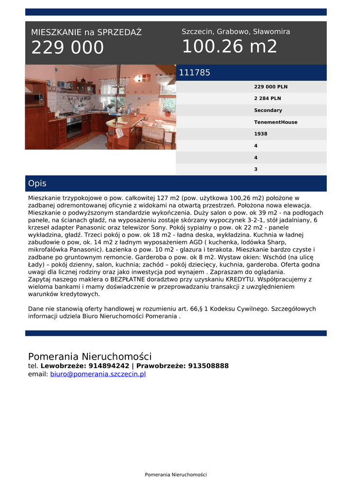 Szczecin, Grabowo, Sławomira MIESZKANIE na SPRZEDAŻ 100.26 m2 229 000 111785 229 000 PLN 2 284 PLN Secondary TenementHouse 1938 4 4 3 Opis Mieszkanie trzypokojowe o pow. całkowitej 127 m2 (pow. użytkowa 100,26 m2) położone w zadbanej odremontowanej oficynie z widokami na otwartą przestrzeń. Położona nowa elewacja. Mieszkanie o podwyższonym standardzie wykończenia. Duży salon o pow. ok 39 m2 - na podłogach panele, na ścianach gładź, na wyposażeniu zostaje skórzany wypoczynek 3-2-1, stół jadalniany, 6 krzeseł adapter Panasonic oraz telewizor Sony. Pokój sypialny o pow. ok 22 m2 - panele wykładzina, gładź. Trzeci pokój o pow. ok 18 m2 - ładna deska, wykładzina. Kuchnia w ładnej zabudowie o pow, ok. 14 m2 z ładnym wyposażeniem AGD ( kuchenka, lodówka Sharp, mikrofalówka Panasonic). Łazienka o pow. 10 m2 - glazura i terakota. Mieszkanie bardzo czyste i zadbane po gruntownym remoncie. Garderoba o pow. ok 8 m2. Wystaw okien: Wschód (na ulicę Łady) – pokój dzienny, salon, kuchnia; zachód – pokój dziecięcy, kuchnia, garderoba. Oferta godna uwagi dla licznej rodziny oraz jako inwestycja pod wynajem . Zapraszam do oglądania. Zapytaj naszego maklera o BEZPŁATNE doradztwo przy uzyskaniu KREDYTU. Współpracujemy z wieloma bankami i mamy doświadczenie w przeprowadzaniu transakcji z uwzględnieniem warunków kredytowych. Dane nie stanowią oferty handlowej w rozumieniu art. 66,§ 1 Kodeksu Cywilnego. Szczegółowych informacji udziela Biuro Nieruchomości Pomerania . Pomerania Nieruchomości tel. Lewobrzeże: 914894242 | Prawobrzeże: 913508888 email: [email protected] Pomerania Nieruchomości Powered by TCPDF (www.tcpdf.org)
