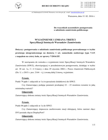 BIURO OCHRONY RZĄDU Tel. Tel. Tel. Fax (+48 22) 606 50 00 (+48 22) 606 51 01 (+48 22) 606 51 36 (+48 22) 606 51 40 ul. Podchorążych 38, 00-463 Warszawa, www.bor.gov.pl, e-mail: [email protected] Warszawa, dnia 15. 02. 2016 r. Do wszystkich uczestników postępowania o udzielenie zamówienia publicznego WYJAŚNIENIE I ZMIANA TREŚCI Specyfikacji Istotnych Warunków Zamówienia Dotyczy: postępowania o udzielenie zamówienia publicznego prowadzonego w trybie przetargu nieograniczonego na dostawę 1 szt. samochodu osobowego typu VAN z napędem na cztery koła, nr sprawy 7/2016/ZP. W nawiązaniu do wniosku o wyjaśnienie treści Specyfikacji Istotnych Warunków Zamówienia (SIWZ), obowiązującej w przedmiotowym postępowaniu, działając w trybie art. 38 ust. 1a, 2 i 4 Ustawy z dnia 29 stycznia 2004 r. Prawo Zamówień Publicznych (Dz. U. z 2015 r. poz. 2164 – t.j.) zwaną dalej Ustawą, wyjaśniam: Pytanie Punkt 79 ppkt 1 załącznik nr 1a (wyposażenie dodatkowe) do SIWZ: Czy Zamawiający podając parametr przekątnej 22 – 23 monitora rozumie to jaką minimalną wartość? Odpowiedź: Zamawiający dokona zmiany treści Specyfikacji Istotnych Warunków Zamówienia. Pytanie Punkt 80 ppkt 2 załącznik nr 1a do SIWZ: Czy Zamawiający dopuszcza zaoferowanie stacji dokującej, która zamiast złącz DVI posiada złącza DisplayPort? Odpowiedź: Zamawiający dokona zmiany treści Specyfikacji Istotnych Warunków Zamówienia. 1/3 W związku z powyższym działając w trybie art. 38 ust. 4 oraz 4a ppkt 1 Ustawy, Zamawiający zmienia treść SIWZ w nw. zakresie: Zmiana treści Specyfikacji Istotnych Warunków Zamówienia. Rozdział 10. OPIS SPOSOBU PRZYGOTOWANIA OFERTY. „10. Na kopercie należy umieścić adres Zamawiającego, a poniżej napis: OFERTA „NA DOSTAWĘ SAMOCHODU OSOBOWEGO TYPU VAN Z NAPĘDEM NA CZTERY KOŁA” NR SPRAWY 7/2016/ZP „NIE OTWIERAĆ” przed 22.02.2016 r. godz. 11:30 Konsekwencje złożenia oferty w kopercie oznaczonej w inny sposób ponosi Wykonawca (np. potraktowanie tej przesyłki jako zwykłej korespondencji i jej otwarcie)” Rozdział 11. MIEJSCE ORAZ TERMIN SKŁADANIA I OTWARCIA OFERT. „1. Ofertę należy złożyć w siedzibie Zamawiającego Biuro Ochrony Rządu, ul. Podchorążych 38, 00 – 463 Warszawa, w „kancelarii ogólnej” bud. 1 część B pokój 7 nie później niż do dnia 22. 02. 2016 r. godz. 11:00 (kancelaria czynna w dni robocze od poniedziałku do piątku w godz. 8. 15 - 16. 15).” „3. Otwarcie ofert nastąpi komisyjnie w obiekcie Zamawiającego: ul. Podchorążych 32, 00 - 463 Warszawa w dniu 22. 02. 2016 r. godz. 11:30, w pokoju nr 136.” Załącznik nr 1a do SIWZ PARAMETRY TECHNICZNE SAMOCHODU OSOBOWEGO TYPU VAN Z NAPĘDEM NA CZTERY KOŁA – w nw. punktach otrzymuje brzmienie: 56 Wykonawca zainstaluje w części operatorskiej dwa komfortowe fotele przeznaczone dla operatorów urządzeń pomiarowych uwzględniając poniższe wymagania: 1) fotele będą spełniały normy bezpieczeństwa umożliwiające przewożenie pasażera; 2) fotele będą posiadały 2 składane podłokietniki oraz regulowane pochylenie oparcia; 3) fotele będą posiadały zagłówek; 4) fotele będą posiadały regulację położenia fotela wzdłuż osi podłużnej stacji. √ Wpisać TAK (gdy spełnia) lub NIE (gdy nie spełnia wymagań SIWZ) 2/3 79 80 W części operatorskiej Wykonawca zamontuje: komputer przenośny o parametrach nie gorszych niż: 1) czterordzeniowy procesor Intel®Core™i 7; 2) Windows 10 (64-bitowy), wersja polska; 3) pakiet Microsoft Office; 4) wyświetlacz 17”-18” o rozdzielczości Ultra HD 4K (3840x 2160); 5) pamięć RAM 8 GB; 6) dysk twardy 1TB; 7) NVIDIA®GeForce® GTX 960M; Wyposażenie dodatkowe: 1) monitor o przekątnej 23”-24” o rozdzielczości Ultra HD 4K (3840x2160); - wyposażony w porty HDMI i DisplayPort lub DVI; - monitor ma być zamontowany na wprost siedzenia operatora (lewe stanowisko operatorskie) oraz umożliwiać blokowanie go na dowolnej wysokości od podsufitki aż do blatu; 2) komputerową mysz przewodowa; 3) klawiatura przewodowa. Komputer wyposażony ma być w stację dokująca zawierającą zasilacz sieciowy oraz następujące gniazda/porty: 1) USB min. 4, (z czego przynajmniej jedno w standardzie USB 3.0); 2) DVI lub DisplayPort min. 2; 3) RJ-45 min. 1; 4) stereofoniczne gniazda słuchawki/mikrofon. √ Wpisać TAK (gdy spełnia) lub NIE (gdy nie spełnia wymagań SIWZ) √ Wpisać TAK (gdy spełnia) lub NIE (gdy nie spełnia wymagań SIWZ) Przedmiotowe wyjaśnienie treści SIWZ jest wiążące i należy je uwzględnić w składanej ofercie. 3/3
