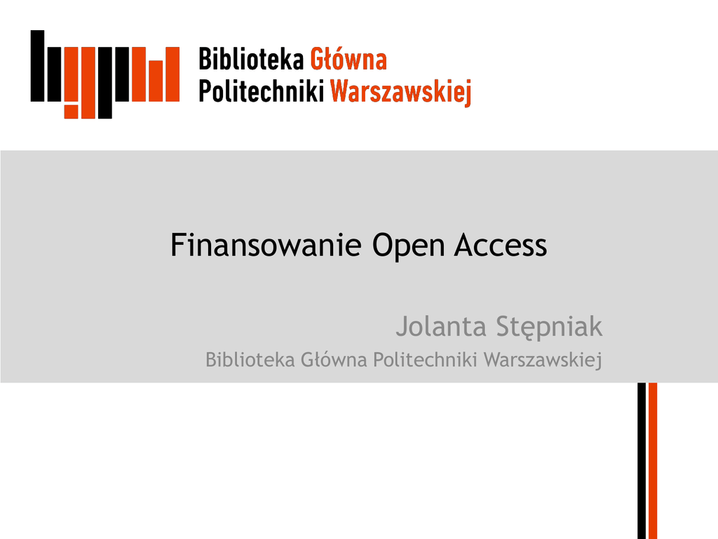 Finansowanie Open Access Jolanta Stępniak Biblioteka Główna Politechniki Warszawskiej W skrócie Biznes model systemu komunikacji naukowej wczoraj i dziś Strategia a modele finansowania Koszty czasopism OA Źródła finansowania Perspektywy na przyszłość Wnioski 21-10-2013 J.Stępniak: Finansowanie Open Access. Open Access Week 2013 2 Biznes model systemu komunikacji naukowej Pracownik naukowy wykonuje prace badawcze za określone honorarium (za pracę, nie za artykuł) efektem jest publikacja (obowiązkowa, aby praca została zaliczona do dorobku) Wydawca komercyjny zleca innemu pracownikowi naukowemu wykonanie recenzji (zwykle bezpłatnie) inwestuje w redakcję tekstu i jego udostępnienie (koszty platformy elektronicznej, coraz rzadziej druku i transportu) Wydawca SPRZEDAJE innym pracownikom naukowym (instytucjom, bibliotekom) zredagowany tekst - bez wypłacania honorarium autorom – Biblioteki płacą np. koszty realizacji zamówienia na artykuł + koszty praw autorskich (funkcjonowanie organizacji zbiorowego zarządzania prawami autorskimi) Koszty publikacji dwukrotnie ponosi instytucja finansująca badania – raz ponosząc koszty badań, a drugi raz kupując u wydawcy wyniki własnych badań w formie publikacji 21-10-2013 J.Stępniak: Finansowanie Open Access. Open Access Week 2013 3 Czasopisma naukowe OPEN ACCESS Autor / instytucja finansuje publikację artykułu, bo to on jest zainteresowany w promocji i przekazywaniu wyników badań Wydawca nie pobiera za korzystanie z czasopisma żadnych opłat od czytelnika ani instytucji jaką on reprezentuje Użytkownik publikacji OPEN ACCESS może: czytać, pobierać wersję elektroniczną, kopiować, drukować, upowszechniać, łączyć linkami pełne teksty artykułów zamieszczanych w tych czasopismach – pod warunkiem informowania o źródle i uznania warunków licencji Creative Commons Czasopismo OA spełnia wszystkie warunki czasopisma naukowego, musi być w dostępne w wersji cyfrowej 21-10-2013 J.Stępniak: Finansowanie Open Access. Open Access Week 2013 4 Strategia – polityka wdrażania Instytucja prowadząca lub finansująca badania oraz organizacja promująca OA powinna określić strategie działania w formule OA: Model Green (repozytoria) lub Gold (na platformie wydawcy lub wskazanej przez wydawcę) – Warunki dla modelu Green: czas – okres, po którym powinny być udostępnione wyniki badań prowadzonych ze środków publicznych (okres embarga dla repozytoriów), warunki dla zachowania praw autorskich (honorarium dla autora) i warunki udzielanych licencji na udostępnianie (kopiowanie, modyfikowanie … np. odpowiedni poziom Creative Commons) Model i źródła finansowania 21-10-2013 J.Stępniak: Finansowanie Open Access. Open Access Week 2013 5 Modele finansowania czasopism OA APC – Article Processing Charge (płatne z grantu autora lub z wyodrębnionych na Uczelni funduszy na ten cel) Institutional membership scheme – przedpłaty instytucji na poczet planowanych publikacji własnych autorów Community publishing – głównie w obrębie jednej instytucji, większość prac wykonywana w ramach wolontariatu Czasopisma finansowane z reklam lub przez sponsorów Czasopisma finansowane z dodatkowych wpływów – Sprzedaż wersji drukowanej – Współpraca międzynarodowa (dla wąskich dziedzin) - np. SCOAP3 – Sponsoring Consortium for Open Access Publishing in Particle Physics 21-10-2013 J.Stępniak: Finansowanie Open Access. Open Access Week 2013 6 Wydawcy czasopism OA [1] Acta Palaeontologica Polonica (PAN) - IF = 1.577 – dofinansowanie MNiSzW – do 10 stron bezpłatnie, w tym czarno-białe ilustracje – odpłatnie: kolejne strony (każda 30 Euro), materiał ilustracyjny kolorowy 85 Euro sztuka – możliwość prenumeraty wersji drukowanej Richard van Noorden: The True Costs of Science Publishing. Nature 2013 vol 495 27 March 2013 s. 426-429) 21-10-2013 J.Stępniak: Finansowanie Open Access. Open Access Week 2013 7 Wydawcy czasopism OA [2] Hindawi Publishing Corporation – powstało w 1998 r. w Kairze (z siedzibą obecnie w USA), wydaje ponad 500 czasopism w modelu OA – Cennik koszt publikacji artykułu - bezpłatnie, $ 500-1000 – Możliwość prenumeraty wersji drukowanej (cennik) PeerJ i PeerJ PrePrints – model: life time publishing plan – – – – 1 artykuł rocznie - $ 99 (+ 40 po akceptacji tekstu) 2 artykuły - $ 199 (+40) nielimitowana liczba artykułów - $299 Scenariusz kosztów publikacji (1 rocznie , 2 rocznie) 21-10-2013 J.Stępniak: Finansowanie Open Access. Open Access Week 2013 8 Open Access - z dofinansowaniem Czasopisma sponsorowane przez prywatne fundacje (PLoS Public Library on Science 2003 r. – cennik $ 2.250-2.900) Lista krajów, z których autorzy nie płacą lub płacą 500 Czasopisma i archiwa sponsorowane przez agendy rządowe (PubMedCentral – 2000 r.) Wydawcy komercyjni - czasopisma niedochodowe (BioMedCentral - UK) 207 tytułów, poradnik jak przekształcić tytuł na open access eLife – wydawany od 2012 roku, tymczasem bezpłatny dla autorów (i subskrybentów), wydawany wspólnie przez 3 prestiżowe organizacje finansujące badania biomedyczne: – the Howard Hughes Medical Institute, – the Max Planck Society, – the Wellcome Trust 21-10-2013 J.Stępniak: Finansowanie Open Access. Open Access Week 2013 9 OA u wydawców komercyjnych – Publishers with Paid Option for OA –wg Sherpa/RoMEo Dominuje model hybrydowy (zwany double dipping) – czasopisma są prenumerowane – opłatę ponosi odbiorca – autor decyduje, czy chce opłacić OA (pełny dostęp natychmiast), – może publikować bez opłat, z prawem zamieszczenia w repozytorium po np. 12 miesiącach Pojedyncze tytuły w ofercie wydawcy są przekształcane w OA, podczas gdy inne pozostają w subskrypcji (ukryty model hybrydowy dla prenumeratorów) Obniżka cen dla krajów trzeciego świata 21-10-2013 J.Stępniak: Finansowanie Open Access. Open Access Week 2013 10 Koszt OA komercyjnych wydawcó