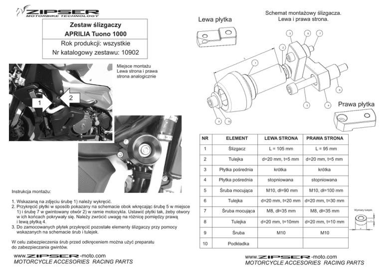 Zestaw œlizgaczy APRILIA Tuono 1000 Rok produkcji: wszystkie Nr katalogowy zestawu: 10902 Schemat monta¿owy œlizgacza. Lewa i prawa strona. Lewa p³ytka 3 8 7 2 L 1 Miejsce monta¿u Lewa strona i prawa strona analogicznie 6 2 5 9 4 Prawa p³ytka 10 NR ELEMENT LEWA STRONA PRAWA STRONA 1 Œlizgacz L = 105 mm L = 95 mm 2 Tulejka d=20 mm, t=5 mm d=20 mm, t=5 mm 3 P³ytka poœrednia krótka krótka 4 P³ytka poœrednia stopniowana stopniowana Instrukcja monta¿u: 5 Œruba mocuj¹ca 1. Wskazan¹ na zdjêciu œrubê 1) nale¿y wykrêciæ. 2. Przykrêciæ p³ytki w sposób pokazany na schemacie obok wkrêcaj¹c œrubê 5 w miejsce 1) i œrubê 7 w gwintowany otwór 2) w ramie motocykla. Ustawiæ p³ytki tak, ¿eby otwory w ich koñcach pokrywa³y siê. Nale¿y zwróciæ uwagê na ró¿nicê pomiêdzy praw¹ i lew¹ p³ytk¹ 4. 3. Do zamocowanych p³ytek przykrêciæ pozosta³e elementy œlizgaczy przy pomocy wskazanych na schemacie œrub i tulejek. 6 Tulejka W celu zabezpieczenia œrub przed odkrêceniem mo¿na u¿yæ preparatu do zabezpieczania gwintów. M10, d³=90 mm M10, d³=100 mm d=20 mm, t=20 mm d=20 mm, t=30 mm 7 Œruba mocuj¹ca M8, d³=35 mm M8, d³=35 mm 8 Tulejka d=20 mm, t=10mm d=20 mm, t=10 mm 9 Œruba M10 M10 10 Podk³adka Wymiary tulejek: t 1 d