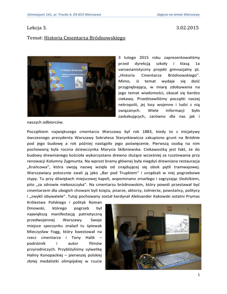Gimnazjum 141, ul. Trocka 4, 03-653 Warszawa Zajęcia na temat Warszawy Lekcja 3. 3.02.2015 Temat: Historia Cmentarza Bródnowskiego 3 lutego 2015 roku zaprezentowaliśmy przed dyrekcją szkoły i klasą 1a varsavianistyczny projekt gimnazjalny pt. „Historia Cmentarza Bródnowskiego”. Mimo, iż temat wydaje się dość przygnębiający, w miarę zdobywania na jego temat wiadomości, okazał się bardzo ciekawy. Przedstawiliśmy początki naszej nekropolii, jej losy wojenne i ludzi z nią związanych. Wiele informacji było zaskakujących, zarówno dla nas jak i naszych odbiorców. Początkiem największego cmentarza Warszawy był rok 1883, kiedy to z inicjatywy ówczesnego prezydenta Warszawy Sokratesa Starynkiewicza zakupiono grunt na Bródnie pod jego budowę a rok później nastąpiło jego poświęcenie. Pierwszą osobą na nim pochowaną była roczna dziewczynka Marysia Skibniewska. Ciekawostką jest fakt, że do budowy drewnianego kościoła wykorzystano drewno służące wcześniej za rusztowania przy renowacji Kolumny Zygmunta. Na wprost bramy głównej była niegdyś drewniana restauracja „Krańcowa”, która swoją nazwę wzięła od znajdującej się obok pętli tramwajowej. Warszawiacy potocznie zwali ją jako „Bar pod Trupkiem” i urządzali w niej pogrzebowe stypy. Tu przy dźwiękach miejscowej kapeli, wspominano zmarłego i zagryzając śledzikiem, pito „za zdrowie nieboszczyka”. Na cmentarzu bródnowskim, który powoli przestawał być cmentarzem dla ubogich chowani byli księża, pisarze, aktorzy, żołnierze, powstańcy, politycy i „zwykli obywatele”. Tutaj pochowany został kardynał Aleksander Kakowski ostatni Prymas Królestwa Polskiego i polityk Roman Dmowski, którego pogrzeb był największą manifestacją patriotyczną przedwojennej Warszawy. Swoje miejsce spoczynku znalazł tu śpiewak Mieczysław Fogg, który kwestował na rzecz cmentarza i Tony Halik – podróżnik i autor filmów przyrodniczych. Przybliżyliśmy sylwetkę Haliny Konopackiej – pierwszej polskiej złotej medalistki olimpijskiej w rzucie 1 Gimnazjum 141, ul. Trocka 4, 03-653 Warszawa Zajęcia na temat Warszawy dyskiem. Na cmentarzu w kwaterze 45 N pod murem, chowano po wojnie ofiary służb bezpieczeństwa. Tutaj w 1994 roku złożono szczątki trzynastu biskupów nubijskich, które trafiły tu po 40 latach spędzonych w magazynach Muzeum Narodowego. Szczątki odnaleziono w Faras (Sudan), podczas prac archeologicznych prowadzonych pod kierunkiem prof. Kazimierza Michałowskiego we wczesnochrześcijańskiej bazylice, która później została zalana przez sztucznie utworzone jezioro Nasera na Nilu. Cmentarz Bródnowski (Bródzieński) jest największy, gdyż pochowano tu około 1,6 ml ludzi. Niestety ewidencja dawniejszych pochówków jest niepełna, ponieważ rosyjscy żołnierze Armii Czerwonej po wyzwoleniu Pragi, stacjonując w budynkach zarządu cmentarza, używali ksiąg ewidencyjnych do podpałki i robienia skrętów. Tutaj pochowanych jest wiele rodzin cygańskich, których marmurowe nagrobki wyróżniają się kształtem i wielkością. Pierwotnie Cmentarz Bródnowski, który został ulokowany poza Warszawą, teraz wrósł w krajobraz i topografię miasta. Wokół niego powstały nowe osiedla Targówka i Bródna. Nasz projekt był zarówno dla nas jak i odbiorców bardzo dobrą lekcją historii. Grupa projektowa z klasy 2a: Magda Gorzkowska, Sandra Jeł, Karolina Radlińska, Mikołaj Wiszniewski. Aneta Głowienka 2