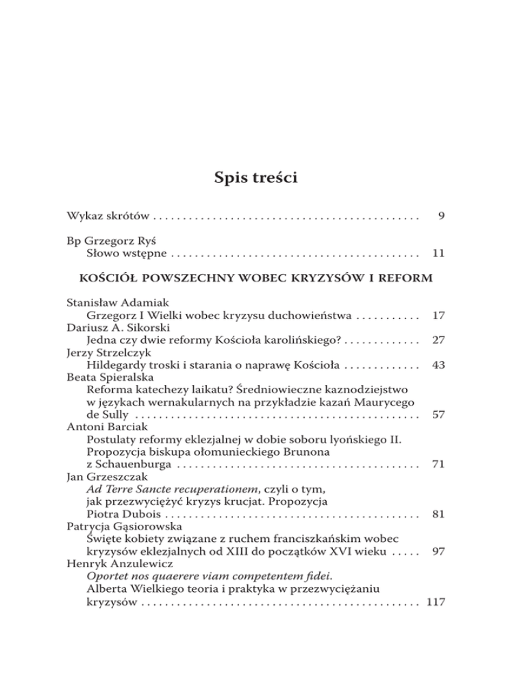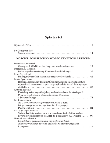 Spis treści Wykaz skrótów . . . . . . . . . . . . . . . . . . . . . . . . . . . . . . . . . . . . . . . . . . . . . . 9 Bp Grzegorz Ryś Słowo wstępne . . . . . . . . . . . . . . . . . . . . . . . . . . . . . . . . . . . . . . . . . . . 11 KOŚCIÓŁ POWSZECHNY WOBEC KRYZYSÓW I REFORM Stanisław Adamiak Grzegorz I Wielki wobec kryzysu duchowieństwa . . . . . . . . . . . 17 Dariusz A. Sikorski Jedna czy dwie reformy Kościoła karolińskiego? . . . . . . . . . . . . . . 27 Jerzy Strzelczyk Hildegardy troski i starania o naprawę Kościoła . . . . . . . . . . . . . . 43 Beata Spieralska Reforma katechezy laikatu? Średniowieczne kaznodziejstwo w językach wernakularnych na przykładzie kazań Maurycego de Sully . . . . . . . . . . . . . . . . . . . . . . . . . . . . . . . . . . . . . . . . . . . . . . . . . 57 Antoni Barciak Postulaty reformy eklezjalnej w dobie soboru lyońskiego II. Propozycja biskupa ołomunieckiego Brunona z Schauenburga . . . . . . . . . . . . . . . . . . . . . . . . . . . . . . . . . . . . . . . . . 71 Jan Grzeszczak Ad Terre Sancte recuperationem, czyli o tym, jak przezwyciężyć kryzys krucjat. Propozycja Piotra Dubois . . . . . . . . . . . . . . . . . . . . . . . . . . . . . . . . . . . . . . . . . . . . 81 Patrycja Gąsiorowska Święte kobiety związane z ruchem franciszkańskim wobec kryzysów eklezjalnych od XIII do początków XVI wieku . . . . . . 97 Henryk Anzulewicz Oportet nos quaerere viam competentem fidei. Alberta Wielkiego teoria i praktyka w przezwyciężaniu kryzysόw . . . . . . . . . . . . . . . . . . . . . . . . . . . . . . . . . . . . . . . . . . . . . . . . 117 Anna Waśko Reforma Kościoła i społeczeństwa chrześcijańskiego w Revelationes św. Brygidy szwedzkiej . . . . . . . . . . . . . . . . . . . . . Paweł F. Nowakowski Kryzys w kryzysie, czyli wewnętrzne problemy husytyzmu . . . . Adam Poznański Reakcja Kościoła na kryzys ortodoksji w średniowieczu. Piotra Zwickera traktat Cum dormirent homines . . . . . . . . . . . . Marek Daniel Kowalski Reformy skarbowości papieskiej na soborach w Konstancji i w Bazylei . . . . . . . . . . . . . . . . . . . . . . . . . . . . . . . . . . . . . . . . . . . . . . . Agnieszka Kijewska Mikołaj z Kuzy – filozof i reformator . . . . . . . . . . . . . . . . . . . . . . . 171 183 195 211 227 KOŚCIÓŁ LOKALNY WOBEC KRYZYSÓW I REFORM Jacek Zinkiewicz Wilhelm Zdobywca – reformator Kościoła anglosaskiego? . . . . Mieszko Maksymilian Grynicz Aktywność reformatorska arcybiskupa gnieźnieńskiego Jarosława z Bogorii na przykładzie jego działalności ustawodawczej . . . . . . . . . . . . . . . . . . . . . . . . . . . . . . . . . . . . . . . . . . . Tomasz Gałuszka OP Kryzys w diecezji krakowskiej w pierwszej połowie XIV wieku? Z badań nad Tractatus contra beghardos Henryka Harrera . . . . . . . . . . . . . . . . . . . . . . . . . . . . . . . . . . . . . . . . . Elżbieta Knapek Piotr Wysz wobec kryzysu Kościoła . . . . . . . . . . . . . . . . . . . . . . . . Bp Grzegorz Ryś Stanisław ze Skarbimierza o Kościele w dobie kryzysu . . . . . . . Krzysztof Ożóg Pierwsi Jagiellonowie wobec kryzysu Kościoła . . . . . . . . . . . . . . . Tomasz Graff Prałaci kapituły krakowskiej wobec kryzysu Kościoła w latach 1439–1449 . . . . . . . . . . . . . . . . . . . . . . . . . . . . . . . . . . . . . . Wojciech Świeboda Neofici w Polsce i na Litwie w dobie kryzysu Kościoła na przełomie XIV i XV wieku . . . . . . . . . . . . . . . . . . . . . . . . . . . . . . Elżbieta Piwowarczyk Mieszczanie krakowscy wobec kryzysu i reformy – wnioski badawcze w zakresie donacji na dzieła pobożne w piętnastowiecznym Krakowie . . . . . . . . . . . . . . . . . . . . . . . . . . . . 249 273 285 301 311 317 337 357 373 Beata Wojciechowska Refleksje o grzechu i pokucie w wybranych dziełach Jakuba z Paradyża (1381–1465), dotyczących reformy Kościoła . . . . . . Wiktor Szymborski Nadania odpustów w średniowiecznej Polsce – jako element przezwyciężania kryzysów w Kościele . . . . . . . . . . . . . . . . . . . . . . Leszek Zygner Późnośredniowieczne synody narzędziem reformy Kościoła . . . . . . . . . . . . . . . . . . . . . . . . . . . . . . . . . . . . . . . . . . . . . . . . Sylwia Konarska-Zimnicka „Nie szata zdobi człowieka”. Polskie statuty synodalne w walce o skromność ubioru duchownych . . . . . . . . . . . . . . . . . . . . . . . . . . 395 405 423 443 WSPÓLNOTY ZAKONNE WOBEC KRYZYSÓW I REFORM Marek Derwich Monachi semper reformandi. Kilka uwag o reformie i kryzysie w dziejach monastycyzmu średniowiecznego . . . . . . . . . . . . . . . . 467 Michał Tomasz Gronowski OSB Kluniackie metamorfozy: idea reformy, kryzys i odnowa (X–XII wiek) . . . . . . . . . . . . . . . . . . . . . . . . . . . . . . . . . . . . . . . . . . . . 471 Krzysztof Kaczmarek Kryzys życia zakonnego w późnym średniowieczu w świetle wykazów i ksiąg święceń . . . . . . . . . . . . . . . . . . . . . . . . . . . . . . . . . . 497 Anna Zajchowska Formatio – deformatio – reformatio. O reformie obserwanckiej Zakonu Braci Kaznodziejów w świetle traktatu De (de)formatione et reformatione Henryka Bitterfelda . . . . . . . . 507 Rafał Kubicki Próby reformy konwentu gdańskiego dominikanów na tle reformy innych klasztorów mendykanckich Prus Królewskich w XV wieku . . . . . . . . . . . . . . . . . . . . . . . . . . . . . 515