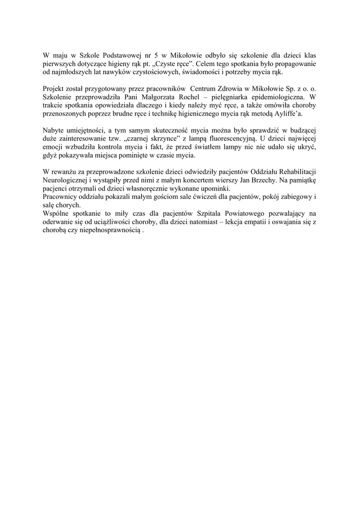 W maju w Szkole Podstawowej nr 5 w Mikołowie odbyło się szkolenie dla dzieci klas pierwszych dotyczące higieny rąk pt. „Czyste ręce”. Celem tego spotkania było propagowanie od najmłodszych lat nawyków czystościowych, świadomości i potrzeby mycia rąk. Projekt został przygotowany przez pracowników Centrum Zdrowia w Mikołowie Sp. z o. o. Szkolenie przeprowadziła Pani Małgorzata Rochel – pielęgniarka epidemiologiczna. W trakcie spotkania opowiedziała dlaczego i kiedy należy myć ręce, a także omówiła choroby przenoszonych poprzez brudne ręce i technikę higienicznego mycia rąk metodą Ayliffe’a. Nabyte umiejętności, a tym samym skuteczność mycia można było sprawdzić w budzącej duże zainteresowanie tzw. „czarnej skrzynce” z lampą fluorescencyjną. U dzieci najwięcej emocji wzbudziła kontrola mycia i fakt, że przed światłem lampy nic nie udało się ukryć, gdyż pokazywała miejsca pominięte w czasie mycia. W rewanżu za przeprowadzone szkolenie dzieci odwiedziły pacjentów Oddziału Rehabilitacji Neurologicznej i wystąpiły przed nimi z małym koncertem wierszy Jan Brzechy. Na pamiątkę pacjenci otrzymali od dzieci własnoręcznie wykonane upominki. Pracownicy oddziału pokazali małym gościom sale ćwiczeń dla pacjentów, pokój zabiegowy i salę chorych. Wspólne spotkanie to miły czas dla pacjentów Szpitala Powiatowego pozwalający na oderwanie się od uciążliwości choroby, dla dzieci natomiast – lekcja empatii i oswajania się z chorobą czy niepełnosprawnością .
