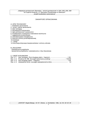 „Adaptacja pomieszczeń Starostwa - remont pomieszczeń nr 204, 205, 206, 208 na II piętrze budynku „A” Starostwa Powiatowego w Gliwicach” projekt budowlano-wykonawczy `ZAWARTOŚĆ OPRACOWANIA A. OPIS TECHNICZNY 1. Podstawa opracowania 2. Temat i zakres opracowania 3. Stan istniejący 4. Rozwiązanie funkcjonalne 5. Spis pomieszczeń i powierzchni 6. Projektowane rozwiązania materiałowo-techniczne 7. Zagadnienia konstrukcyjne 8. Charakterystyka energetyczna 9. Warunki ochrony przeciwpożarowej 10.Instalacje 11. Uwagi 12.Informacja dotycząca bezpieczeństwa i ochrony zdrowia B. ZAŁĄCZNIKI - Oświadczenia projektanta - Uprawnienia projektanta i zaświadczenia z Izby Zawodowej C. CZĘŚĆ RYSUNKOWA Rys. nr 1. Stan istniejący. Rzut drugiego piętra - fragment...........................................1:50 Rys. nr 2 Przekrój AA, BB. Szczegół wykonawczy podłogi ….....……………..........1:50/20 Rys. nr 3. Rzut drugiego piętra – fragment …………….................................................1:50 Rys. nr 4. Zestawienie drzwi, szczegół zabezpieczenia okna....................................... 1:2 „KONTUR” Bogda Matoga, 44-151 Gliwice, ul. Architektów 158b, tel .512 29 00 39 1 „Adaptacja pomieszczeń Starostwa - remont pomieszczeń nr 204, 205, 206, 208 na II piętrze budynku „A” Starostwa Powiatowego w Gliwicach” projekt budowlano-wykonawczy OPIS TECHNICZNY 1. Podstawa opracowania - umowa z Inwestorem - „Inwentaryzacja architektoniczno-budowlana budynku A, B i C” wykonana w październiku 2007r przez Atelier Urbanistyki-Architektury-Sztuki ul.Chopina 28/3, Gliwice - pomiary uzupełniające na miejscu - Ekspertyza przeciwpożarowa i ewakuacyjna z propozycją alternatywnych rozwiązań w trakcie przebudowy i remontu budynku Starostwa Powiatowego w Gliwicach przy ul.Zygmunta Starego 17 - postanowienie KW PSP nr 31/2010 2. Temat i zakres opracowania Tematem opracowania jest projekt remontu pomieszczeń nr 204, 205, 206, 208 na drugim piętrze w budynku „A” Starostwa Powiatowego w Gliwicach. Zakres opracowania – projekt budowlano-wykonawczy. Projekty instalacji stanowią odrębne opracowania. 3.Stan istniejący Budynek „A” wzniesiony jest w technologii tradycyjnej jako trzykondygnacyjny i całkowicie podpiwniczony. Ściany murowane z cegły pełnej, strop nad piwnicą ceglany, pozostałe stropy drewniane. Budynek z dachem płaskim, krytym papą. Dach docieplony wełną mineralną gr.15cm. Główne wejście prowadzi od strony ul. Zygmunta Starego dodatkowe wejście znajduje się na tyłach budynku. W budynku znajdują się dwie klatki schodowe. Budynek wyposażony jest w instalacje wod-kan, centralne ogrzewanie, instalację elektryczną i teletechniczną oraz indywidualne przewody wentylacji grawitacyjnej. 4. Rozwiązanie funkcjonalne Wydzielono zespół pomieszczeń połączonych wewnętrznym korytarzem oraz niezależny pokój dostępny bezpośrednio z korytarza głównego 5. Spis pomieszczeń i powierzchni Obmiary pomieszczeń wykonano zgodnie z (PN –ISO 9836:1997) lp nazwa pom. / nr pom. DRUGIE PIĘTRO 2 Pu m 1 POKÓJ NR 204 12,84 2 POKÓJ NR 205 13,91 3 POKÓJ NR 206 9,99 4 POKÓJ NR 207 11,20 5 POMIESZCZENIE NR 207a 4,55 6 POKÓJ NR 208 26,34 6. Projektowane rozwiązania materiałowo – techniczne „KONTUR” Bogda Matoga, 44-151 Gliwice, ul. Architektów 158b, tel .512 29 00 39 2 „Adaptacja pomieszczeń Starostwa - remont pomieszczeń nr 204, 205, 206, 208 na II piętrze budynku „A” Starostwa Powiatowego w Gliwicach” projekt budowlano-wykonawczy 6.1. Ścianki działowe : Ścianka EI30 - konstrukcja CW/UW75, obustronne pojedyncze poszycie płytą GKF gr.12,5mm i wypełnienie wełną mineralną gr.5cm np.Poltrem Uni (system Rigips nr 3.40.02). Całkowita grubość ścianki 10cm.Profie stalowe montować na taśmach wygłuszających. 6.2. Obudowy : - obudowa konstrukcji dachu drewnianego – konstrukcja CD 60 ultrastil, ES, podwójne poszycie płytą GKF gr.15mm (system Rigips nr 4.70.05) - kanały wentylacyjne obudować płytami gipsowo-kartonowymi GKF gr. 12,5 mm układanymi na ruszcie stalowym systemowym. Przed wykonaniem obudowy elementy konstrukcyjne dachu : krokwie, belki należy zabezpieczyć do granicy niezapalności (przez malowanie certyfikowanym środkiem ogniochronnym (np.Ogniochron, Fobos itp.) 6.3. Remont podłóg : Należy zdemontować istniejące warstwy podłogowe, odsłonić belki stropowe, usunąć ewentualną zasypkę. W przypadku stwierdzenia niezadawalającego stanu belek drewnianych należy skontaktować się z projektantem. Przestrzenie po usuniętej zasypce wypełnić wełną mineralna gr.10-15cm. Strop wypoziomować przez nadbicie na boki belek stropowych krawędziaków drewnianych 5x10cm. Dodatkowo krawędziaki mocować w poprzek pomiędzy belkami w rozstawie 60cm. Warstwę nośną wykonać z płyt OSB typ 3 (pióro i wpust) gr.2x18mm . Na płytach ułożyć warstwy wykończeniowe podłogi. Szczegółowy układ warstw opisany jest na rysunkach. Panele podłogowe klasy 33, AC5 gr.8-10mm, powierzchnia o strukturze drewna, baza HDF, warstwa ścieralna gr.6mm, warstwa spodnia z laminatu przeciwprężnego. 6.4. Drzwi : Drzwi płytowe, przylgowe, wypełnienie - płyta otworowa, wykończenie - okleina drewnopodobna. Ościeżnica drewniana, stała. Kolor drzwi ustalić z Inwestorem. Montaż drzwi w ściance drewnianej obejmuje : - skucie tynku - wycięcie deskowania - wykonanie ramy (ościeża) na wymiar projektowanej ościeżnicy z belek drewnianych (przyjęto belki 8x15) wymiar ościeża 100x205cm - osadzenie drzwi z ościeżnicą Drzwi wejściowe dostarcza Zamawiający. 6.5. Remont ścian Zakres prac obejmuje : skucie tynków słabych i odspojonych (ok.5m2), wypełnienie ubytków zaprawą wyrównującą. Usunięcie powłok malarskich, wykonanie gładzi gipsowej, zagruntowanie powierzchni i przyklejenie tapety z włókna szklanego typu flizelina. Ściany, sufit i obudowy należy zagruntować i malowa