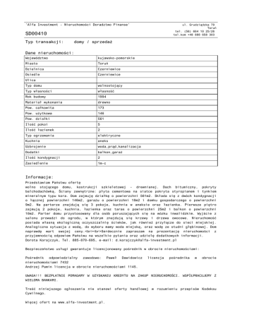 'Alfa Investment - Nieruchomości Doradztwo Finanse' ul. Grudziądzka 79 Toruń tel. (56) 664 10 25/26 tel.kom +48 888 658 303 SD00410 Typ transakcji: domy / sprzedaż Dane nieruchomości: Województwo kujawsko-pomorskie Miasto Toruń Dzielnica Czerniewice Osiedle Czerniewice Ulica Typ domu wolnostojący Typ własności własność Rok budowy 1994 Materiał wykonania drewno Pow. całkowita 173 Pow. użytkowa 146 Pow. działki 561 Ilość pokoi 5 Ilość łazienek 2 Typ ogrzewania elektryczne Kuchnia aneks Uzbrojenie woda,prąd,kanalizacja Dodatki balkon,garaż Ilość kondygnacji 2 Zasiedlenie 1m-c Informacje: Przedstawiam Państwu ofertę wolno stojącego domu, kostrukcji szkieletowej - drewnianej. Dach bitumiczny, pokryty balchodachówką. Ściany zewnętrzne: płyta cementowa na siatce pokryta styropianem i tynkiem mineralnym typu kora. Dom zajmuję działkę o powierzchni 561m2. Składa się z dwóch kondygnacji o łącznej powierzchni 146m2, garażu o powierzchni 18m2 i domku gospodarczego o powierzchni 9m2. Na parterze znajdują się 3 pokoje, kuchnia w aneksie oraz łazienka. Pierwsze piętro zajmują 2 pokoje, kuchnia, łazienka oraz taras o powierzchni 25m2 i balkon o powierzchni 10m2. Parter domu przystosowany dla osób poruszających się na wózku inwalidzkim. Wyjście z salonu prowadzi do ogrodu, w którym znajdują się krzewy i drzewa owocowe. Nieruchomość posiada własną ekologiczną oczyszczalnię ścieków, jak również przyłącze do sieci miejskiej. Analogiczna sytuacja z wodą, do wyboru mamy woda miejską, oraz wodę ze studni głębinowej. Dom naprawdę wart swojej ceny.<br><br>Serdecznie zapraszam na prezentację nieruchomości z przyjemnością odpowiem Państwu na wszelkie pytania oraz udzielę dodatkowych informacji. Dorota Korajczyk, Tel. 885-870-695, e-mail: [email protected] Bezpieczeństwo usługi gwarantuje licencjonowany pośrednik w obrocie nieruchomościami: Pośrednik odpowiedzialny zawodowo: Paweł Dawidowicz nieruchomościami 7432 Andrzej Pamin licencja w obrocie nieruchomościami 1145. licencja pośrednika w obrocie UWAGA!!! BEZPŁATNIE POMAGAMY W UZYSKANIU KREDYTU NA ZAKUP NIERUCHOMOŚCI. WSPÓŁPRACUJEMY Z WIELOMA BANKAMI. Treść niniejszego ogłoszenia nie stanowi oferty handlowej w rozumieniu przepisów Kodeksu Cywilnego. Więcej ofert na www.alfa-investment.pl. Zapraszamy! Cena: 560 000 PLN Dokument wygenerowany ze strony www.alfa-investment.pl Strona 2