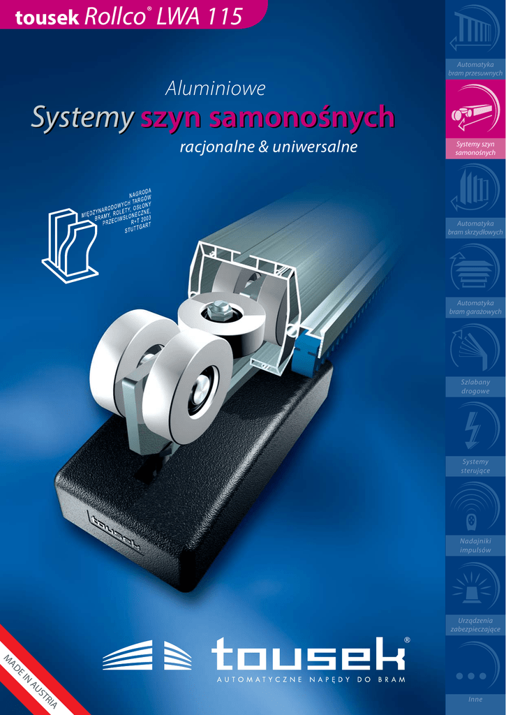 tousek Rollco® LWA 115 Automatyka bram przesuwnych Aluminiowe Systemy szyn samonośnych racjonalne & uniwersalne Systemy szyn samonośnych Automatyka bram skrzydłowych Automatyka bram garażowych Szlabany drogowe Systemy sterujące Nadajniki impulsów Urządzenia zabezpieczające E AD M IN IA R ST AU Inne tousek Rollco® LWA 115 Niewymagający konserwacji aluminiowy profil jezdny wa p ekstremalna cichobieżność p konstrukcja komórkowa p absolutna odporność na korozję p łatwy montaż 8 9 do wszystkich bram samonośnych przesuwnych o świetle wjazdu do 5,8 metra 0 q 7 w Cichobieżność Szyna jezdna wykonana z aluminium w połączeniu z masywnymi koziołkami i dużymi, łożysko wanymi rolkami poliamidowymi zapewnia absolutnie cichą i spokojną pracę. 7 4 6 Regulowany pochył wózka Wytrzymałość Technicznie nowatorska konstrukcja szyny umożliwia szybki oraz racjonalny montaż listwy zębatej i wyłączników krańcowych. Lekki i stabilny Komórkowa konstrukcja szyny Rollco® LWA 115 powoduje, że jest ona bardzo lekka i wytrzymała. Pomimo mniejszej ilości zastosowanego materiału w porównaniu do szyn stalowych zwiększona została wytrzyma łość na zginanie i udźwig. Kompatybilność System Rollco® LWA 115 jest optymalnie przystosowany do napędów bram przesuwnych serii tousek Pull. Oczywiście może być obsługiwany również ręcznie. 1 2 3 4 5 6 7 8 q aluminiowa szyna jezdna 2 wózki z estetycznymi osłonami płyta montażowa dla napędów przesuwnych tousek zaślepki z aluminium odbojnik gumowy rolka ze zderzakiem gumowym najazd aluminiowy prowadnik pionowy ze stali nierdzewnej 5 9 0 q w śruba naciągająca ze stali nierdzewnej najazd górny ze stali nierdzewnej śruby młotkowe ze stali nierdzewnej listwa zębata z tworzywa Masywnie wykonane wózki z dużymi, łożyskowanymi rolkami poliamidowymi zapewniają nawet przy maksymalnym obciążeniu cichobieżność i niezawodność przez wiele lat. 2 System tousek Rollco® LWA 115 134 mm 70 mm Komórkowa konstrukcja szyny umożliwia montaż bramy oraz listwy zębatej bez nawiercania, co z kolei pozwala na szczególnie racjonalne i szybkie prace montażowe. System tousek Rollco® LWA 115 realizuje kompletnie nowy koncept. Szyna jezdna z wysokiej jakości aluminium gwarantuje absolutną odporność na korozję i jest o ok. 2/3 lżejsza od szyny stalowej o podobnych parametrach. 4 3 w rowek dla śrub młotkowych mocujących konstrukcję bramy profil trapezowy dla wyłączników krańcowych 105 mm Racjonalność Zastosowanie aluminium i stali nierdzewnej gwarantuje absolutną odporność na korozję. 1 Brama przejeżdżając z jednej pozycji krańcowej w drugą, powoduje zmianę obciążenia profilu. Towarzyszy temu charakterystyczne opadnięcie profila w dół i związany z tym odgłos. Dzięki naszemu rozwiązaniu – nie dochodzi do tego efektu. Tym samym osiągamy cichobieżność i zmniejszone zużycie systemu. profil dla wsuwanej listwy zębatej z tworzywa 108 mm materiał Aluminium wymiary szyny 108/105 mm dł. szyny światło wjazdu 4.300mm max. 3.000mm powierzchnia naturalna 6.000mm max. 4.300mm udźwig 40 kg/mb 8.000mm max. 5.800mm częstotliwość pracy 50 cykli/dzień ciężar własny ok. 5kg/mb szczegółowe dane techniczne patrz informacja techniczna Uwaga wskazówka: Prosimy zwrócić uwagę, że przedstawione w tym prospekcie elementy bezpieczeństwa użyte przy bramie są jedynie przykładami i nie mogą być traktowane jako zalecenie zgodne z obowiązującą normą. Normy obowiązujące w danym państwie muszą być bezwzględnie przestrzegane zarówno przy uruchomieniu jak i montażu. www.tousek.com To co robimy, robimy dobrze Eduard Tousek PRODUKTY tousek Automatyka i bram przesuwnych i Automatyka i bram skrzydłowych i Automatyka i bram garażowych i Systemy i szyn samonośnych i Szlabany drogowe i Systemy sterujące i Nadajniki impulsów i Urządzenia i zabezpieczające i tousek Ges.m.b.H. headquarters A-1230 Wien, Zetschegasse 1 Tel: +43/ 1/ 667 36 01 Fax: +43/ 1/ 667 89 23 Email: [email protected] Już od ponad 40 lat specjalizujemy się w projektowaniu i produkcji wysokojakościowych napędów i akcesoriów do bram. Nasz sukces mówi sam za siebie: dzięki profesjonalnej kadrze, bogatej i innowacyjnej palecie produktowej oraz szerokiej ofercie serwisowej należymy dzisiaj do absolutnej międzynarodowej czołówki. tousek tousek drogowe napędy do bramszlabany przesuwnych atrakcyjne i niezawodne kompaktowe i niezawodne Jak pracujemy ? Niezmordowanie! Stale pracujemy nad powiększaniem technicznej przewagi produktów tousek poprzez nowe rozwiązania. Oprócz tego rygorystycznie przestrzegamy najwyższych standardów produkcji: najmniejsze możliwe tolerancje wykonania i ich stała kontrola są dla nas oczywiste. Jakość czarno na białym Wybierając produkt firmy tousek zarówno z programu napędów do bram, akcesoriów lub bezpieczeństwa zdecydowali się Państwo na najwyższą możliwą jakość. Fakt ten potwierdzamy naszym klientom także pisemnie - w formie certyfikatu jakości “Original tousek Qualität”. tousek napędy do bram przesuwnych kompaktowe i niezawodne Wszystko pasuje Nasza paleta produktów stale powiększa się, dlatego zwracamy szczególną uwagę na wzajemną kompatybilność wszystkich naszych produktów i systemów. tousek GmbH D-83395 Freilassing Traunsteiner Straße 12 Tel: +49/ 8654/ 77 66 - 0 Fax: +49/ 8654/ 57 196 Email: [email protected] tousek napędy do bram skrzydłowych eleganckie i bezpieczne tousek Gmbh CH-6275 Ballwil Bahnhofstraße 14 Tel: +41 41/448 29 65 Fax: +41 41/448 29 66 Email: [email protected] tousek program nadajników impulsów kompatybilne i niezawodne tousek Benelux NV B-3930 Hamont-Achel Buitenheide 2A / 1 Tel: +32 11 91 61 60 Fax: +32 11 91 61 60 Email: [email protected] tousek Sp. z o.o. PL-43-190 Mikołów (k/Katowic) Gliwicka 67 Tel: +48/ 32/ 738 53 65 Fax: +48/ 32/ 738 53 66 Email: [email protected] tousek s.r.o. CZ-130 00 Praha 3, Jag