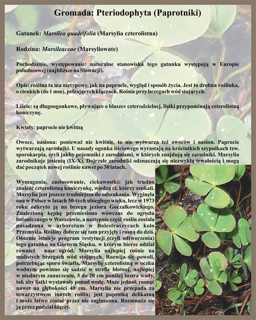 Gromada: Pteriodophyta (Paprotniki) Gatunek: Marsilea quadrifolia (Marsylia czterolistna) Rodzina: Marsileaceae (Marsyliowate) Pochodzenie, wystêpowanie: naturalne stanowiska tego gatunku wystêpuj¹ w Europie po³udniowej (najbli¿sze na S³owacji). Opis: roœlina ta ma nietypowy, jak na paprocie, wygl¹d i sposób ¿ycia. Jest to drobna roœlinka, o cienkich (do 1 mm), pe³zaj¹cych k³¹czach. Roœnie przy brzegach wód stoj¹cych. Liœcie: s¹ d³ugoogonkowe, p³ywaj¹ce o blaszce czterodzielnej, listki przypominaj¹ czterolistn¹ koniczynê. Kwiaty: paprocie nie kwitn¹ Owoce, nasiona: poniewa¿ nie kwitnie, to nie wytwarza te¿ owoców i nasion. Paprocie wytwarzaj¹ zarodniki. U nasady ogonka liœciowego wyrastaj¹ na króciutkich szypu³kach tzw. sporokarpia, czyli jakby pojemniki z zarodniami, w których znajduj¹ siê zarodniki. Marsylia zarodnikuje jesieni¹ (IX-X). Dojrza³e zarodniki odznaczaj¹ siê niezwyk³¹ trwa³oœci¹ i mog¹ daæ pocz¹tek nowej roœlinie nawet po 30 latach. Wymagania, zastosowanie, ciekawostki: jak trudno znaleŸæ czterolistn¹ koniczynkê, wiedz¹ ci, którzy szukali. Marsylia jest jeszcze trudniejsza do odszukania. Wyginê³a ona w Polsce w latach 50-tych ubieg³ego wieku, lecz w 1973 roku odkryto j¹ na brzegu jeziora Gocza³kowickiego. Znalezion¹ kêpkê przeniesiono wówczas do ogrodu botanicznego w Warszawie, a nastêpnie czêœæ roœlin zosta³a posadzona w arboretum w Bolestraszycach ko³o Przemyœla. Roœliny dobrze siê tam przyjê³y i rosn¹ do dziœ. Obecnie istnieje program restytucji (czyli odtworzenia) tego gatunku na Górnym Œl¹sku, w którym bierze udzia³ równie¿ nasz ogród. Marsylia najlepiej roœnie na mulistych brzegach wód stoj¹cych. Rozwija siê powoli, potrzebuj¹c sporo œwiat³a. Marsyliê czterolistn¹ w oczku wodnym powinno siê sadziæ w strefie b³otnej, najlepiej w niedu¿ym zanurzeniu, 5 do 20 cm poni¿ej lustra wody, tak aby listki wystawa³y ponad wodê. Mo¿e jednak rosn¹æ nawet na g³êbokoœci 40 cm. Marsylia nie przepada za towarzystwem innych roœlin; jest paprotk¹ delikatn¹ i mo¿e ³atwo zostaæ przez nie zag³uszona. Rozmna¿a siê j¹ przez podzia³ k³¹czy.